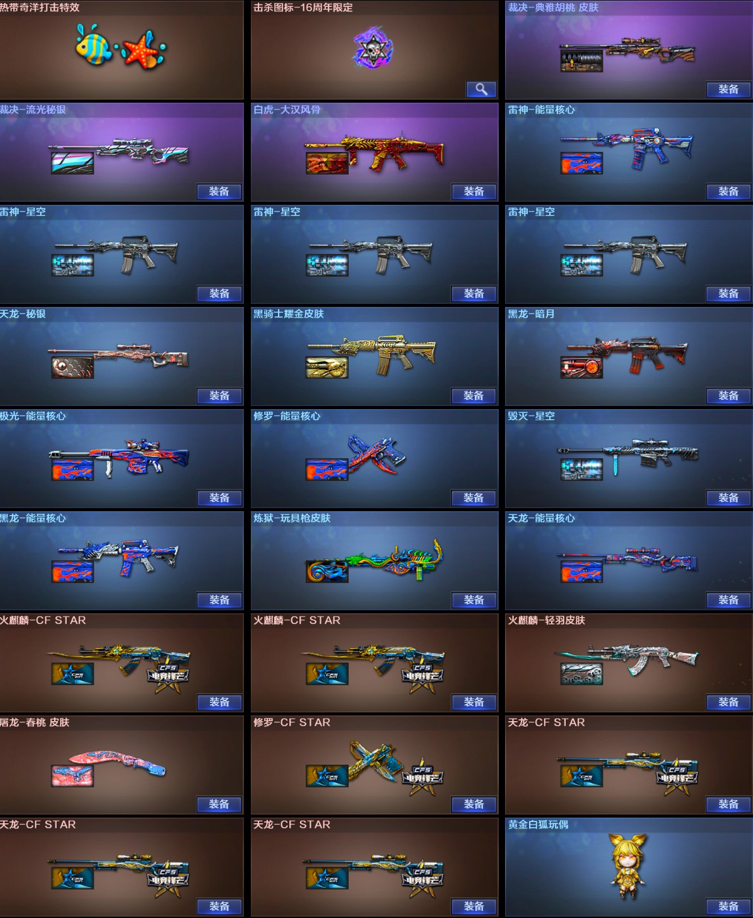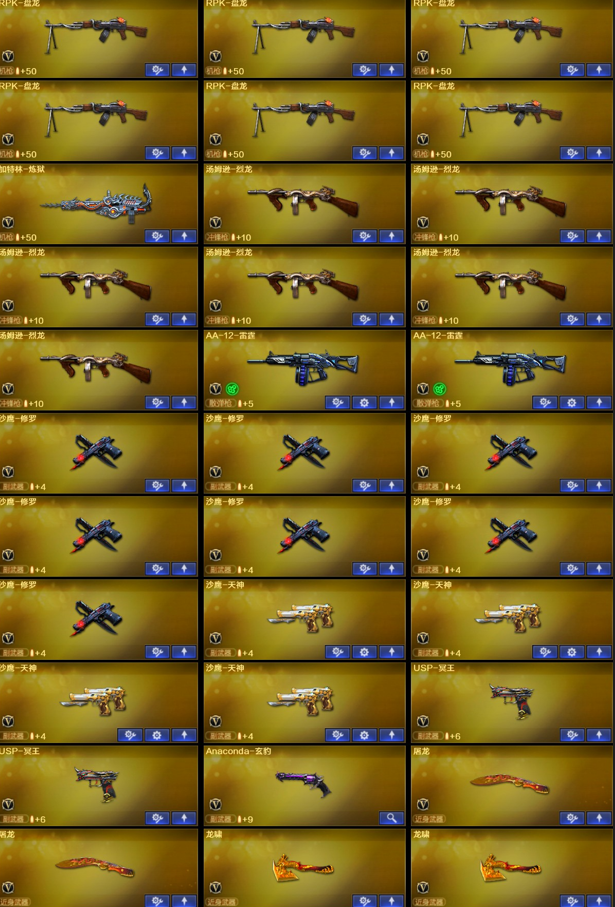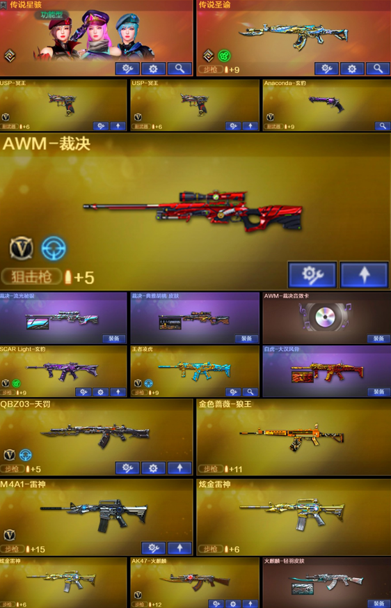 【稀有武器】:QBZ03-天罚/AK47-火麒麟(3)/M4A1-黑龙(6)/M4A1-雷神(2)/M4A1-黑骑士(10)/AK47-无影/AK47-黑武士/Barrett-毁灭(3)/Barrett-极光(5)/AWM-裁决/RPK-盘龙(6)/加特林-炼狱/汤姆逊-烈龙(6)/AA-12-雷霆(2) 【王者武器】:王者之心 【热门角色】:潘多拉 【热门音效卡】:AWM-裁决音效卡/QBZ03-天罚音效卡/Barrett-毁灭音效卡 【热门皮肤】:裁决-流光秘银/白虎-大汉风骨/屠龙-春桃皮肤;传说星骇,RPK-盘龙,传说圣谕,