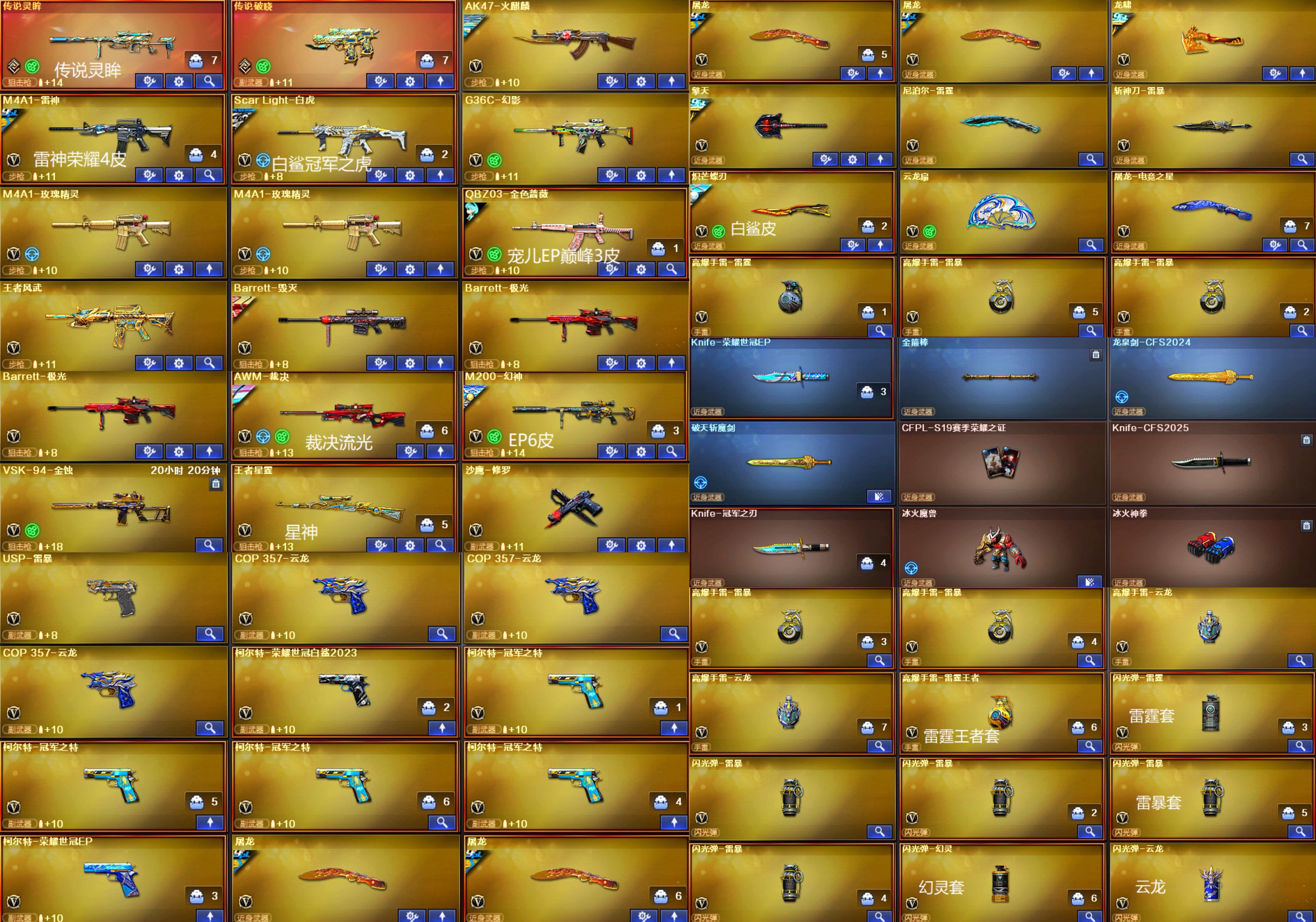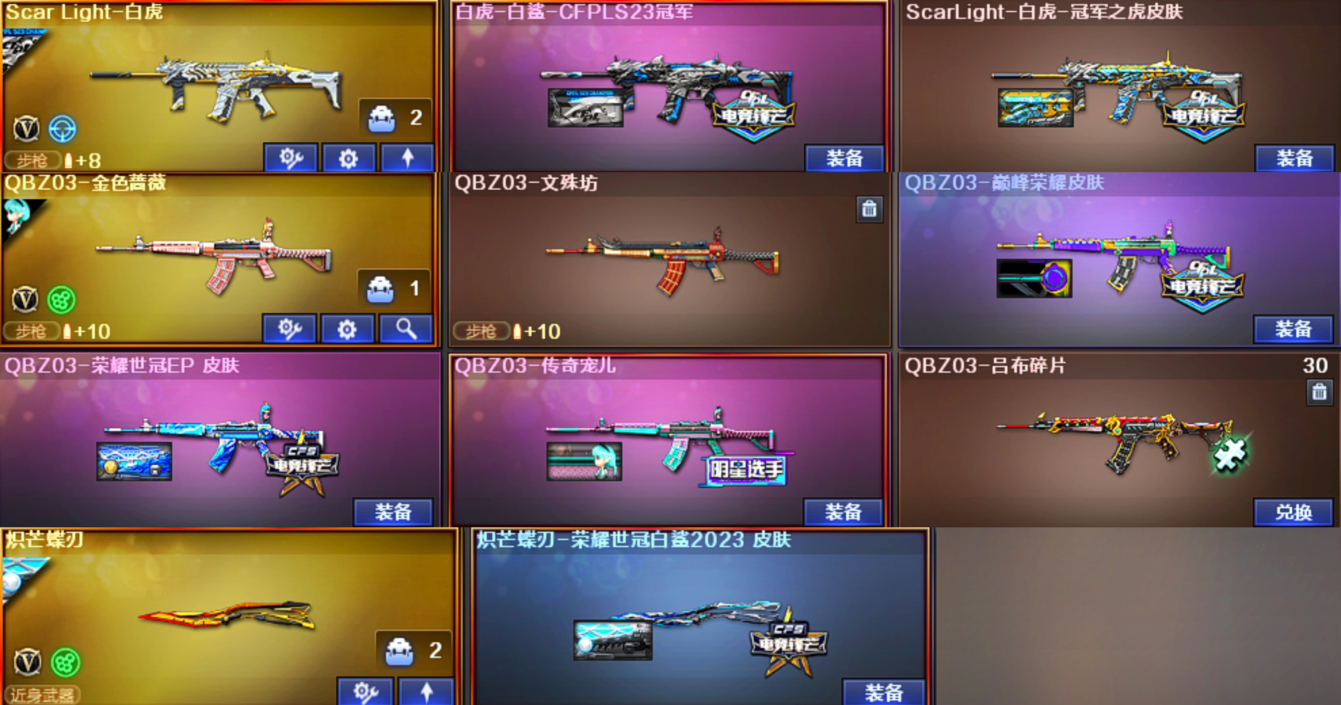 北部山东一区 传说灵眸破晓 幻神ep6皮 裁决流光秘银 星神王者星霆 G36C幻影 白虎白鲨冠军之虎 qbz宠儿ep巅峰荣耀 雷神荣耀之魄拼搏 炽芒蝶刃白鲨皮 USP雷暴 3云龙COP 4冠军之特 白鲨柯尔特 ep柯尔特 ep小刀 冠军之刃;USP-雷暴,柯尔特-荣耀世冠白鲨2023,柯尔特-冠军之特,炽芒蝶刃,Knife-冠军之刃,妮妮,QBZ03-金色蔷薇,