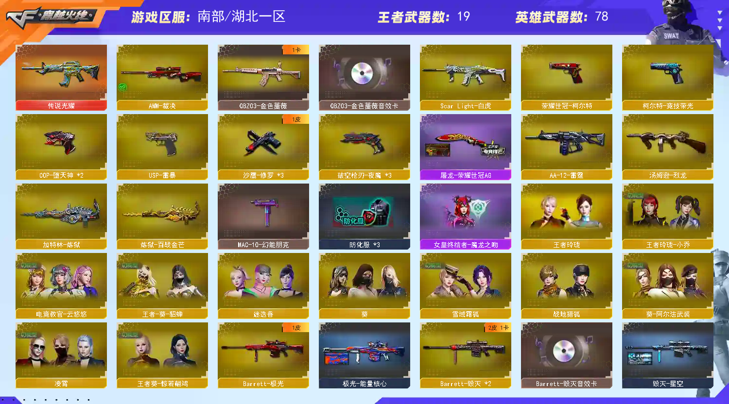 传说光耀王者幻神星神白虎裁决雷暴堕天神夜魔竞技荣光套云悠悠蔷薇带卡雷神宠儿;USP-雷暴,荣耀世冠-柯尔特,电竞教官-云悠悠,QBZ03-金色蔷薇,Scar Light-白虎,