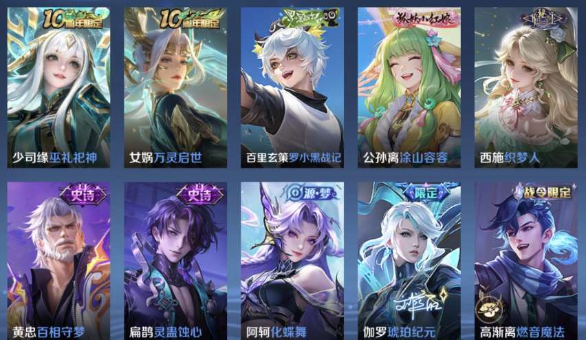 v10、12水562皮、死亡执政官、刘备星传说时之思念、小兵皮肤大耳狗甜茶、瑶无双真我赫兹、愿照·九州拓、怪盗基德、画中仙、至尊宝、凤求凰、神威、天魔缭乱