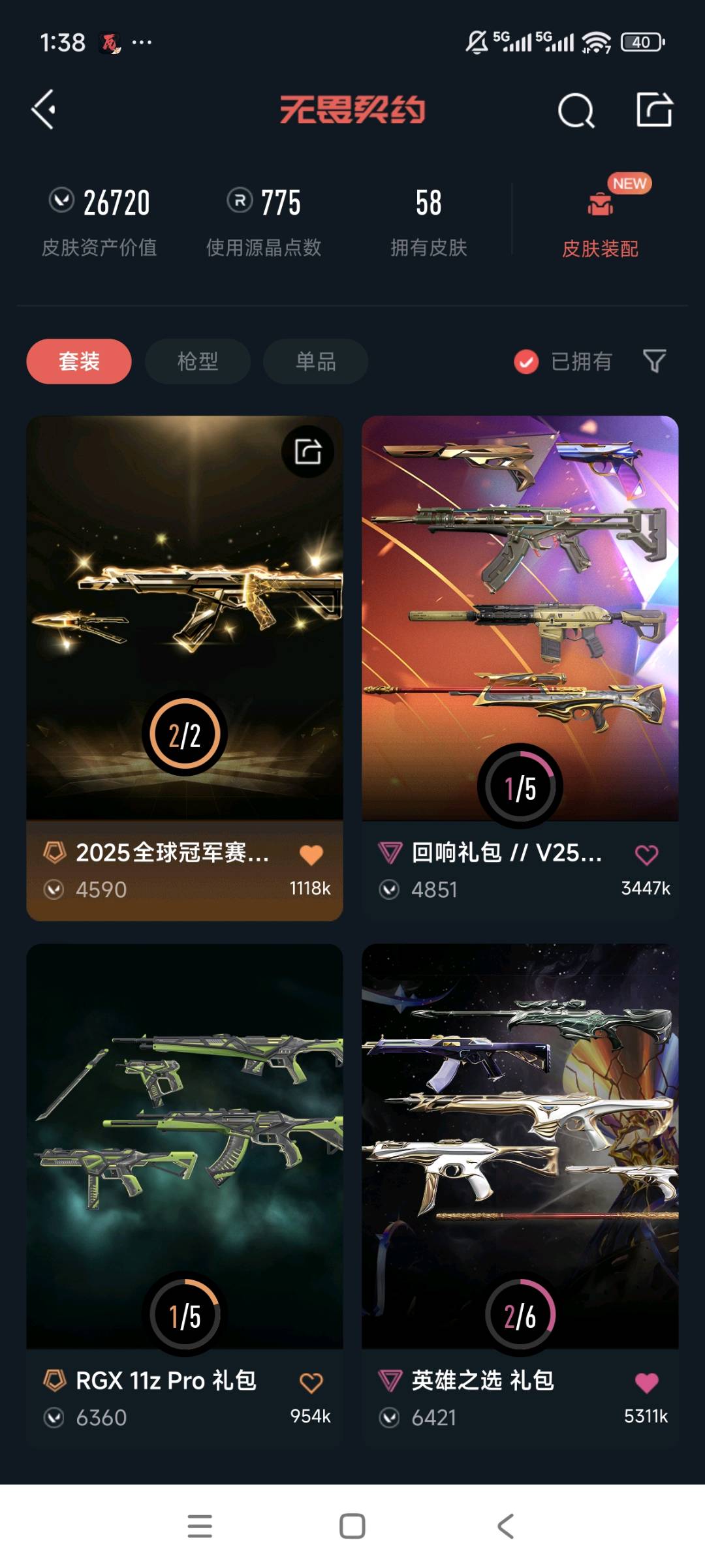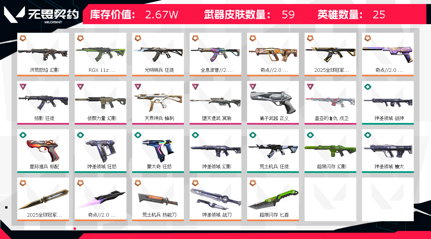 允许 英雄25 武器皮肤数量58;掠影 狂徒,侦察力量 幻影,洪荒怒焰 幻影,RGX 11z Pro 狂徒,天界神兵 蜂刺,堕天遗武 冥驹,离子武器 正义,