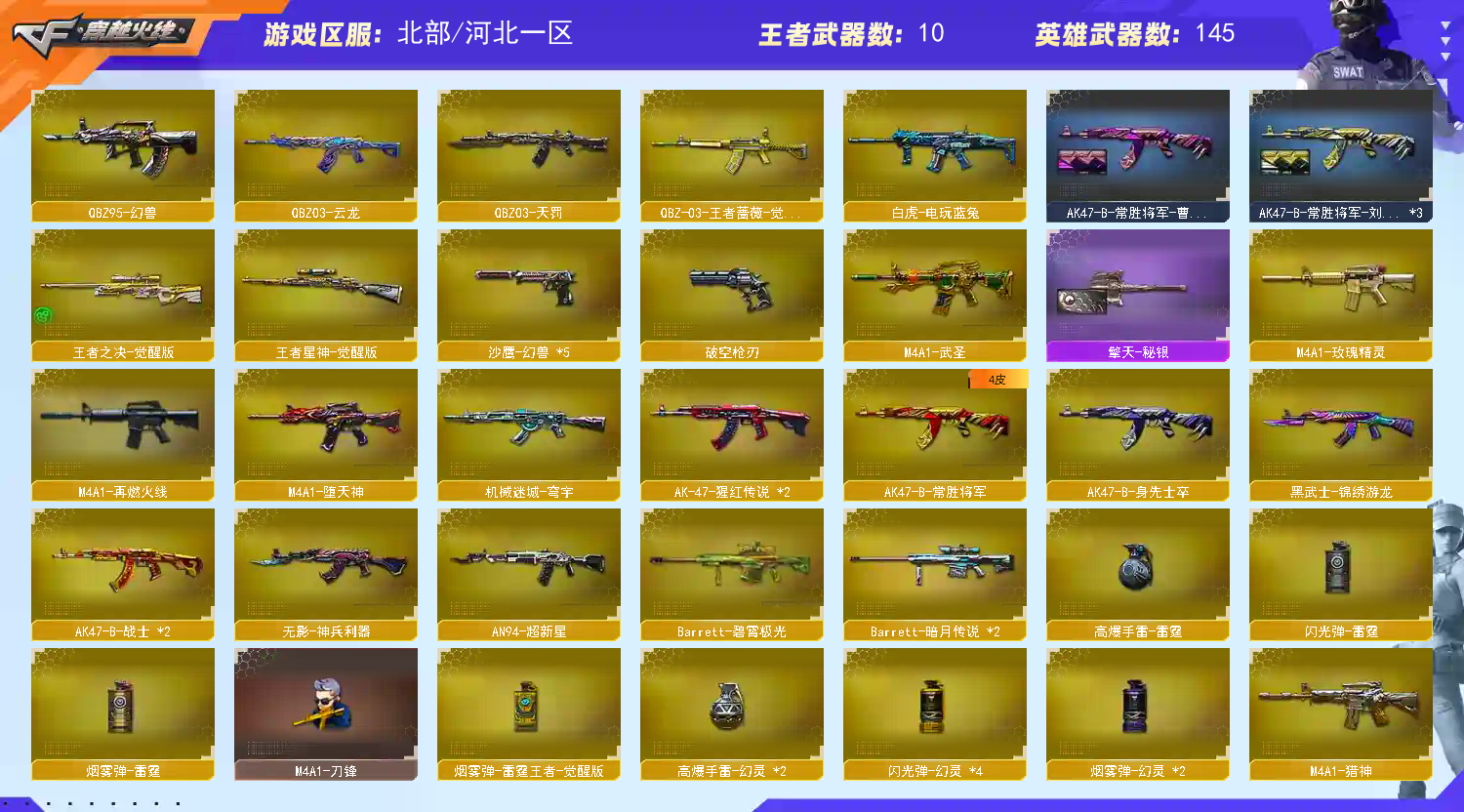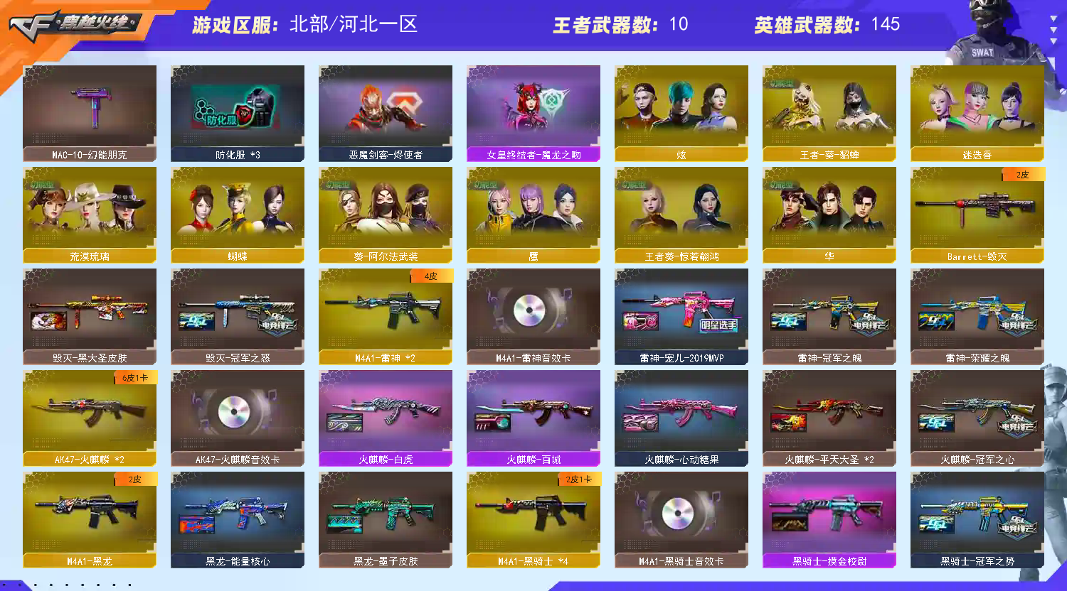 首页 > 租号大厅 > 穿越火线 > 网通区/河北一区 > 爆破号|双传说+5幻兽+裁决流光三件套+幻神EP老AG+白虎AG+星神|冠特+5cop+蝴蝶刀妮妮鹰