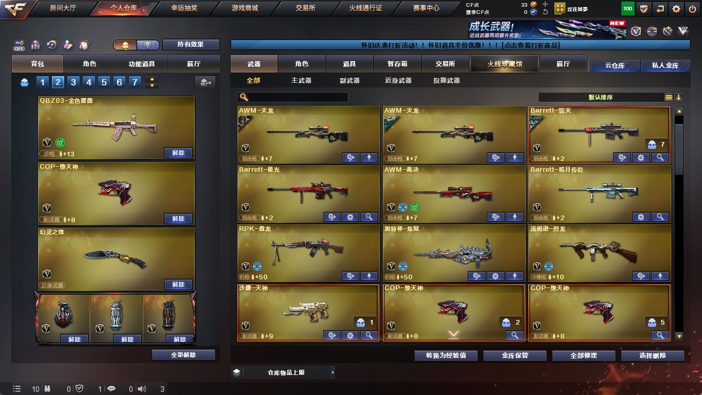 【ScarLight-白虎】【QBZ03-金色蔷薇】【裁决】【毁灭】【极光】【夜魔套】【火麒麟+音效卡+巅峰荣耀】【黑龙+音效卡】【雷神】【黑骑士】【王者之城】【超新星 黑鲨 千变】【6手枪 天神 cop堕天神*3】【12近战 屠龙*3 麒麟刺*4 幻灵之锋 王者之啸 王者之击】【手雷 夜魔*7 幻灵雷 】【四防 王者葵貂蝉 王者玲珑小乔】【火麒麟音效卡 黑龙音效卡】;RPK-盘龙,QBZ03-金色蔷薇,Scar Light-白虎,