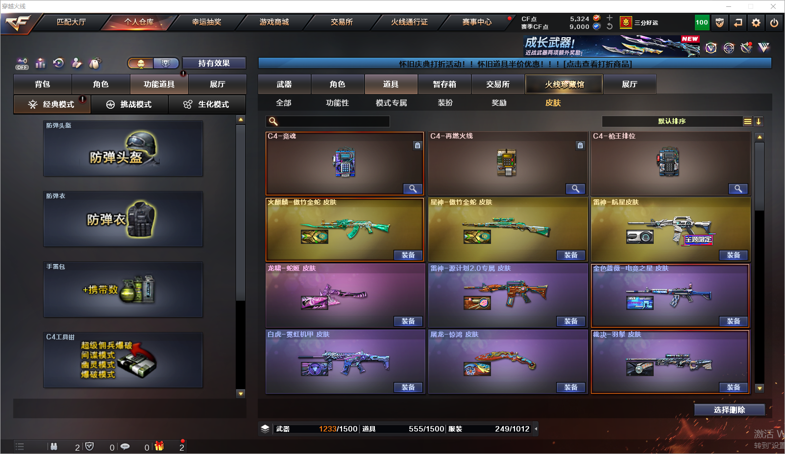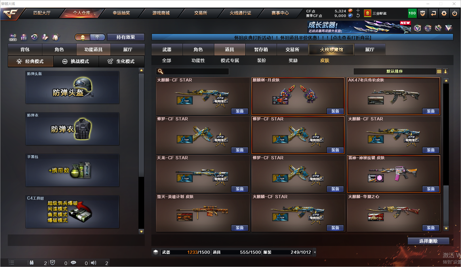 王者白虎+火麒麟+皮肤 雷神+皮肤 火麒麟+华夏之心皮肤 雷神+航星皮肤 金色蔷薇+电竞之星皮肤 毁灭+6件皮肤 王者涂鸦+王者复仇 玫瑰精灵 ak无影 an94超新星 hk417电竞之星 王者之圣 aa-12-雷霆 麒麟刺+屠龙+擎天 斯太尔幻面灵狐+小人枪 防弹衣+防弹头盔+C4钳子 等;QBZ03-金色蔷薇,