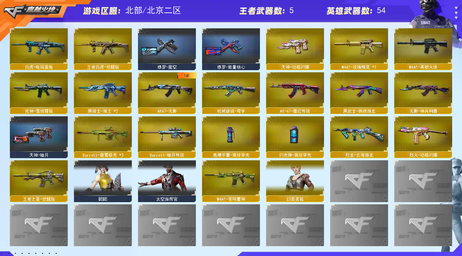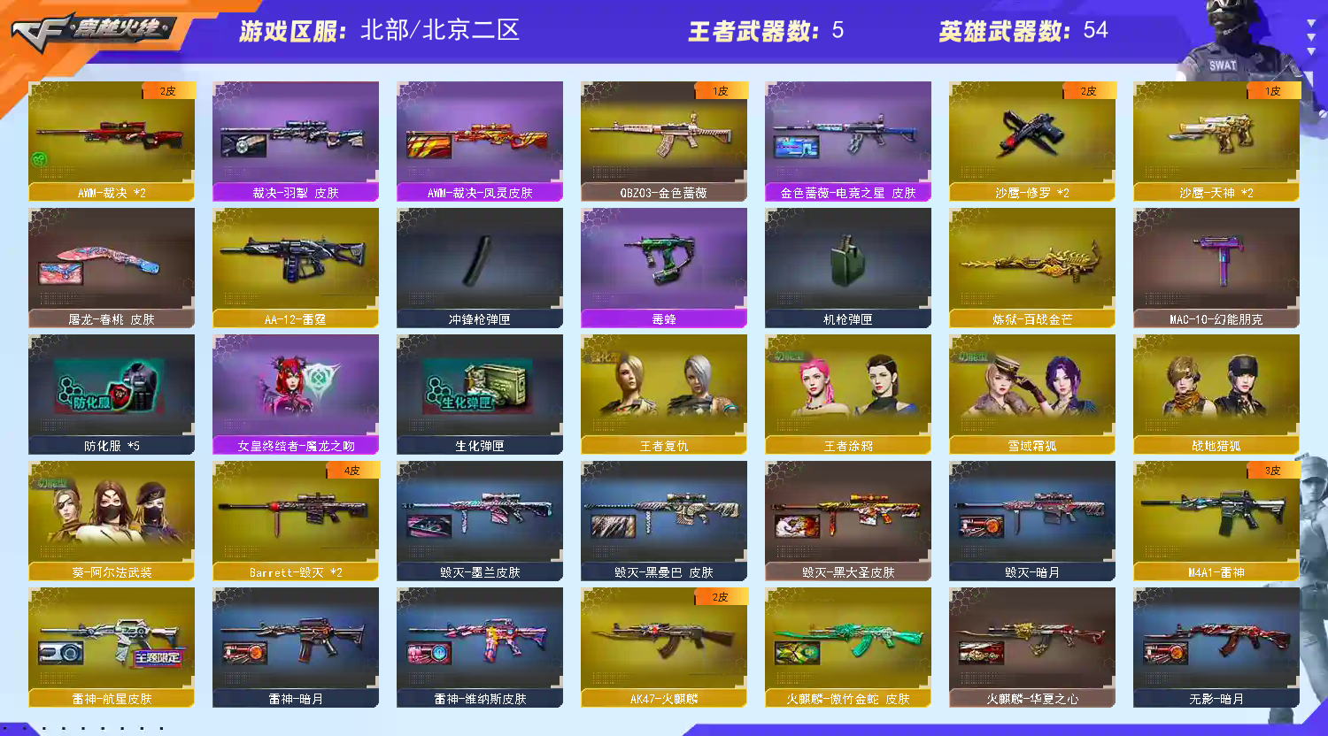 王者白虎+火麒麟+皮肤 雷神+皮肤 火麒麟+华夏之心皮肤 雷神+航星皮肤 金色蔷薇+电竞之星皮肤 毁灭+6件皮肤 王者涂鸦+王者复仇 玫瑰精灵 ak无影 an94超新星 hk417电竞之星 王者之圣 aa-12-雷霆 麒麟刺+屠龙+擎天 斯太尔幻面灵狐+小人枪 防弹衣+防弹头盔+C4钳子 等 [温馨提示]此号价值数万,已向公安机关报备,如有开G开辅助封号的,由平台提供,身份信息,证据和地址进行报警处理并依法追究责任!祝各位老板玩得开心。 请使用官方启动,更快捷稳定上号。恶意下单维权及检测到外挂将无法再次下单! [温馨提示]排位比赛请勿中途退出游戏,一经发现拉黑处理。;QBZ03-金色蔷薇,