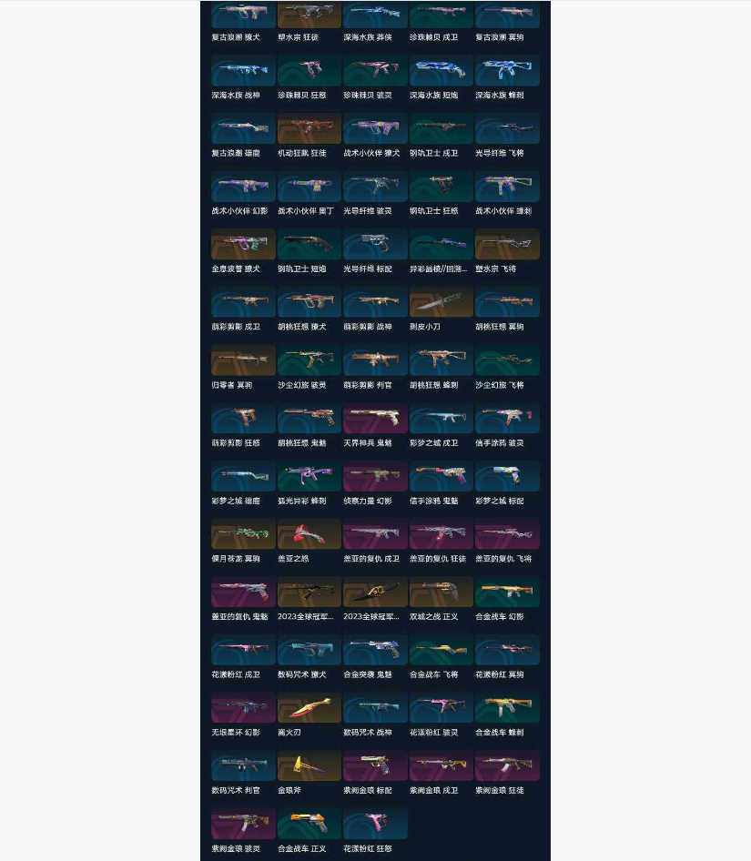 【套装】:2023全球冠军赛套装,RGX 11z Pro//3.0套装,离火刃套装,《英雄联盟:双城之战》套装,紫阙金琅套装,盖亚的复仇套装,离火刃套装 【英雄】:幻棱,炼狱,维斯,暮蝶,钛狐,壹决,铁臂,捷风,雷兹,幽影,不死鸟,贤者,猎枭,蝰蛇,零,芮娜,奇乐,尚勃勒,霓虹,斯凯,夜露,星礈,K/O,海神,盖可,黑梦,钢锁 【近战武器】:近战武器-2023全球冠军赛 苦无,近战武器-剥皮小刀,近战武器-奇点//2.0 蝴蝶刀,近战武器-RGX 11z Pro//3.0 爪