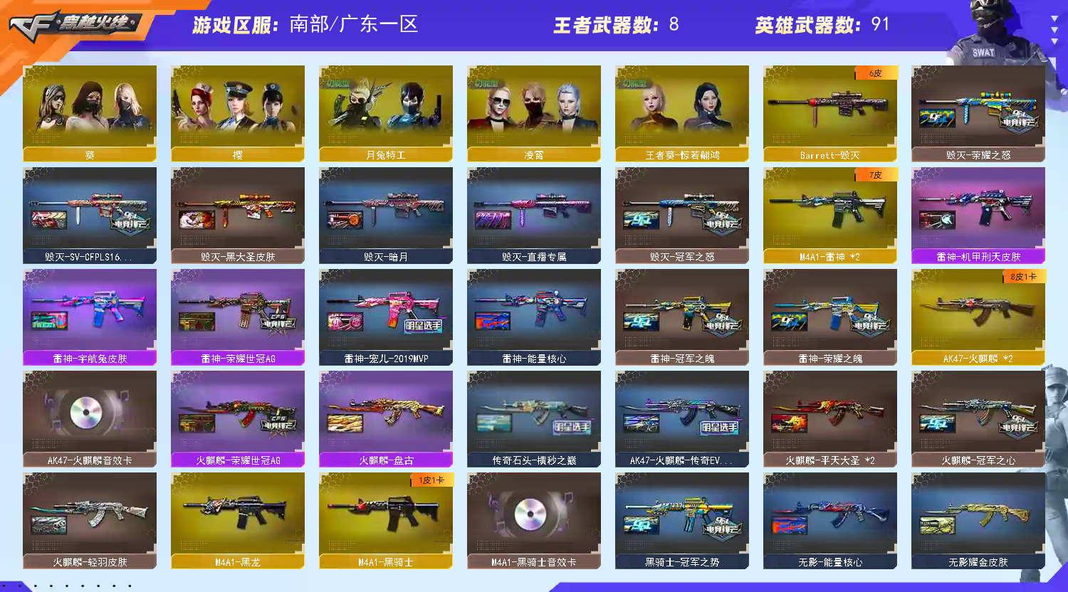 热门主武:传说幽瞳 传说辉光 M200-幻神 Barrett-毁灭 QBZ03-金色蔷薇 Scar Light-白虎 双M4A1-雷神 4烈龙 毒蜂 王者之决-觉醒版 王者星神-觉醒版 M200-竞技荣光 白虎-电玩蓝兔 火麒麟-绝迹 荣耀世冠-火麒麟 HK417-朱雀 barrett-金色蔷薇 Barrett-暗月传说 双死亡之眼 热门副武:传说幽冥 荣耀世冠-柯尔特 柯尔特-萌杀 双柯尔特-冠军之特 COP-旗袍 COP-堕天神 USP-雷暴 4把极品沙鹰 破空枪刃-夜魔 热门近战:双炽芒蝶刃 Knife-冠军之刃 猫猫手套 双屠龙 雷霆之锋 幻灵之锋 唐刀-盛世太平 荣耀世冠-龙啸 龙啸-烈火龙威 热门手雷套装:11套 热门皮肤音效:幻神:幻神音效卡 星火小队签名臻藏版 传奇欧欧 巅峰荣耀 荣耀世冠白鲨 动感闪耀 热门皮肤音效:炽芒蝶刃:冠军炽芒 热门皮肤音效:QBZ03-金色蔷薇:金色蔷薇音效卡 传奇宠儿 AG-CFPLS19冠军 热门皮肤音效:白虎:白虎音效 AG-CFPLS20冠军 热门皮肤音效:雷神:冠军之魄 机甲刑天 宇航兔 荣耀世冠AG 宠儿-2019MVP 荣耀之魄 能量核心 热门皮肤音效:毁灭:荣耀之怒 SV-CFPLS16冠军 黑大圣 暗月 冠军之怒 热门皮肤音效:黑骑士:黑骑士音效卡 冠军之势 热门皮肤音效:火麒麟:火麒麟音效卡 双平天大圣 荣耀世冠AG 传奇石头-横秒之巅 冠军之心 盘古 传奇EVEN 轻羽 热门角色:传说女帝 王者沙漠玫瑰 葵 樱 月兔特工 凌霄 王者葵-惊若翩鸿;USP-雷暴,荣耀世冠-柯尔特,传说幽冥,柯尔特-冠军之特,炽芒蝶刃,Knife-冠军之刃,传说女帝,