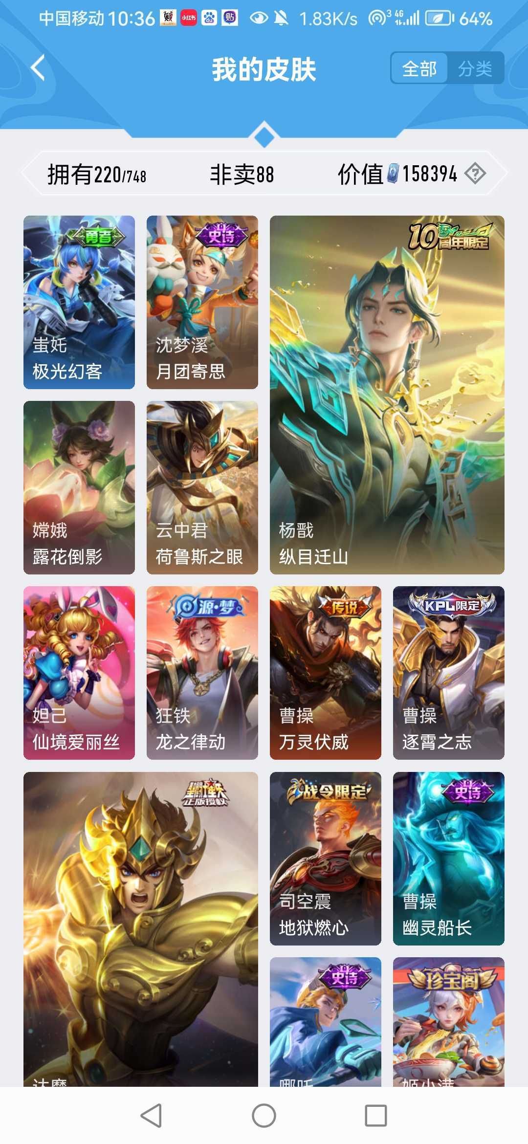 v10、12典藏520皮、马超无双飞将、韩信典藏、马可深海之熄、瑶珍品传说大耳狗之梦、青丘·九尾、枫霜尽、绯月行、前尘镜、至尊宝、天魔缭乱
