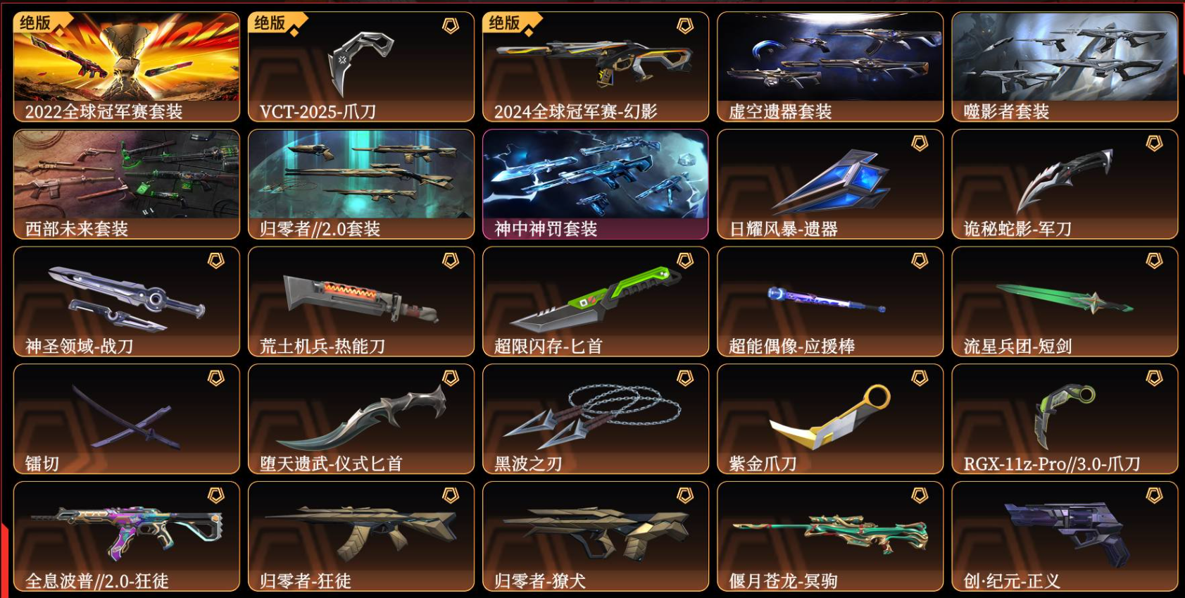 19刀皮★121枪皮★2022冠军套装★VCT-2025-爪刀★2024冠军幻影★虚空遗器套★噬影套