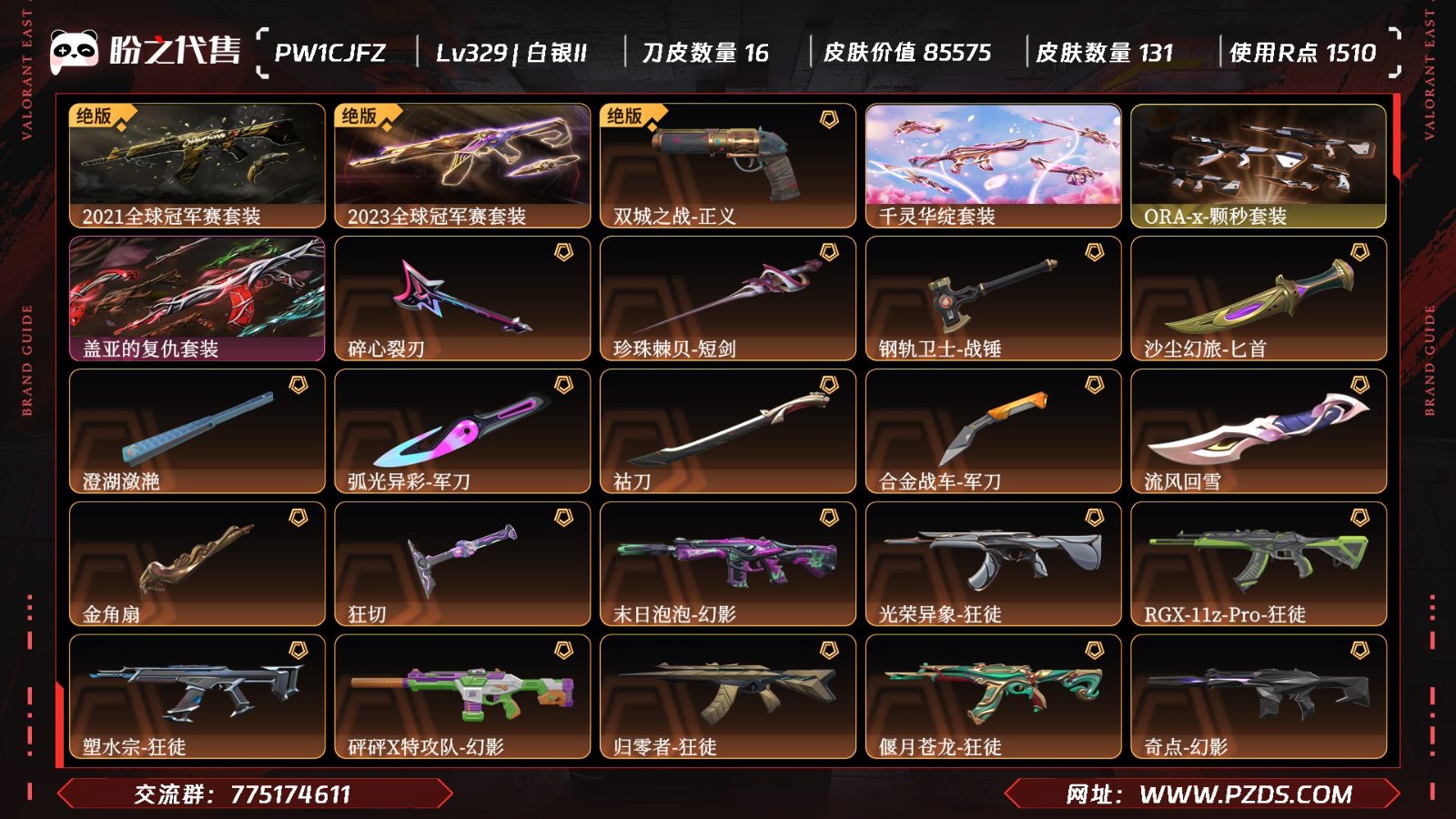 【皮肤资产价值】85575 【使用R点】1510 【英雄数量】28 【皮肤数量】131 【卡面数量】152 【喷漆数量】140 【挂件数量】106 【拥有套装】ORA-x-颗秒套装(ORA-x-颗秒-狂徒,ORA-x-颗秒-幻影,ORA-x-颗秒-冥驹,ORA-x-颗秒-正义,ORA-x-颗秒-军刀)千灵华绽套装(千灵华绽-幻影,千灵华绽-冥驹,千灵华绽-判官,千灵华绽--正义,落英飞旋)2023全球冠军赛套装(2023全球冠军赛-狂徒,2023全球冠军赛-苦无)2021全球冠军赛套装(2021全球冠军赛-狂徒,2021全球冠军赛-爪刀)盖亚的复仇套装(盖亚的复仇-狂徒,盖亚的复仇-戍卫,盖亚的复仇-飞将,盖亚的复仇-鬼魅,盖亚之怒) 【拥有近战武器】碎心裂刃,珍珠棘贝-短剑,钢轨卫士-战锤,沙尘幻旅-匕首,弧光异彩-军刀,祜刀,合金战车-军刀,流风回雪,金角扇,狂切, 【拥有步枪】末日泡泡-幻影,光荣异象-狂徒,RGX-11z-Pro-狂徒,塑水宗-狂徒,砰砰X特攻队-幻影,归零者-狂徒,偃月苍龙-狂徒,奇点-幻影,艾沃莉的梦之翼-狂徒,紫阙金琅-狂徒,无畏契约GO卷-幻影,赛博迷城-幻影,侦察力量-幻影,掠影-戍卫,幻心猎手-狂徒,珍珠棘贝-戍卫,珍珠棘贝-幻影,钢轨卫士-戍卫,钢轨卫士-狂徒,沙尘幻旅-狂徒,噬源兽防卫工程-幻影,弧光异彩-獠犬,弧光异彩-狂徒,合金战车-幻影,甜心猎手-幻影,诛心猎手-獠犬,甜心猎手-戍卫,复古浪潮-獠犬,战术小伙伴-獠犬,战术小伙伴-幻影,胡桃狂想-獠犬,萌彩剪影-戍卫,彩梦之城-戍卫,花漾粉红-戍卫,数码咒术-獠犬,合金突袭-狂徒, 【拥有狙击枪】沙尘幻旅-飞将,虎魄春明-冥驹,合金战车-飞将,诛心猎手-冥驹,甜心猎手-莽侠,复古浪潮-冥驹,深海水族-莽侠,光导纤维-飞将,胡桃狂想-冥驹,信手涂鸦-飞将,花漾粉红-冥驹, 【拥有机枪】奇点-战神,艾沃莉的梦之翼-奥丁,诛心猎手-奥丁,深海水族-战神,战术小伙伴-奥丁,萌彩剪影-战神,信手涂鸦-奥丁,炫彩澎湃-奥丁,数码咒术-战神, 【拥有冲锋枪】奇点-骇灵,珍珠棘贝-骇灵,沙尘幻旅-骇灵,弧光异彩-蜂刺,合金战车-蜂刺,甜心猎手-蜂刺,深海水族-蜂刺,战术小伙伴-蜂刺,光导纤维-骇灵,胡桃狂想-蜂刺,信手涂鸦-骇灵,花漾粉红-骇灵, 【拥有霰弹枪】偃月苍龙-判官,复古浪潮-雄鹿,萌彩剪影-判官,彩梦之城-雄鹿,数码咒术-判官, 【拥有手枪】双城之战-正义,塑水宗-正义,天界神兵-鬼魅,幻心猎手-鬼魅,诡秘蛇影-鬼魅,超能偶像-标配,流星兵团-鬼魅,珍珠棘贝-狂怒,钢轨卫士-短炮,钢轨卫士-狂怒,沙尘幻旅-正义,弧光异彩-短炮,合金战车-正义,甜心猎手-短炮,诛心猎手-正义,星云暗涌-鬼魅,小玩意-标配,深海水族-短炮,复古浪潮-正义,光导纤维-标配,光导纤维-鬼魅,萌彩剪影-狂怒,胡桃狂想-鬼魅,信手涂鸦-鬼魅,彩梦之城-标配,数码咒术-鬼魅,花漾粉红-狂怒,超能冲撞-标配, 【稀有挂件】V25第六幕铂金挂饰,第九季黄金挂饰,袖珍捷风挂饰,糖葫芦挂饰,迷你浓缩挂饰,第八季铂金挂饰,终章迷你机甲挂饰,战术河童挂饰,传世莲华挂饰,好运福爪挂饰,瞄这里挂饰,第七季铂金挂饰,幸运中国结挂饰,章鱼小弟挂饰,全球冠军赛方块挂饰,终章陷阱挂饰,机器伙伴挂饰, 【卡面信息】双城之战拥抱卡面,千灵华绽卡面,虹吸式咖啡壶卡面,逆向独行卡面,双城之战谜团卡面,;