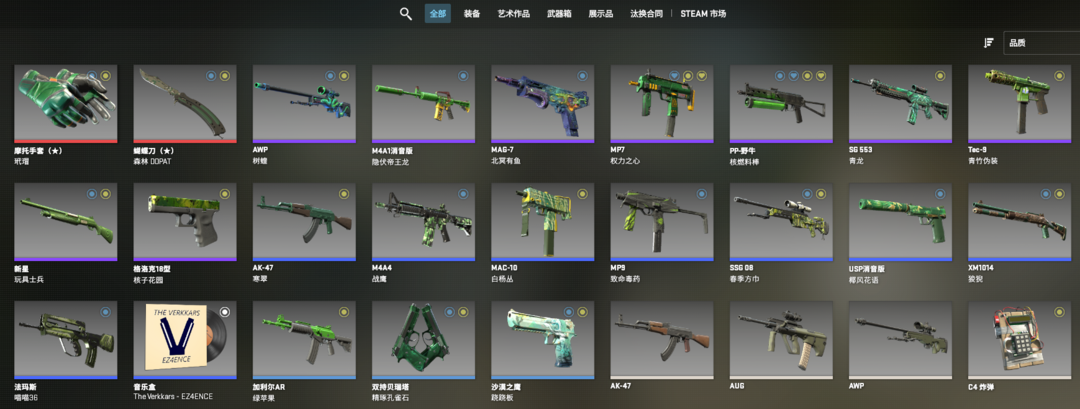 完美C✅全套绿装✅蝴蝶刀森林✅摩托手套玳瑁✅AK47寒翠✅战鹰M4A4✅树蝰AWP
