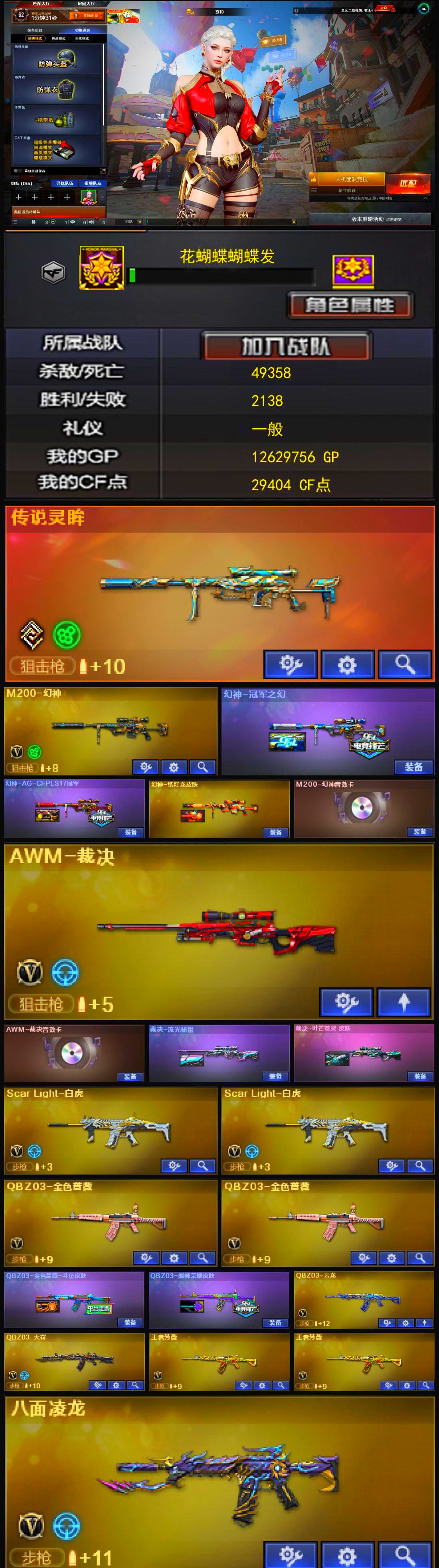极品账号♥灵眸幻神三件套♥裁决三件套♥满质量手枪♥qbz白虎带皮♥满级八面玲珑双全装;USP-雷暴,炽芒蝶刃,Knife-冠军之刃,晴雅,RPK-盘龙,QBZ03-金色蔷薇,M200-幻神,