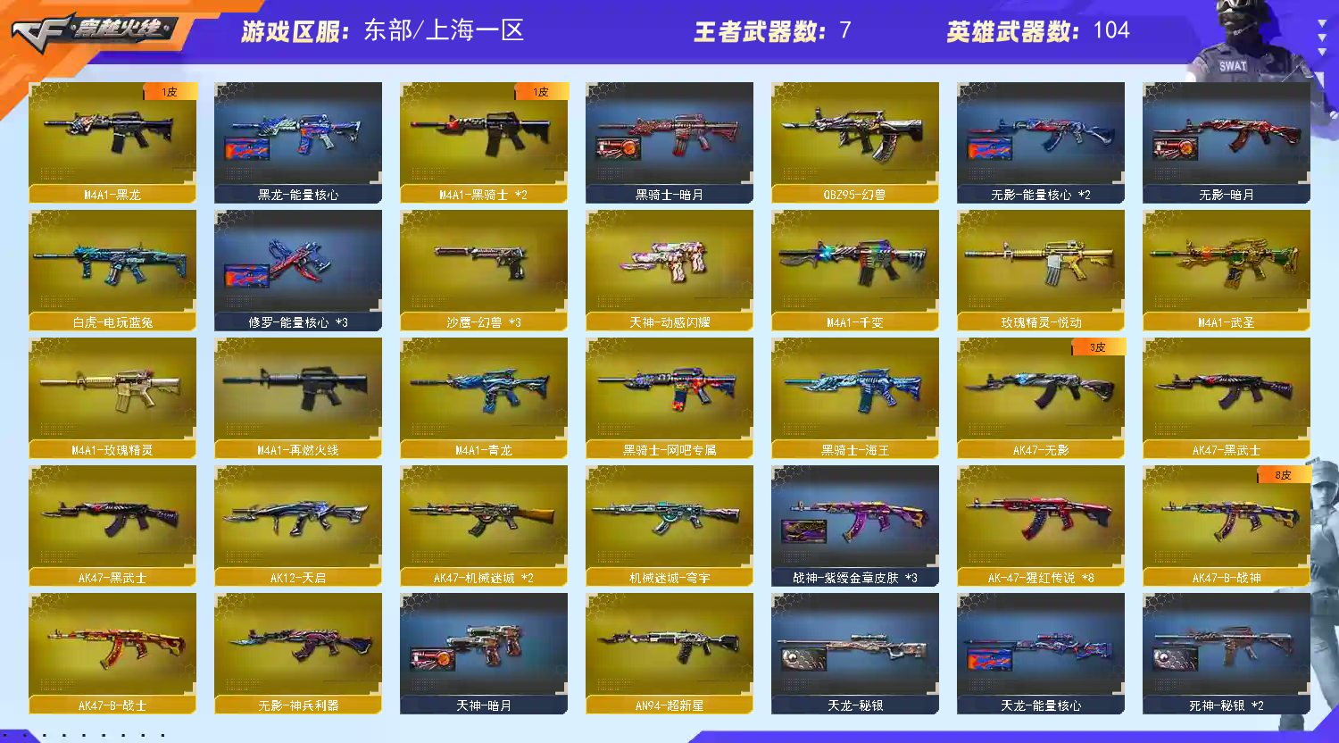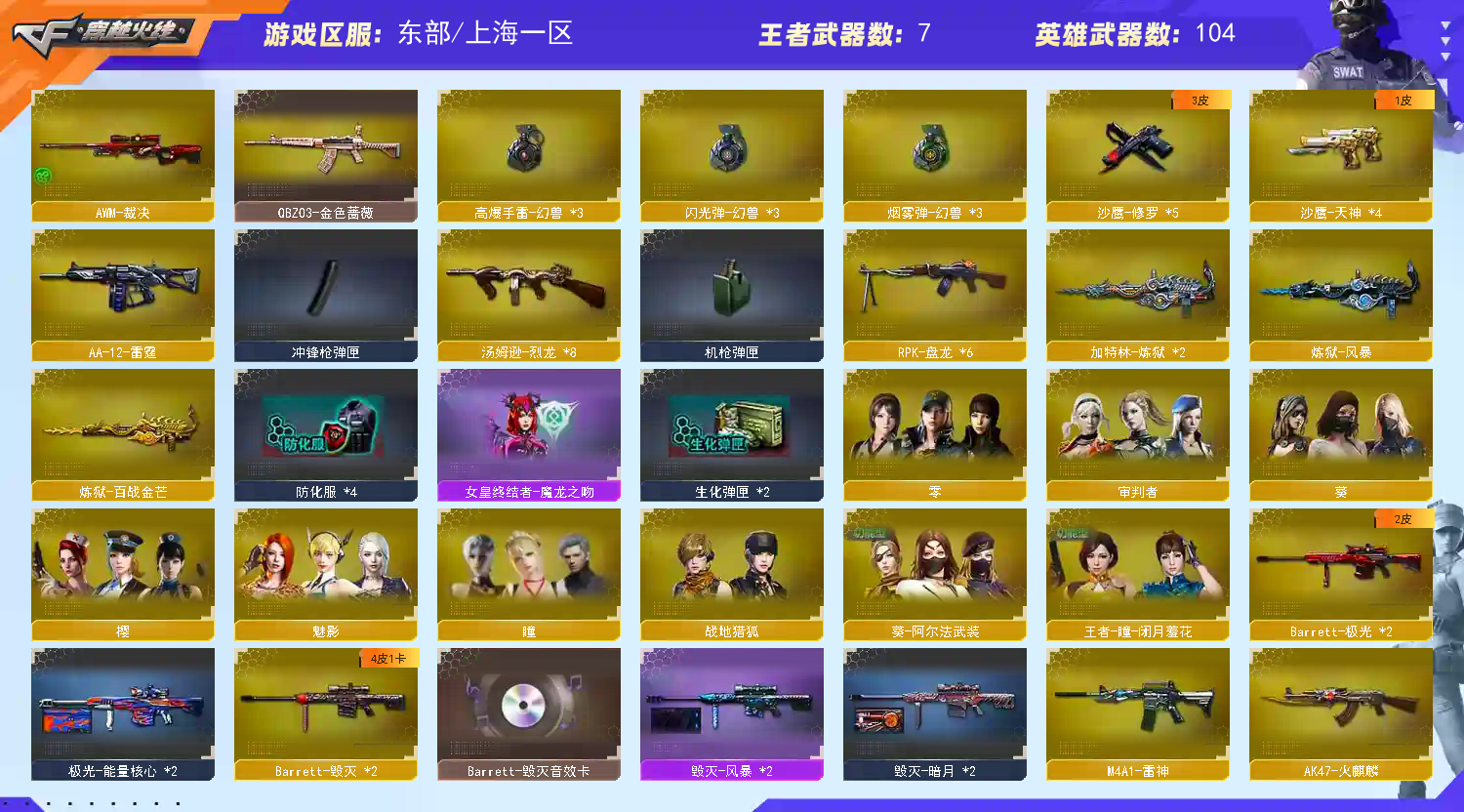 首页 > 租号大厅 > 穿越火线 > 电信区/上海一区 > V6武器104王者7裁决极光毁灭金色蔷薇雷神烈龙盘龙炼狱风暴幻兽M4A1手雷AK47闪光弹高爆音效卡