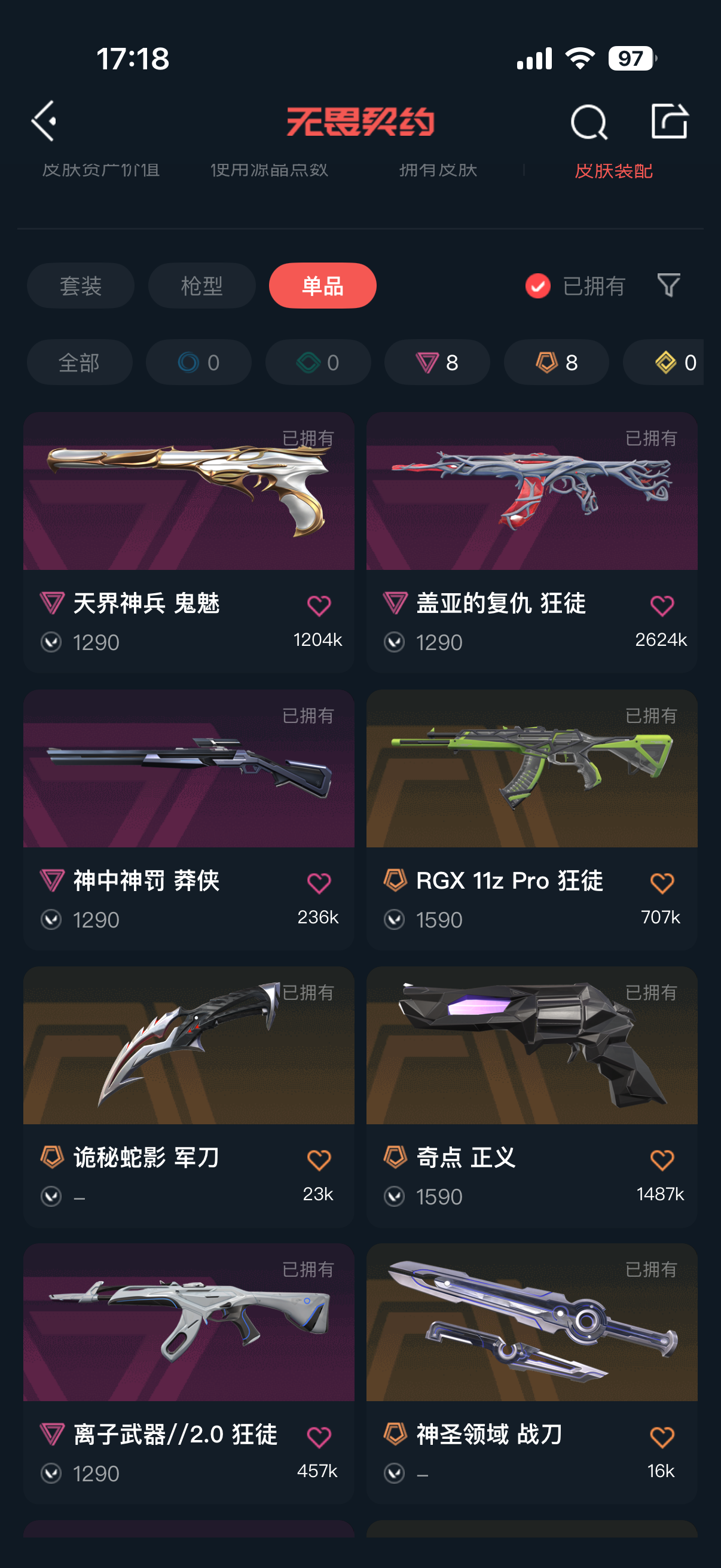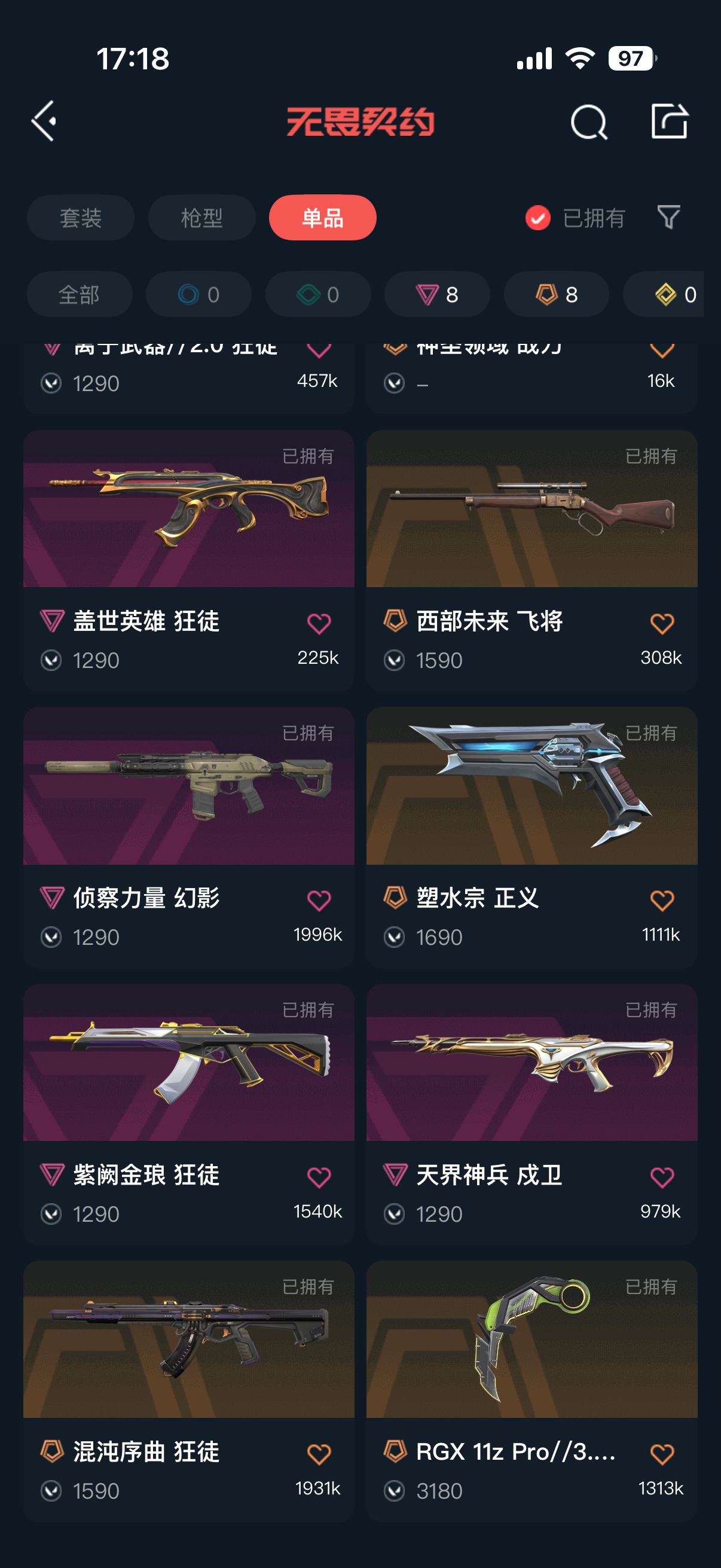 允许 英雄28 武器皮肤数量43;盖亚的复仇 狂徒,侦察力量 幻影,紫阙金琅 狂徒,RGX 11z Pro 狂徒,天界神兵 戍卫,混沌序曲 狂徒,离子武器//2.0 狂徒,