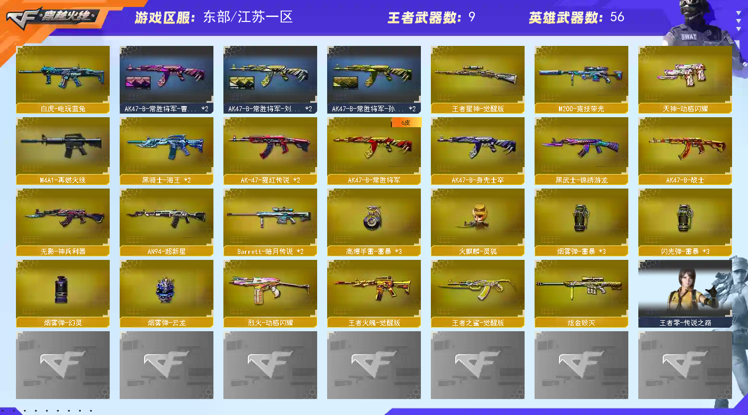 【稀有武器】:USP-雷暴/天神-动感闪耀/QBZ03-金色蔷薇/AK47-火麒麟/M4A1-雷神/M4A1-黑骑士/白虎-电玩蓝兔/Barrett-毁灭/M200-竞技荣光/RPK-盘龙(5)/加特林-炼狱/炼狱-风暴/汤姆逊-烈龙(6)/斩神刀-雷暴 【王者武器】:王者星神-觉醒版 【热门角色】:沙漠玫瑰/乔伊教练/王者-葵-貂蝉/王者炽天使/灵狐者-职业经理/潘多拉-X/职业选手 【热门音效卡】:M4A1-黑骑士音效卡 【热门皮肤】:毁灭-战神张飞/黑骑士-战神马超/屠龙-春桃皮肤 【其他亮点】:斯泰尔-蝴蝶/炼狱-迷你小钢/贝雷塔687-射手座/黄金猫猫手套-白鲨/金刚伞-电玩红兔;USP-雷暴,沙漠玫瑰,RPK-盘龙,QBZ03-金色蔷薇,