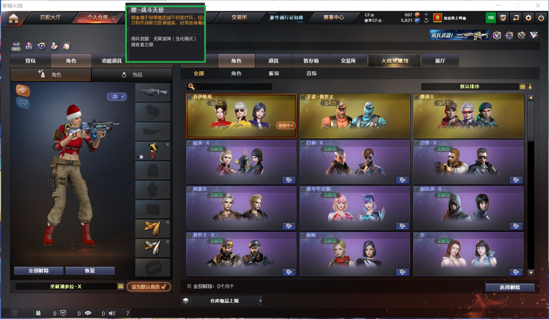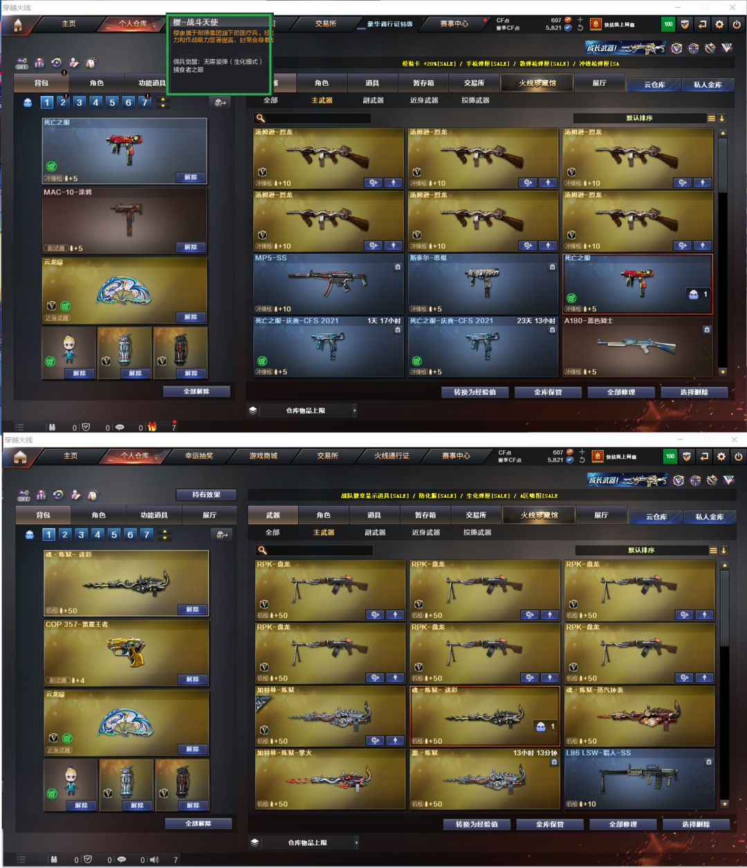 排位:可以------------生化全装(可以查看生化僵尸血量):无需换弹、6烈龙、6炼狱、死亡之眼、MAC-10涂鸦、手斧镜、生化减速雷、全部弹匣、超级对讲机、、、、、、、、、、爆破全装:白虎、QBZ加速器、COP雷霆王者、、、雷神音效、、、1套夜魔、1套云龙、、生化人物(樱-战斗天使);RPK-盘龙,QBZ03-金色蔷薇,Scar Light-白虎,