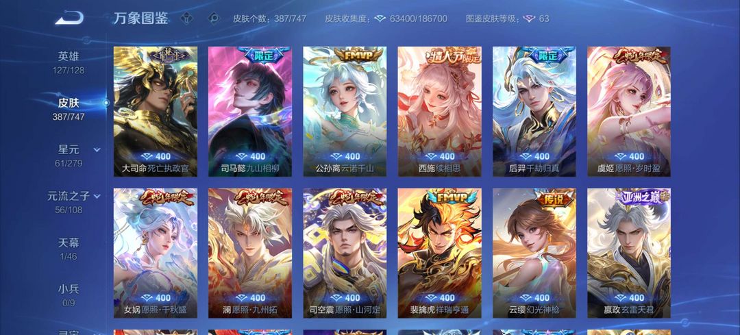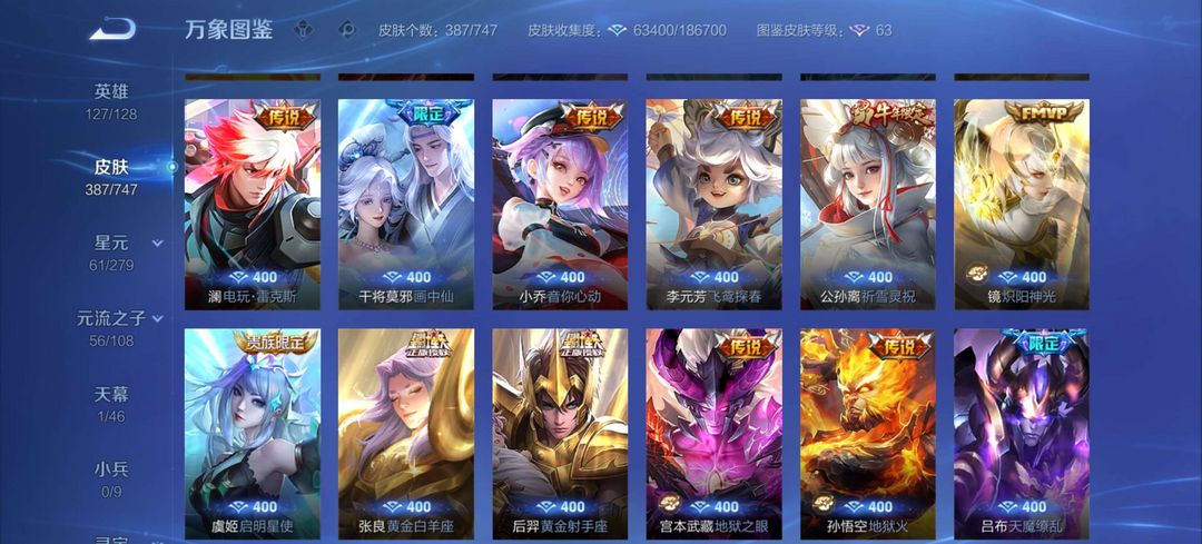 扫码登录。VIP10。385皮肤,七水,四星元,双王者之证!武则天神域,李白荣耀典藏,全息碎影,全符文,各种限定,各种机甲,皮肤都有,绝对满足各位