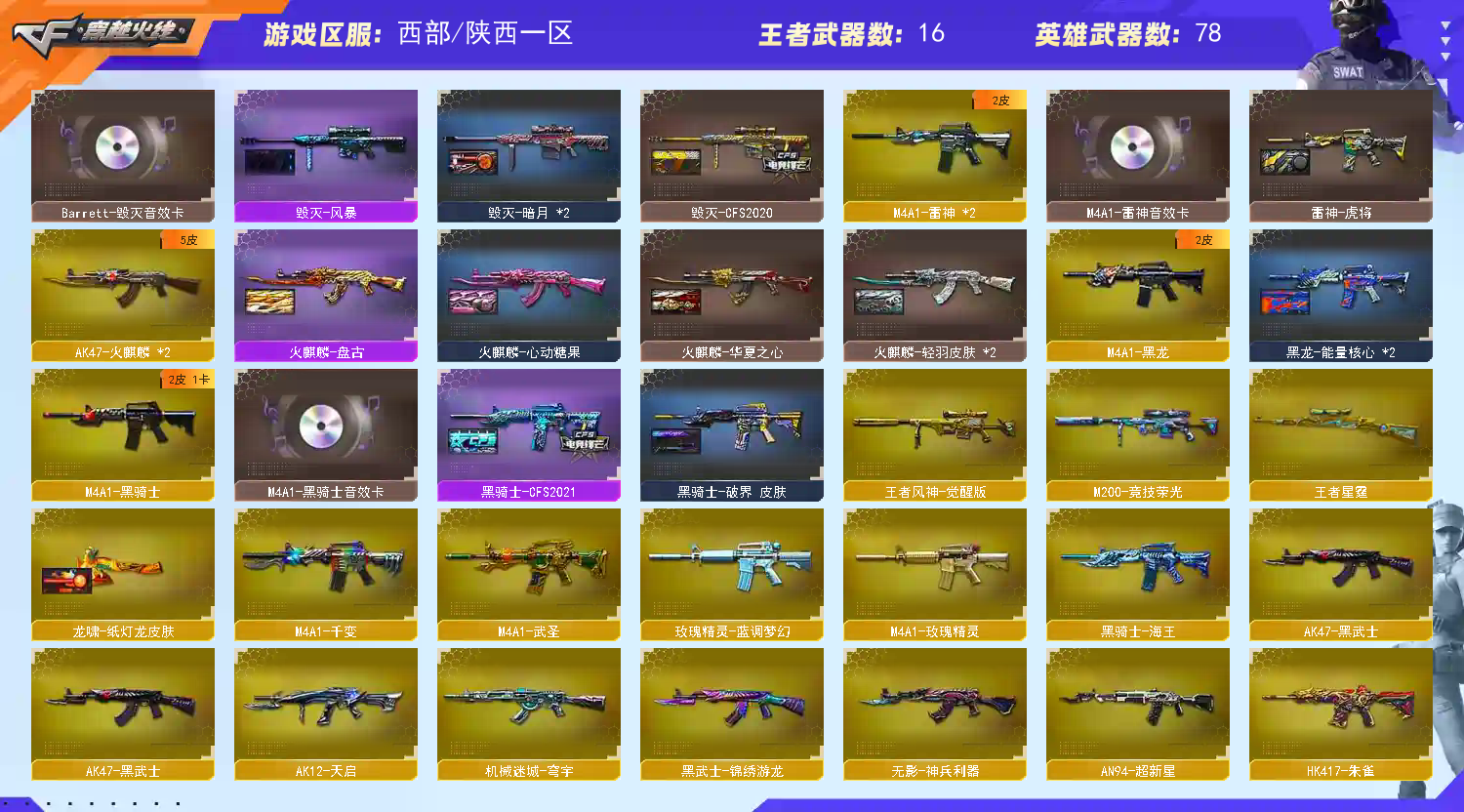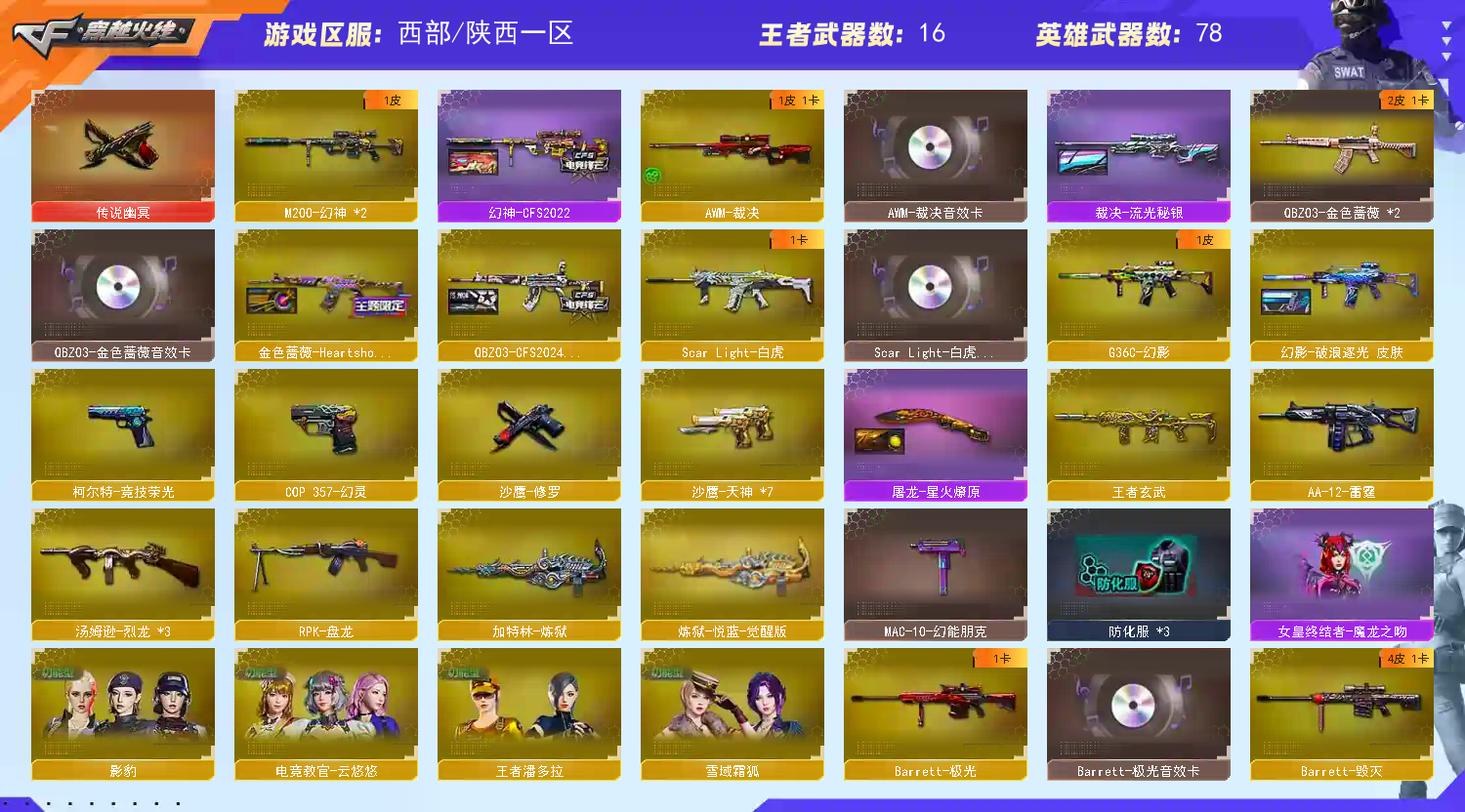 幻神➕一皮|竞技荣光套+王者风神| 副武器|传说幽冥|cop 幻灵|柯尔特|修罗|天神… 毁灭➕3 皮➕音效卡|裁决➕一皮➕音效卡 qbz 蔷薇➕2 皮➕音效卡|白虎➕音效卡 雷神➕3 皮➕音效卡|激光+音效卡 双四防角色|全套手雷|赤羽锋芒| 生化有 4 盘 4 烈;传说幽冥,炽芒蝶刃,电竞教官-云悠悠,RPK-盘龙,QBZ03-金色蔷薇,G36C-幻影,M200-幻神,