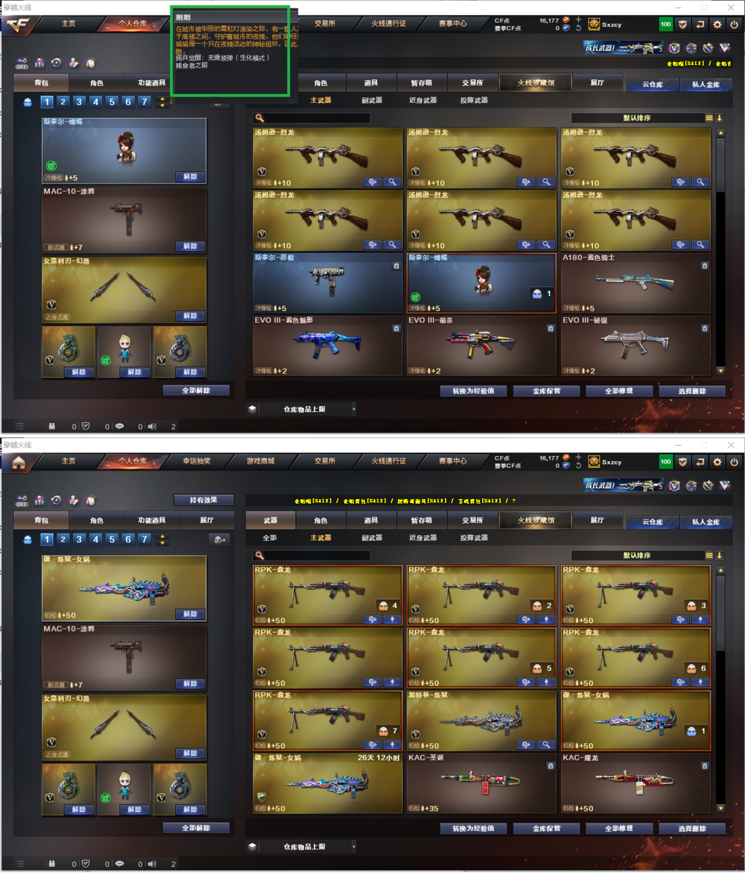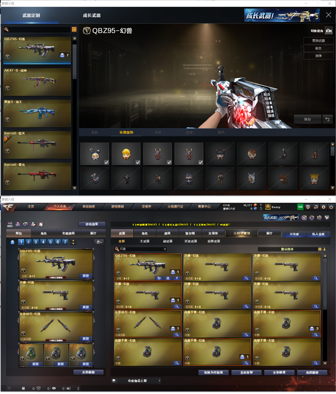 排位:可以、、、、、、、生化全装:6烈龙、6盘龙、斯泰尔蝴蝶、、死亡之眼、MAC-涂鸦、超级对讲机、全部弹匣、、、爆破全装:QBZ幻兽、5个幻兽沙鹰、破空枪刃、、、火麒麟音效、、、5套幻兽、3套雷暴、、、生化人物(娟娟)爆破人物(蝴蝶);RPK-盘龙,
