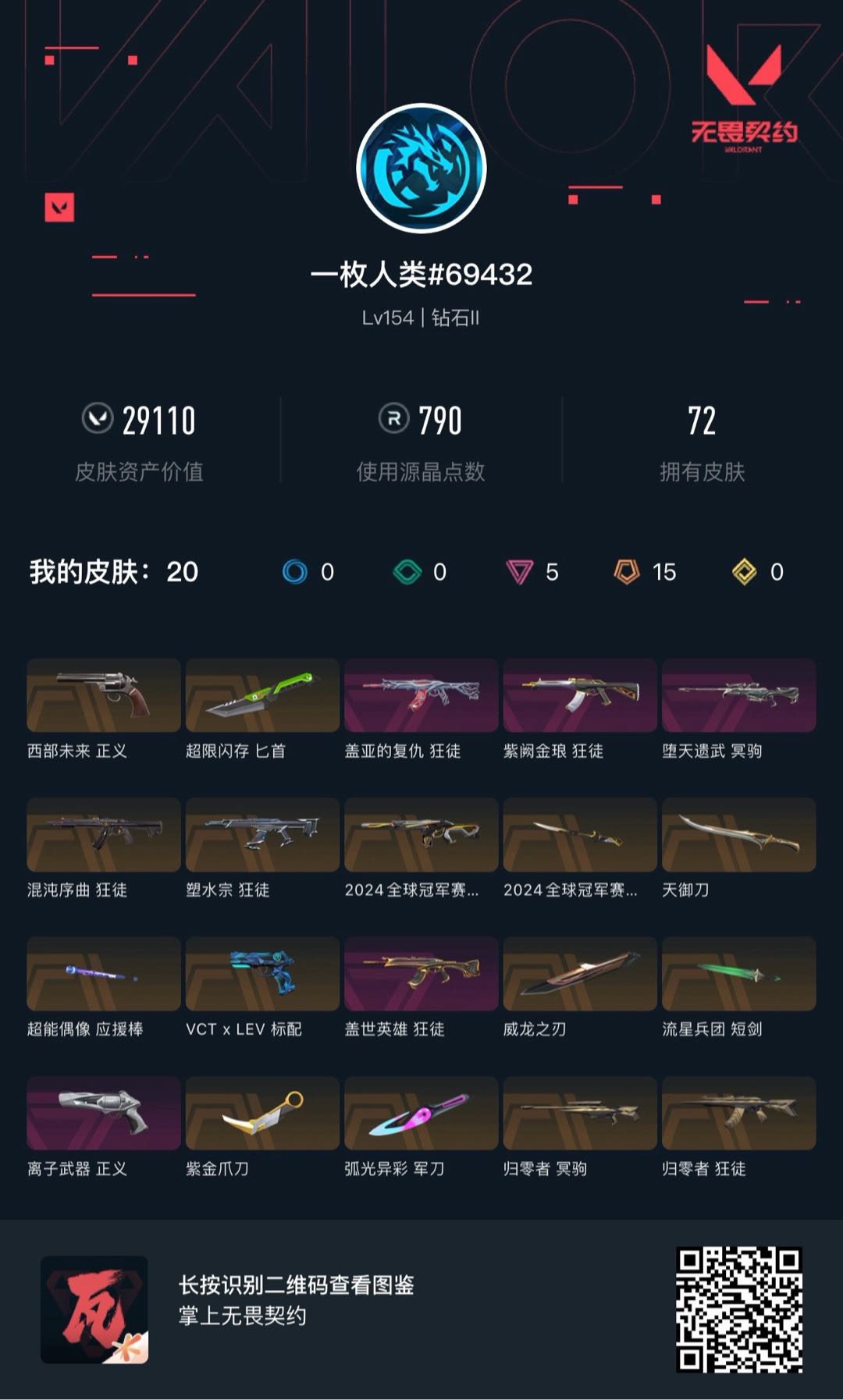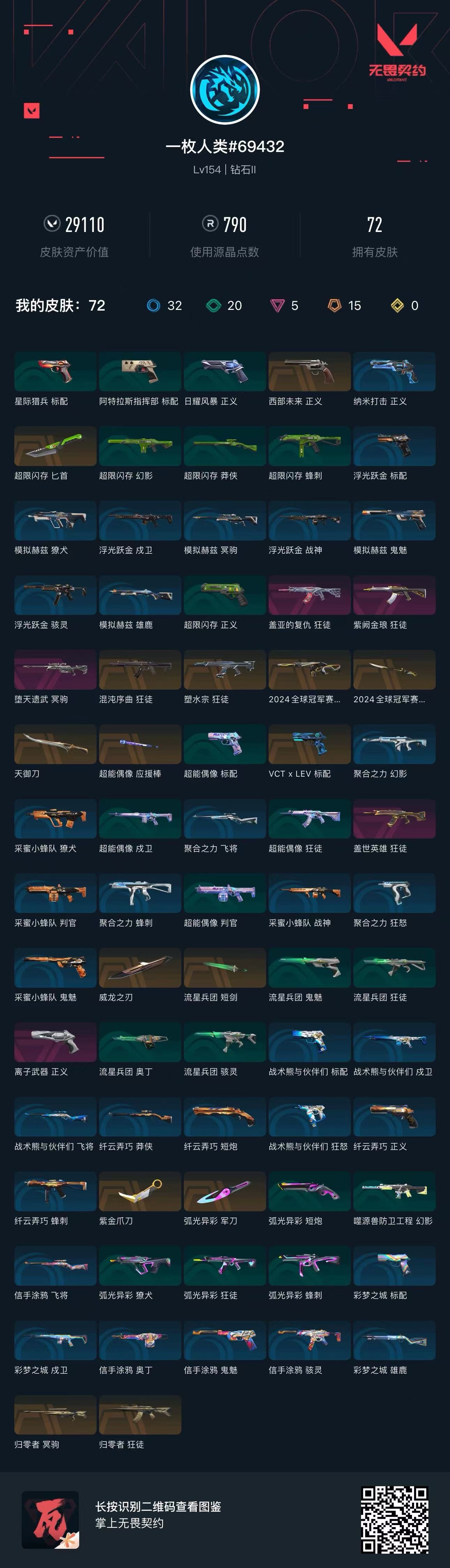 可排位 英雄22 武器皮肤数量72;紫金爪刀,威龙之刃,盖亚的复仇 狂徒,紫阙金琅 狂徒,混沌序曲 狂徒,塑水宗 狂徒,2024全球冠军赛 幻影,
