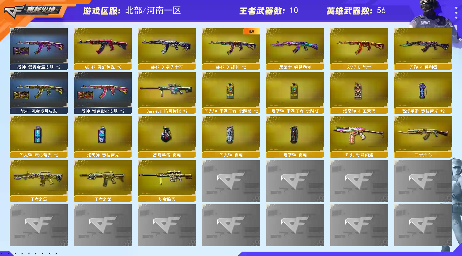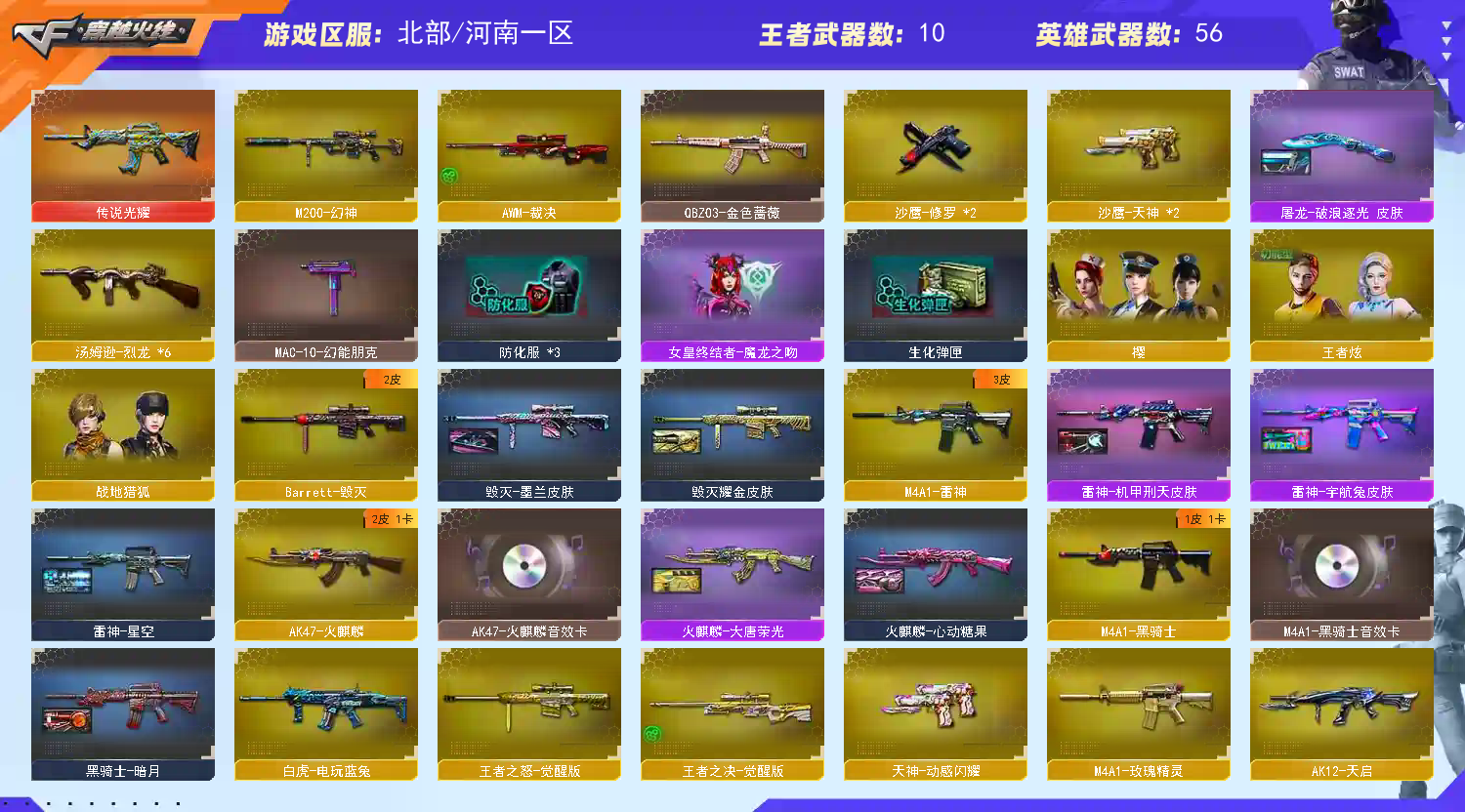 【m200幻神】 【传说光耀】 【qbz金色蔷薇】 【猫猫手套】 【火麒麟+音效卡】 【雷神+heartshot】 【黑骑士+音效卡】 【毁灭】 【裁决】 【烈龙*6】 【王者之决】 【天启 无影神兵利器 黑武士锦绣游龙 玫瑰精灵 猩红传说 烈火动感闪耀 战士 战神】 【修罗 天神 屠龙】 【四防角色 王者炫】 【角色 乔伊教练 樱】 【动感闪耀炫彩背包 虎牙炫彩背包】;QBZ03-金色蔷薇,M200-幻神,