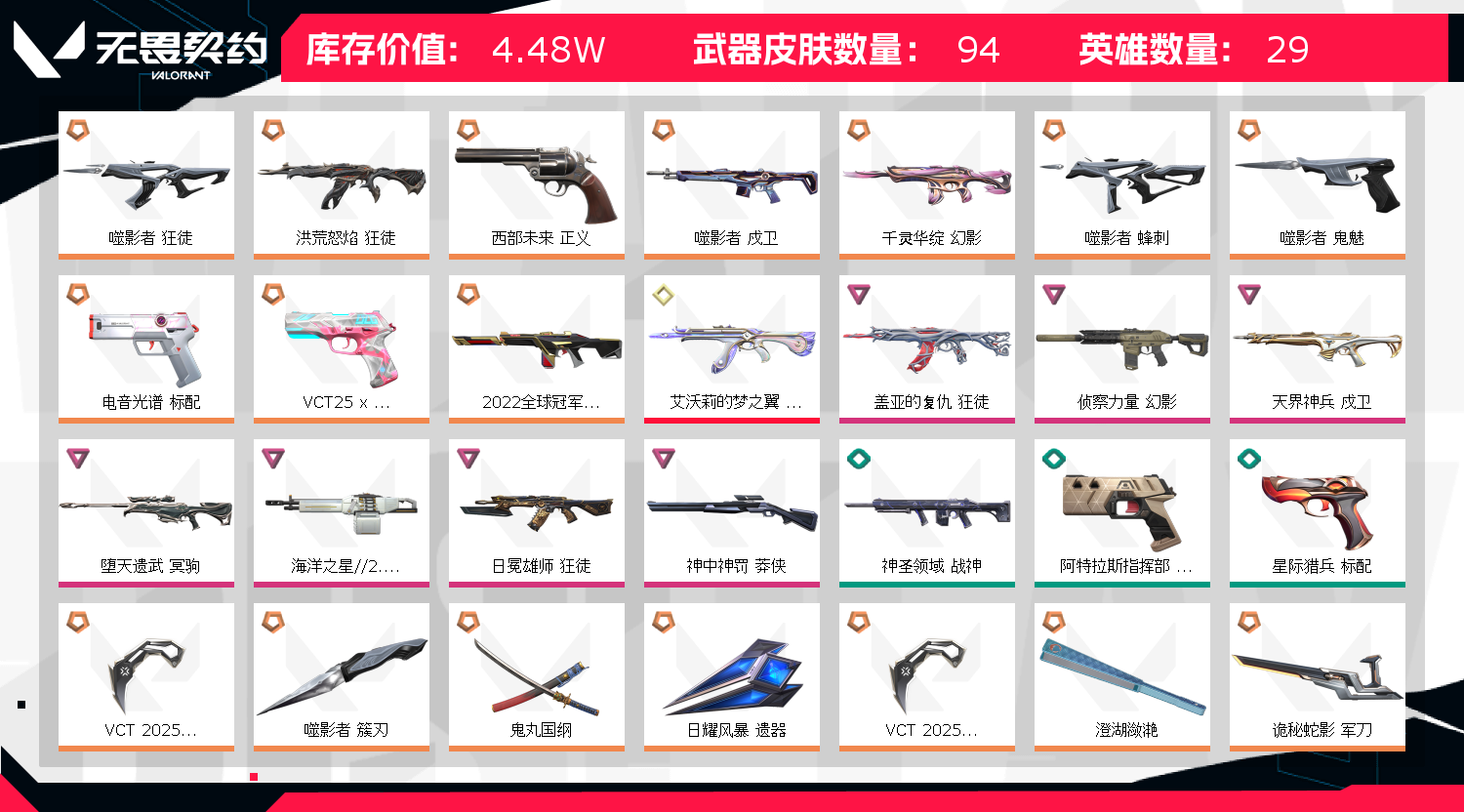 【皮肤资产价值】44810 【使用R点】1150 【英雄数量】28 【皮肤数量】93 【卡面数量】125 【喷漆数量】120 【挂件数量】92 【拥有套装】2022全球冠军赛套装(2022全球冠军赛-幻影,2022全球冠军赛-蝴蝶刀)噬影者套装(噬影者-狂徒,噬影者-戍卫,噬影者-蜂刺,噬影者-鬼魅,噬影者-簇刃) 【拥有近战武器】星际猎兵-短剑,阿特拉斯指挥部-甩棍,日耀风暴-遗器,诡秘蛇影-军刀,VCT-2025-爪刀,神圣领域-战刀,鬼丸国纲, 【拥有步枪】千灵华绽-幻影,洪荒怒焰-狂徒,艾沃莉的梦之翼-狂徒,天界神兵-戍卫,盖亚的复仇-狂徒,侦察力量-幻影,日冕雄师-狂徒,星际猎兵-幻影,阿特拉斯指挥部-狂徒,日耀风暴-幻影,诡秘蛇影-狂徒,神圣领域-獠犬,神圣领域-幻影,光环序列-戍卫,瑰梦艺语-狂徒,悠闲猫生-幻影,太空穿梭-戍卫,悠闲猫生-獠犬,幻语魔咒-獠犬,甜蜜战术-戍卫,末日之翼-幻影,折光棱晶-戍卫,月球哨兵-戍卫, 【拥有狙击枪】神中神罚-莽侠,堕天遗武-冥驹,星际猎兵-飞将,阿特拉斯指挥部-莽侠,诡秘蛇影-莽侠,光环序列-冥驹,悠闲猫生-飞将,甜蜜战术-冥驹,幻语魔咒-飞将,末日之翼-飞将,星云暗涌-冥驹,月球哨兵-莽侠, 【拥有机枪】海洋之星//2.0-奥丁,日耀风暴-奥丁,神圣领域-战神,光环序列-战神,太空穿梭-战神,末日之翼-奥丁, 【拥有冲锋枪】无限竞技-骇灵,阿特拉斯指挥部-骇灵,日耀风暴-骇灵,瑰梦艺语-骇灵,折光棱晶-蜂刺,星云暗涌-骇灵,星云暗涌-蜂刺, 【拥有霰弹枪】星际猎兵-判官,诡秘蛇影-判官,瑰梦艺语-雄鹿,太空穿梭-判官,幻语魔咒-雄鹿,甜蜜战术-判官,荒狼之颚-判官,月球哨兵-雄鹿, 【拥有手枪】VCT25-x-BLG-标配,电音光谱-标配,西部未来-正义,幻心猎手-鬼魅,星际猎兵-标配,阿特拉斯指挥部-标配,日耀风暴-正义,诡秘蛇影-鬼魅,神圣领域-狂怒,超限闪存-正义,光环序列-狂怒,瑰梦艺语-鬼魅,太空穿梭-正义,悠闲猫生-短炮,扑棱扑棱-鬼魅,甜蜜战术-鬼魅,幻语魔咒-狂怒,末日之翼-短炮,折光棱晶-标配,星云暗涌-鬼魅,月球哨兵-正义,纳米-正义, 【稀有挂件】无畏契约GO卷捷风挂饰,V25第六幕白银挂饰,薰衣草之心挂饰,金属蝶翼挂饰,第九季青铜挂饰,终章猫猫木乃伊挂饰,熔岩灯挂饰,无畏契约GO卷芮娜挂饰,无畏契约GO卷零挂饰, 【卡面信息】我眼中的世界卡面,噬影者卡面,星宿灿烂猎枭卡;VCT 2025 爪刀,盖亚的复仇 狂徒,洪荒怒焰 狂徒,噬影者 狂徒,侦察力量 幻影,天界神兵 戍卫,堕天遗武 冥驹,