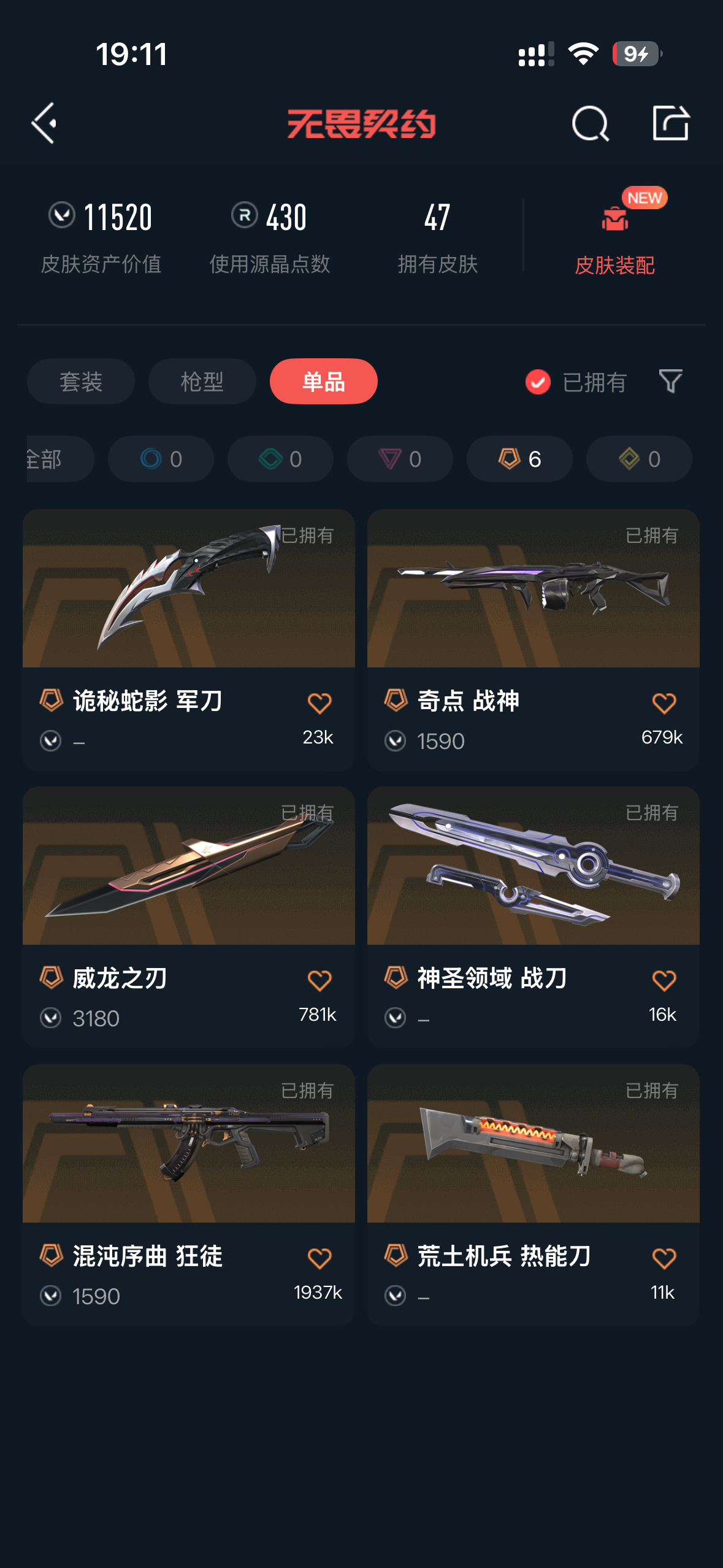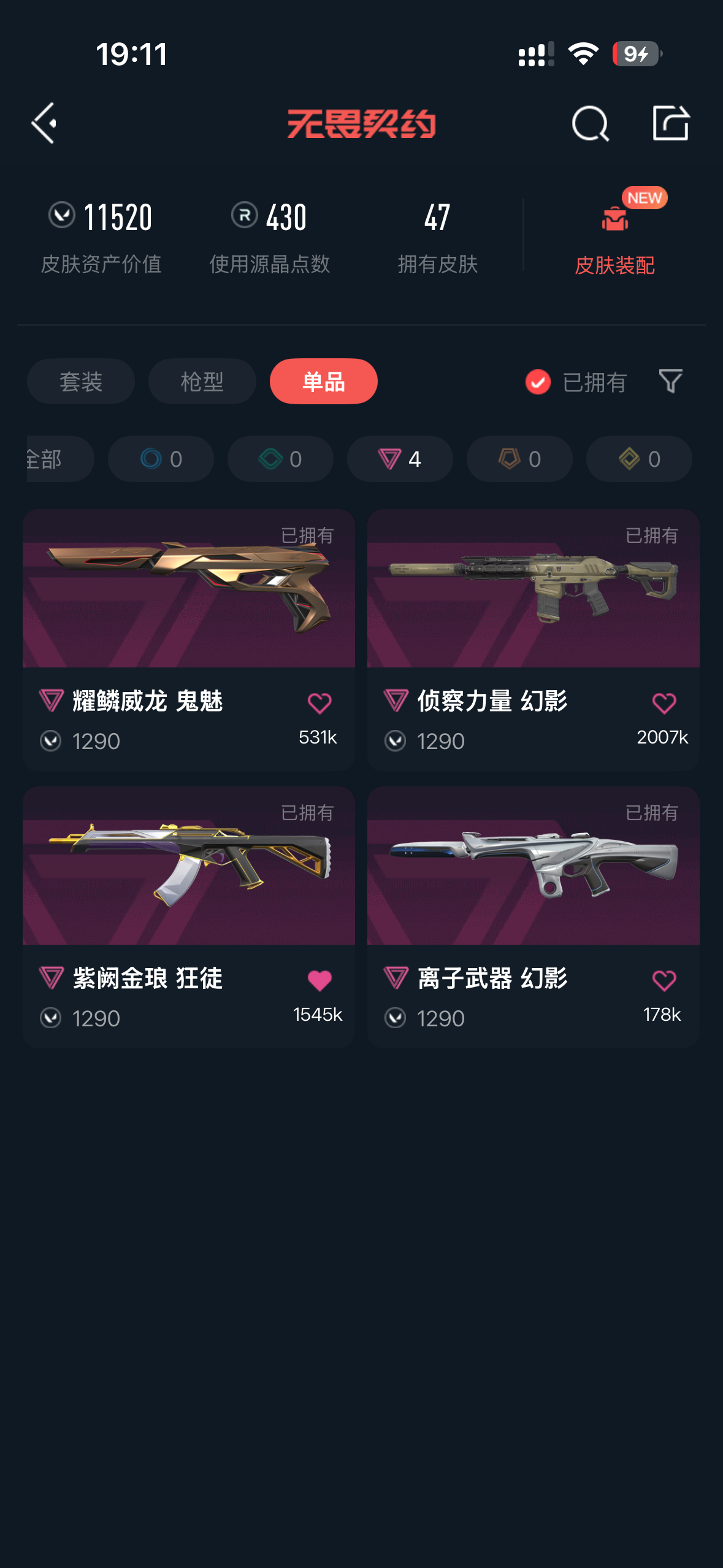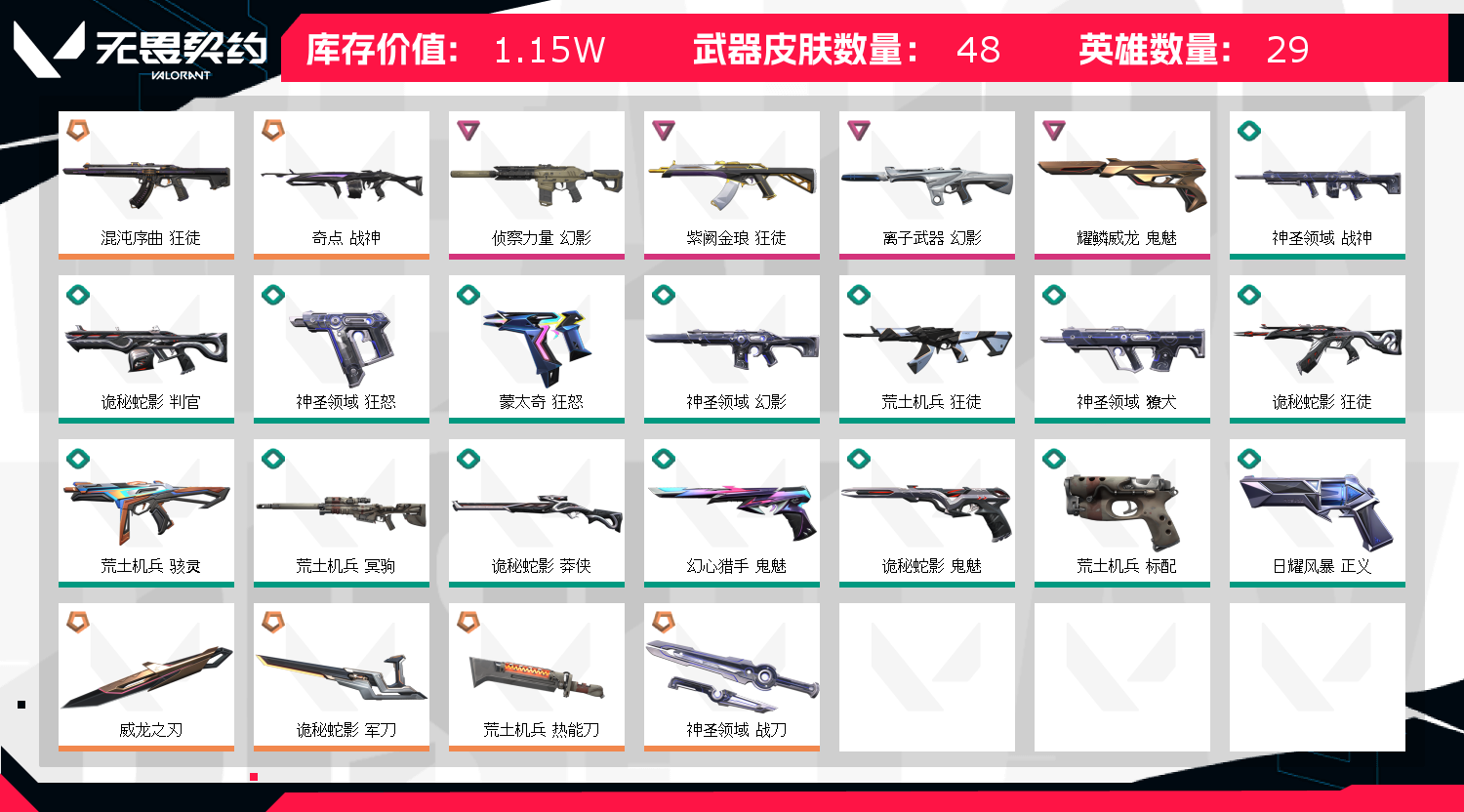 允许 英雄28 武器皮肤数量47;奇点 战神,威龙之刃,侦察力量 幻影,紫阙金琅 狂徒,混沌序曲 狂徒,