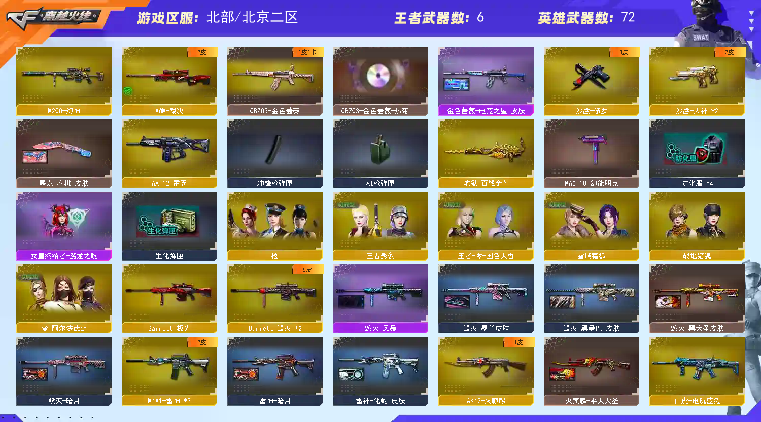 幻神+电竞之星音效卡 爆破全装 丛林匕首炫豹 炫豹手雷套 雷霆手雷套 火麒麟+皮肤 裁决+皮肤 雷神+皮肤 金色蔷薇+皮肤 毁灭+皮肤 巴雷特极光 王者零+王者影豹 玫瑰精灵 ak12-天启 an94超新星 hk417电竞之星 王者之圣 王者之城 aa-12-雷霆 麒麟刺+屠龙+擎天 防弹衣+防弹头盔+C4钳子 生化全幽灵 等… [温馨提示]此号价值数万,已向公安机关报备,如有开G开辅助封号的,由平台提供,身份信息,证据和地址进行报警处理并依法追究责任!祝各位老板玩得开心。 请使用官方启动,更快捷稳定上号。恶意下单维权及检测到外挂将无法再次下单! [温馨提示]排位比赛请勿中途退出游戏,一经发现拉黑处理。;QBZ03-金色蔷薇,M200-幻神,