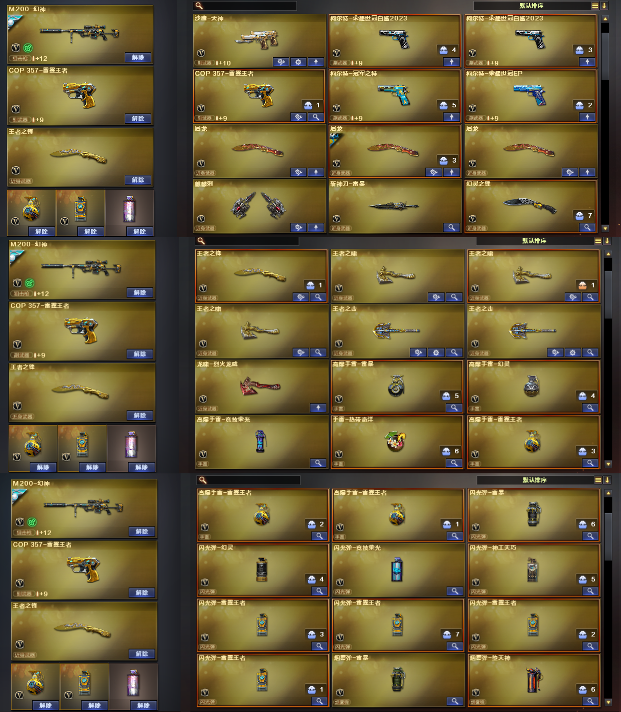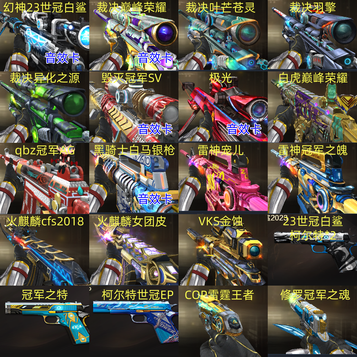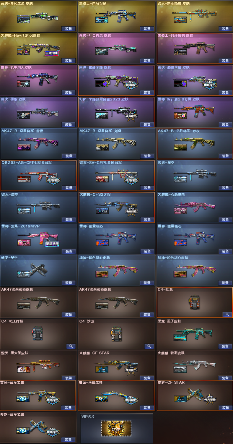 幻神23世冠白鲨+幻神音效卡/裁决巅峰荣耀+叶芒苍灵+羽擎+异化之源+裁决音效卡/毁灭冠军SV+毁灭音效卡/极光+极光音效卡/白虎巅峰荣耀/qbz冠军AG/黑骑士白马银枪+黑骑士音效卡/雷神宠儿+冠军之魄/火麒麟cfs2018+女团皮/VSK金蚀/23世冠白鲨柯尔特*2/冠军之特/柯尔特世冠EP/COP雷霆王者/修罗冠军之魂/角色:4防王者葵貂蝉/4防炫/4防灵狐者职业经理/3防妮妮/VIP6;柯尔特-荣耀世冠白鲨2023,柯尔特-冠军之特,妮妮,RPK-盘龙,QBZ03-金色蔷薇,M200-幻神,Scar Light-白虎,