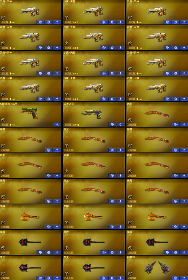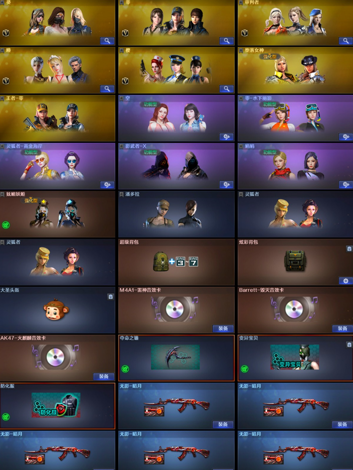 稀有武器】:QBZ03-金色蔷薇(2)/AK47-火麒麟(5)/AK47-麒麟/M4A1-黑龙(7)/M4A1-雷神(9)/M4A1-黑骑士(7)/AK47-无影(8)/AK47-黑武士(5)/Barrett-毁灭(9)/Barrett-极光(9)/AWM-裁决(2)/RPK-盘龙(7)/加特林-炼狱(6)/汤姆逊-烈龙(9) 【王者武器】:盘龙-悦心/炼狱-悦蓝/王者之心/王者之魄/王者之怒/王者之光/王者之力/盘龙-悦心/炼狱-悦蓝 【热门角色】:堕落女神/王者-零/空/潘多拉 【热门音效卡】:M4A1-雷神音效卡/Barrett-毁灭音效卡/AK47-火麒麟音效卡 【热门皮肤】:屠龙-荣耀之锋 【其他亮点】:毒蜂/贝雷塔687-射手座(2)/Glock-18-宙斯;RPK-盘龙,QBZ03-金色蔷薇,