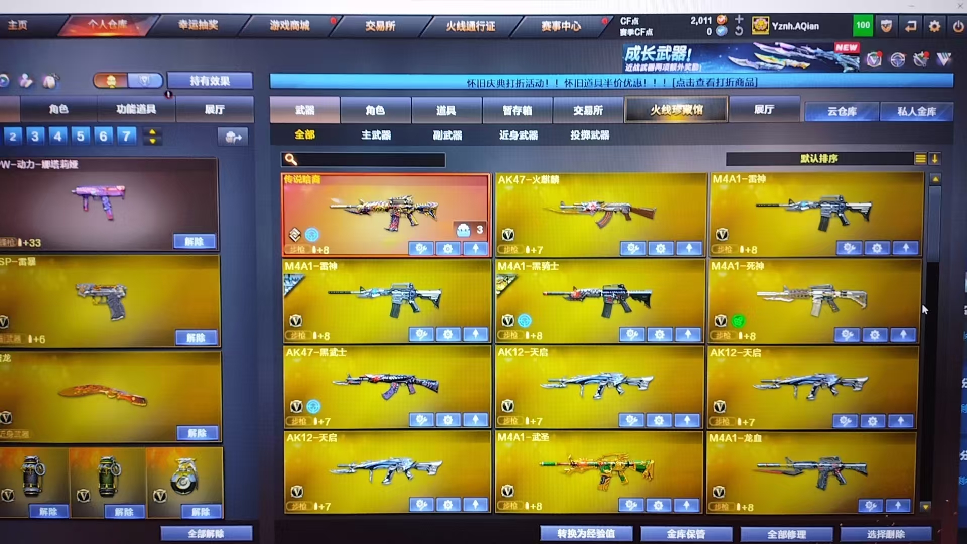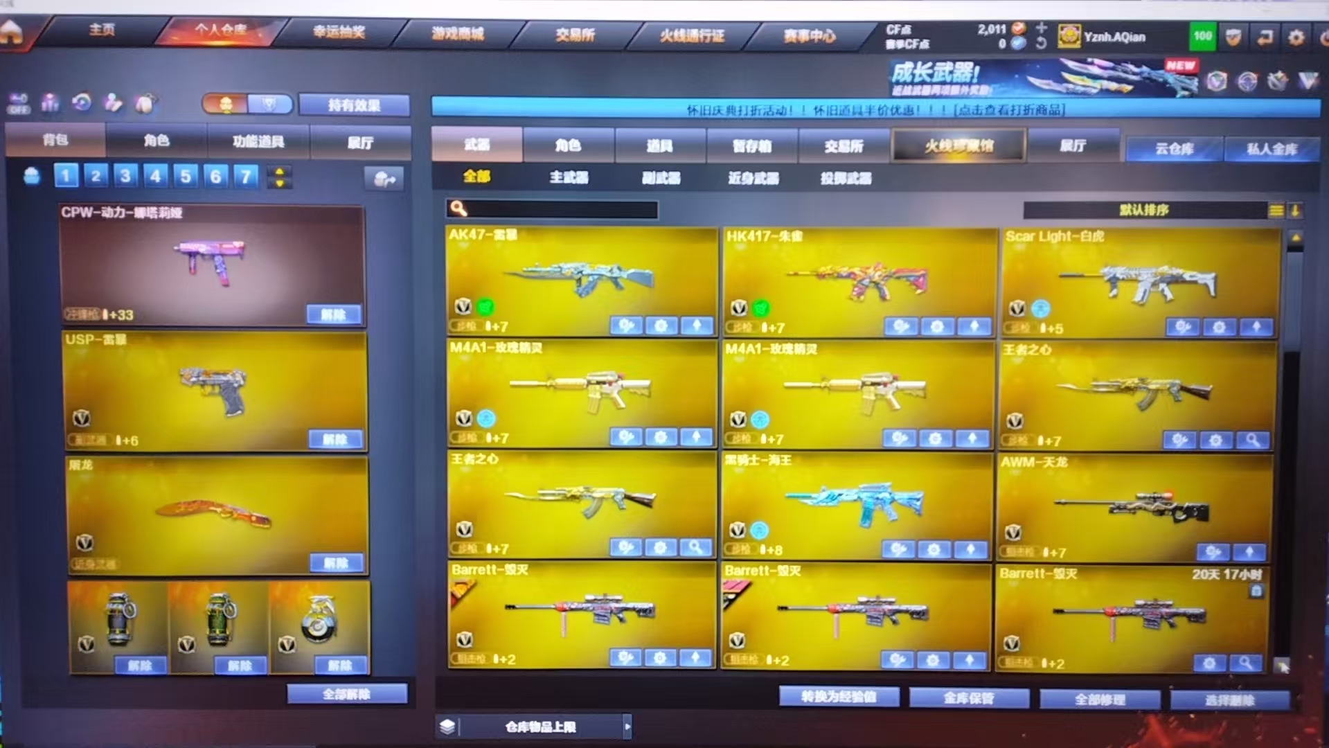 英雄武器数量 94 王者武器数 2;USP-雷暴,RPK-盘龙,M200-幻神,Scar Light-白虎,传说暗裔,