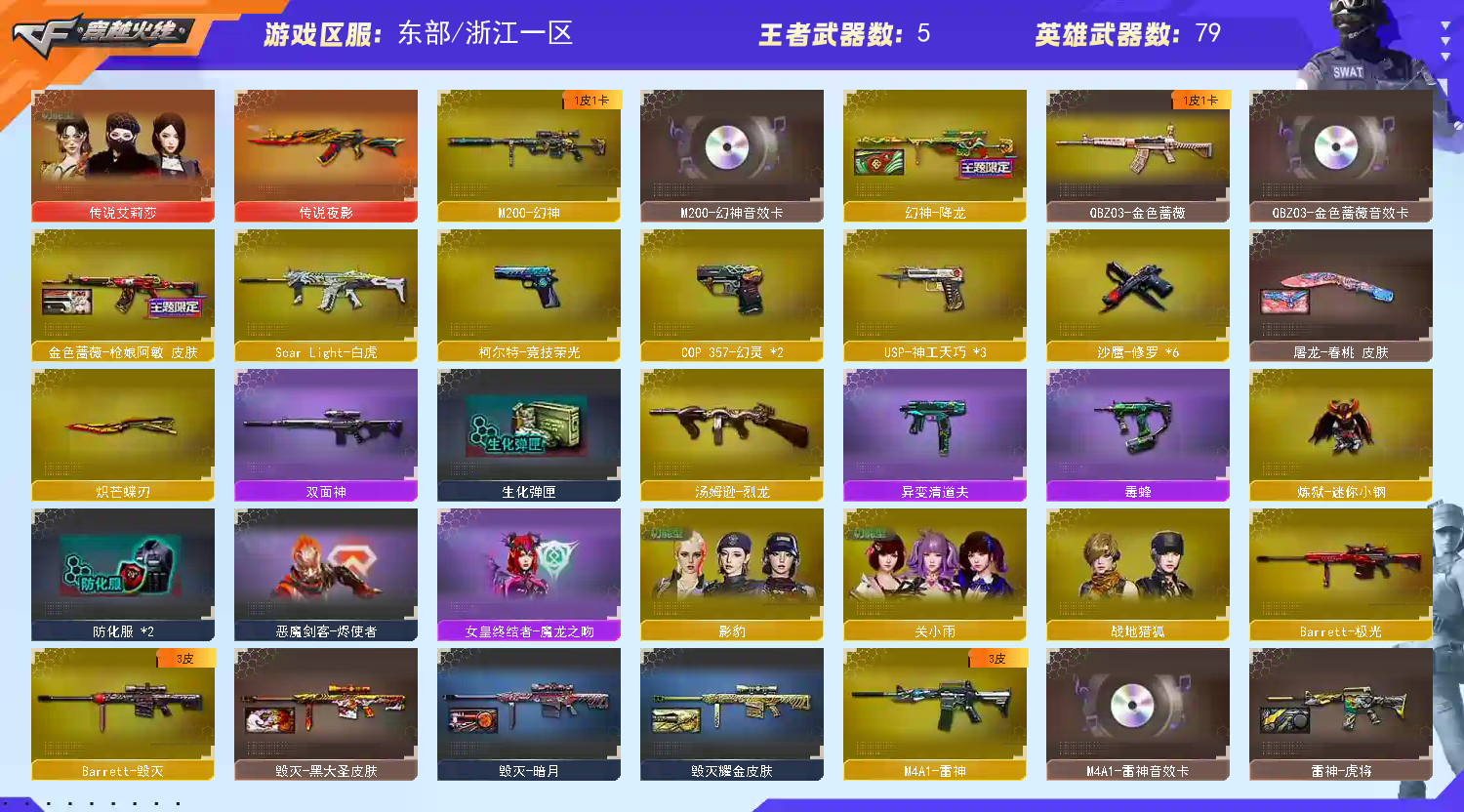 特殊装备有:M4A1-幻灵、、幻灵之锋、高爆手雷-神工天巧、USP-神工天巧、闪光弹-神工天巧、烟雾弹-神工天巧、M4A1-黑骑士、AWM-天龙、麒麟刺、QBZ03-金色蔷薇、闪光弹-竞技荣光、柯尔特-竞技荣光、高爆手雷-竞技荣光、烟雾弹-竞技荣光、Scar Light-白虎、AK47-火麒麟、黑骑士-海王、M200-幻神、M4A1-雷神、Barrett-毁灭、王者之怒-觉醒版、王者青龙、王者玉锋、关小雨、堕天使、圣诞潘多拉-X、生化弹匣、QBZ03-金色蔷薇音效卡、M200-幻神音效卡、M4A1-雷神音效卡、等,随意畅选。 注意事项: A.游戏过程中请不要恶意挂机或者不文明发言 B.恶意挂机、顶号等行为将被拉黑无法再次下单 C.进入游戏后中途请勿退出登陆,否则无法再次上号 D.部分账号由于异地登录可能会出现密码错误提示,通常再尝试5-6次后可;炽芒蝶刃,传说艾莉莎,QBZ03-金色蔷薇,M200-幻神,Scar Light-白虎,