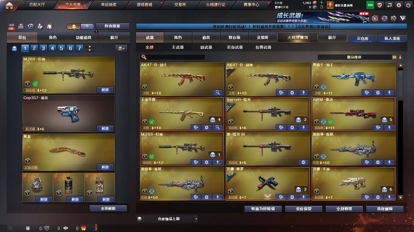 【M200-幻神】【炽芒蝶刃】【AWM-裁决】【QBZ03-金色蔷薇】【2炼狱】【M4A1-雷神+雷神-R.LGD-CFPLS18冠军+雷神-虎将+雷神-维纳斯皮肤】【AK47-火麒麟+火麒麟-CFSTAR】【Barrett-毁灭+毁灭-星空+Barrett-毁灭音效卡】【M4A1-黑骑士+黑骑士-海王】【关小雨/葵-阿尔法武装/龙儿-小淘气/铁扇公主/暗黑审判】【M4A1-死神/M4A1-黑龙/王者之魄-觉醒版/AK12-天启/无影-神兵利器/AK47-黑鲨/AK47-B-战士/AK47-B-战神/AN94-超新星/沙鹰-天神(2)/沙鹰-修罗+修罗-CFSTAR/麒麟刺+麒麟刺-百战金芒/龙啸+龙啸-烈火龙威/屠龙(2)/幻灵之锋/黑武士-锦绣游龙/王者芳薇-觉醒版】【AWM-灵狐-15周年嘉年华(2)/降世魔童/魔能飞环-曼陀罗】【战神-流金岁月皮肤+战神-紫绶金章皮肤+烈龙-星空】;炽芒蝶刃,QBZ03-金色蔷薇,M200-幻神,