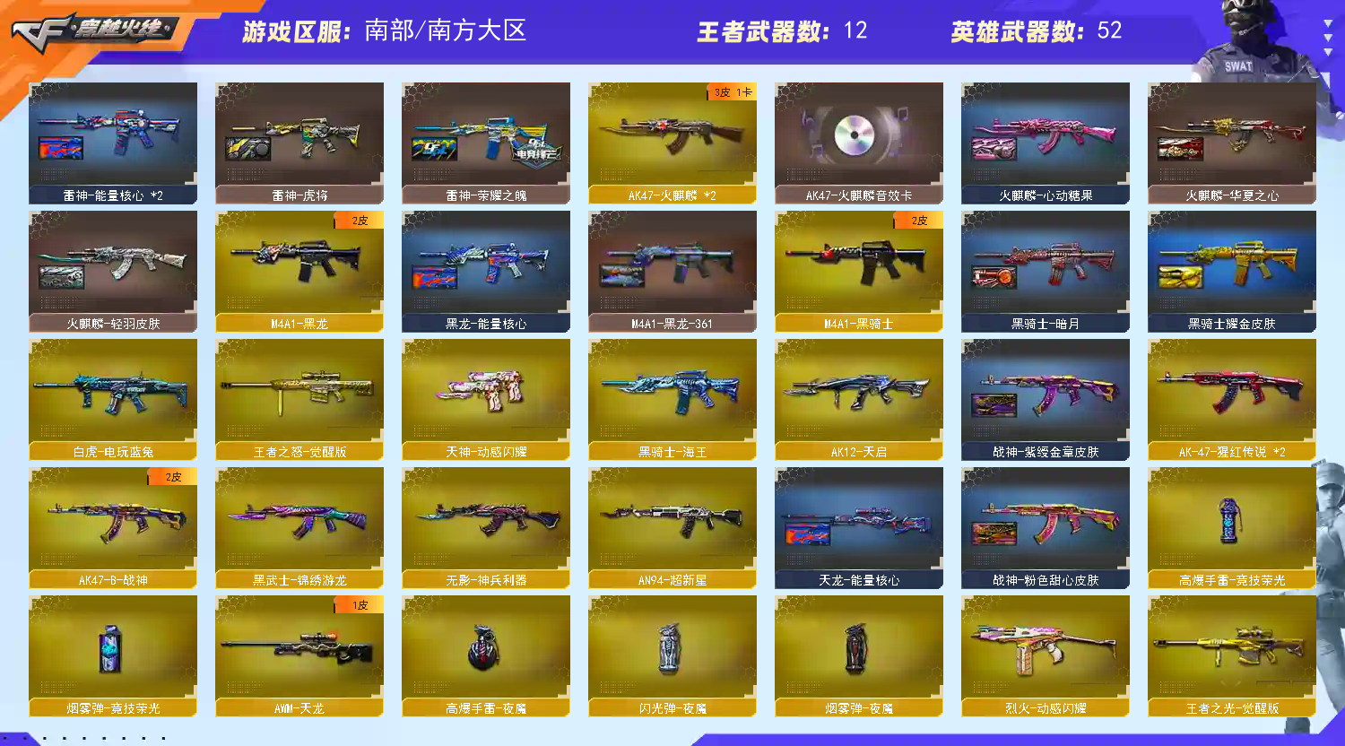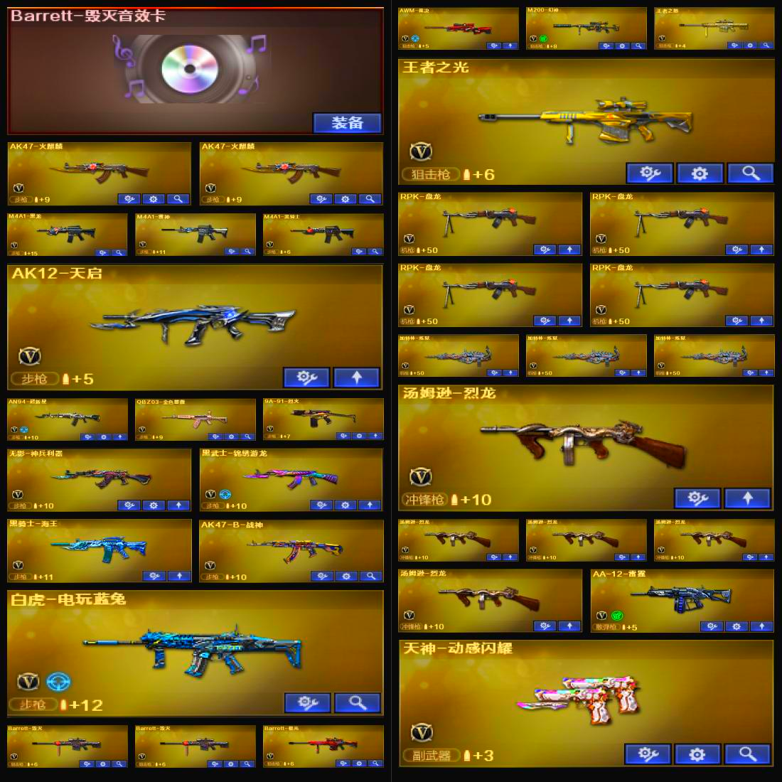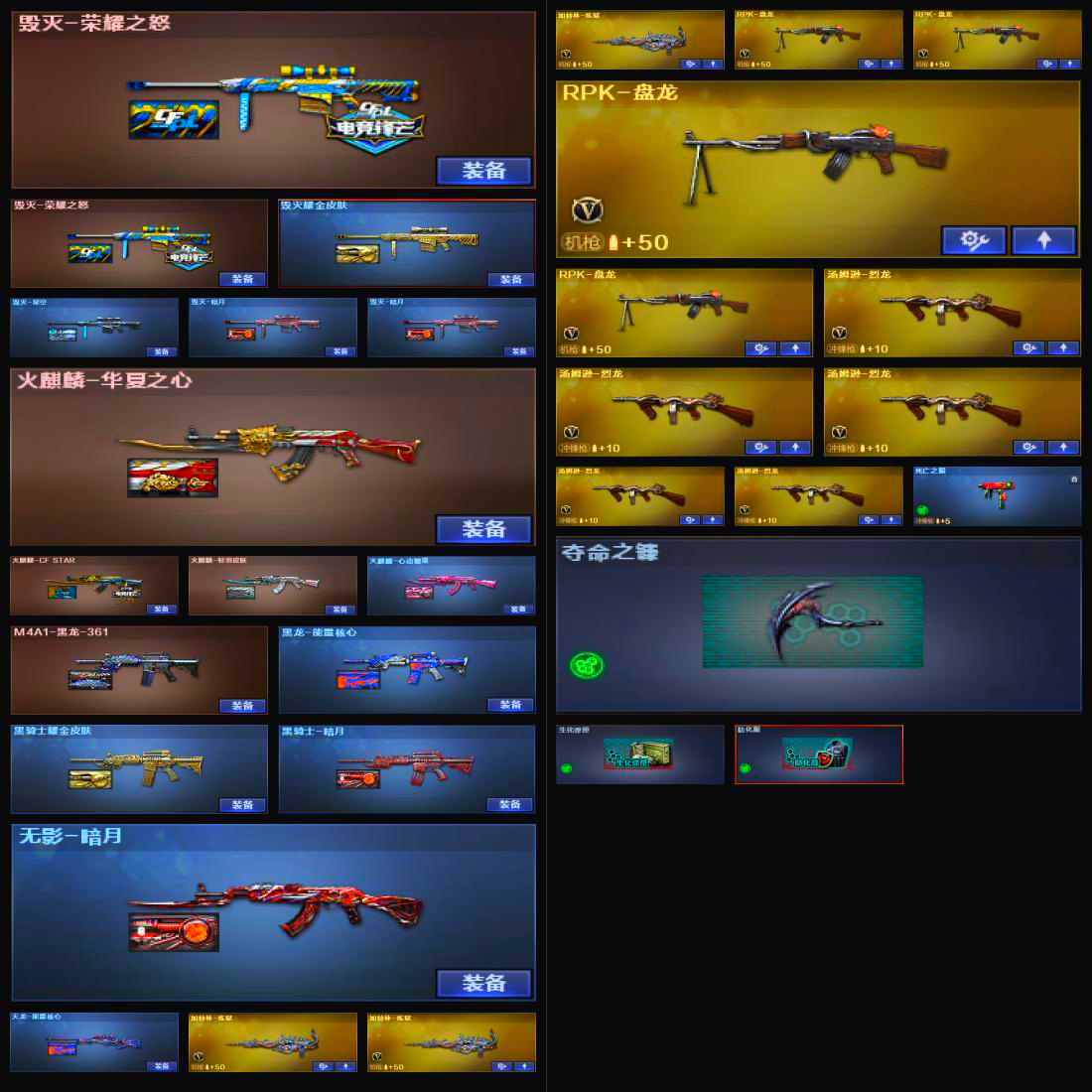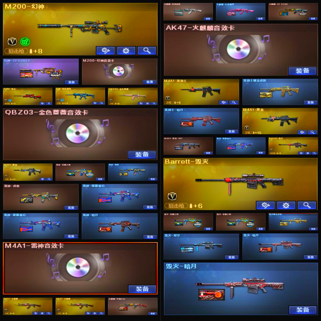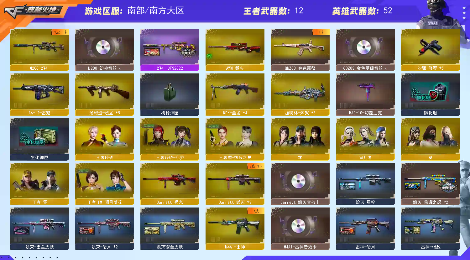 M200幻神+CFS2022皮肤 4盘龙+3烈狱 5烈龙 【英雄武器】_M200-幻神/Barrett-毁灭(2)/Barrett-极光/王者之怒-觉醒版/王者之光-觉醒版/AWM-天龙/AWM-裁决/M4A1-雷神/M4A1-黑龙/M4A1-黑骑士/黑骑士-海王/白虎-电玩蓝兔/AK12-天启/AK47-火麒麟(2)/无影-神兵利器/AK-47-猩红传说(2)/AK47-B-战神/AN94-超新星/QBZ03-金色蔷薇/烈火-动感闪耀/9A91-烈火/RPK-盘龙(4)/汤姆逊-烈龙(5)/AA-12-雷霆/加特林-炼狱(3)/天神-动感闪耀/沙鹰-修罗(5)/麒麟刺/王者之击-觉醒版/屠龙-动感闪耀/屠龙/王者之锋-觉醒版/马来剑-夜魔/手雷-动感闪耀/高爆手雷-夜魔/高爆手雷-竞技荣光/烟雾弹-夜魔/烟雾弹-竞技荣光/闪光弹-夜魔/黑武士-锦绣游龙【重要角色】_葵/_零/审判者/王者玲珑/王者-瞳-闭月羞花/王者玲珑-小乔/王者樱-热浪之夏/王者-零/乔伊教练/幽/电竞少女/铁骑荣耀/空/零-水下丽影/灵狐者-黄金海岸/兰-海滩派对/新灵狐者/;RPK-盘龙,QBZ03-金色蔷薇,M200-幻神,