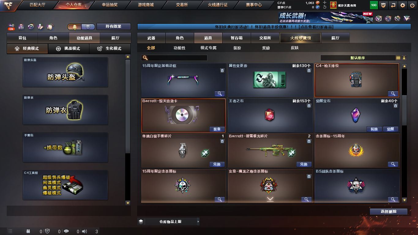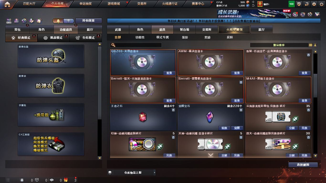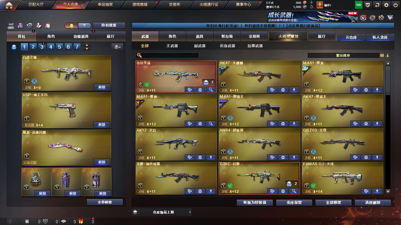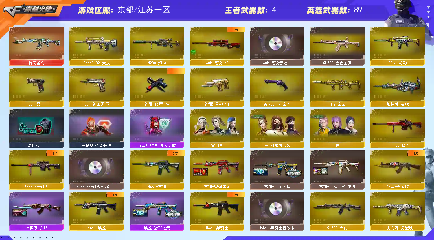【传说圣谕】【M200-幻神】【AWM-裁决(2)+AWM-裁决音效卡】【USP-神工天巧】【G36C-幻影】【QBZ03-金色蔷薇】【QBZ03-天罚+QBZ03-天罚音效卡】【烈龙-云海游龙】【加特林-炼狱】【M4A1-雷神+雷神-动感闪耀皮肤+雷神-冠军之魄+雷神-炽焰魔龙】【AK47-火麒麟+火麒麟-CFSTAR+火麒麟-枪娘凯特琳+火麒麟-百城】【Barrett-毁灭+毁灭-英雄计划皮肤+毁灭-虹光风暴皮肤+Barrett-毁灭-云海游龙音效卡】【M4A1-黑骑士+黑骑士-幻能朋克皮肤+M4A1-黑骑士音效卡】【审判者/鹰/葵-阿尔法武装/虚空/乔伊教练/职业选手/云海玲珑/炽天使】【Barrett-极光/王者猎神-觉醒版/白虎之魄-觉醒版/AK12-天启/无影-神兵利器/AK47-黑武士/AN94-超新星/烈火-动感闪耀/9A91-烈火/天神-动感闪耀/沙鹰-天神(4)/沙鹰-修罗(6)/麒麟刺/擎天(4)/屠龙-动感闪耀/手雷-动感闪耀/高爆手雷-神工天巧/高爆手雷-幻灵(3)/烟雾弹-神工天巧(4)/烟雾弹-幻灵(2)/闪光弹-神工天巧(2)/闪光弹-幻灵/M4A1-苍鸣雷神/机械迷城-穹宇/FAMAS G2-天戎/Barrett-碧霄极光+Barrett-碧霄极光音效卡/Anaconda-玄豹/USP-冥王/麒麟刺-百战金芒/丛林匕首-玄豹/擎天-云海游龙/龙啸-烈火龙威/烟雾弹-玄豹(5)/闪光弹-玄豹(11)/高爆手雷-玄豹(6)/手雷-云海游龙】【火麒麟-零·纪元/M4A1-雷神-精英刀锋/C.A.T/毁灭-孙三炮/AWM-灵狐-15周年嘉年华/蓝色迷你猩红司令_M37/小飞碟-宇航兔兔(2)/魔能飞环-曼陀罗】【天龙-CFSTAR+M4A1-千变-孔明皮肤+黑龙-冠军之武+修罗-冠军之魂+修罗-CFSTAR】【炼狱-百战金芒-庆典舞曲音效卡】;QBZ03-金色蔷薇,G36C-幻影,M200-幻神,传说圣谕,