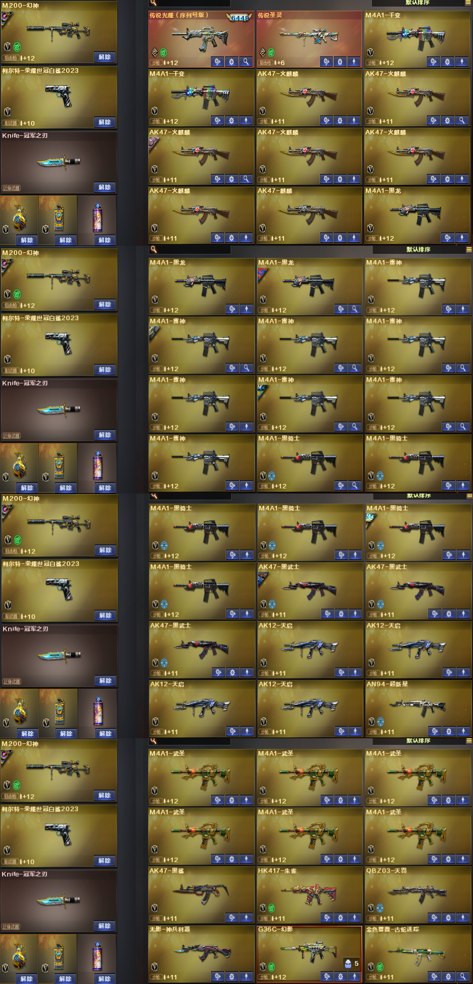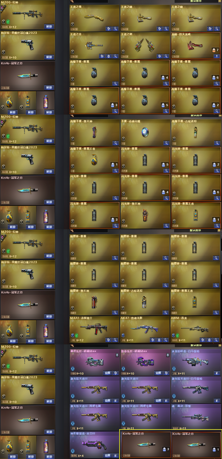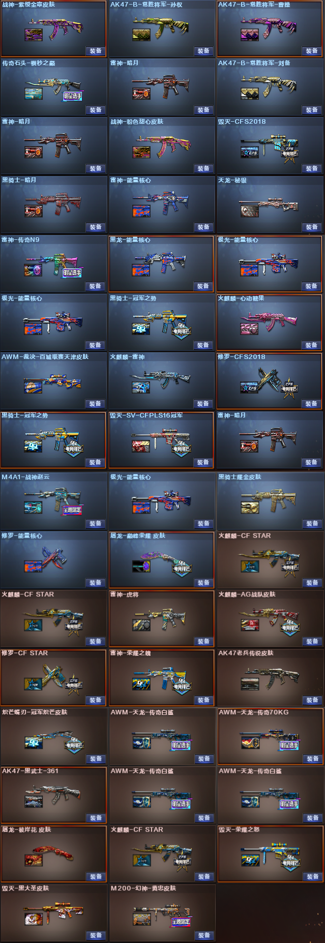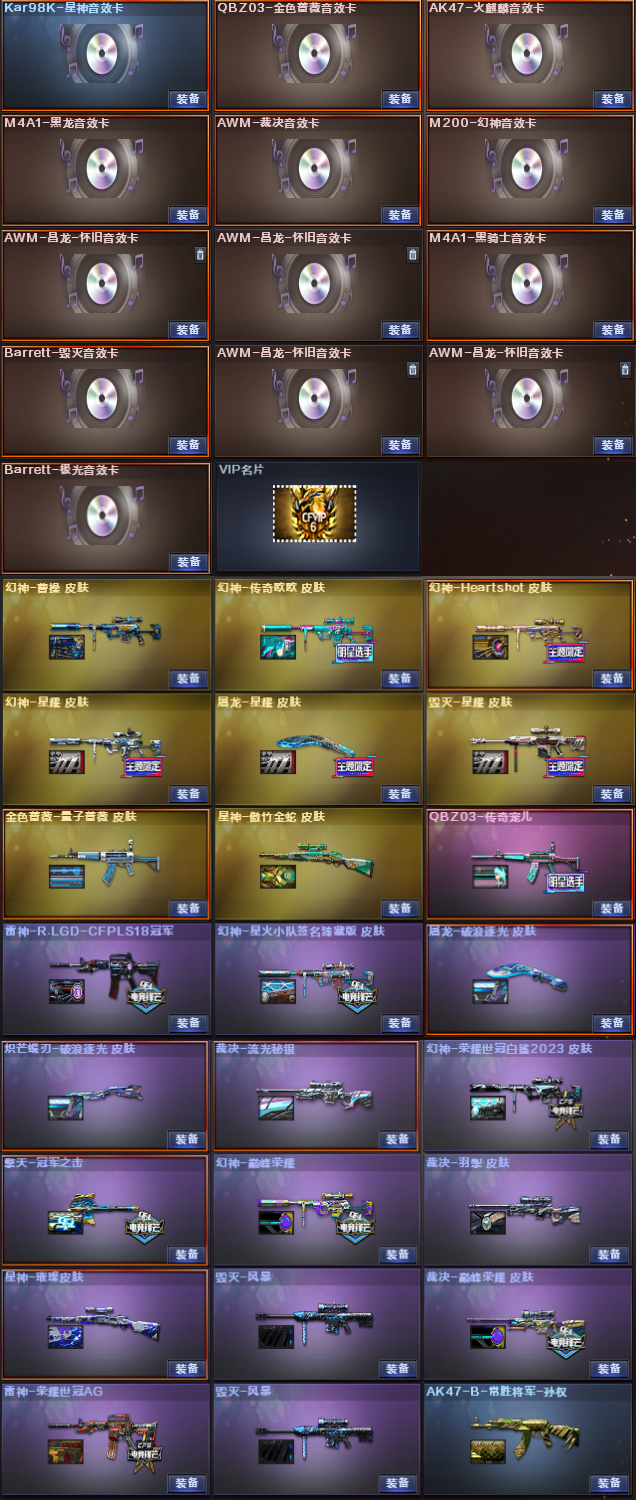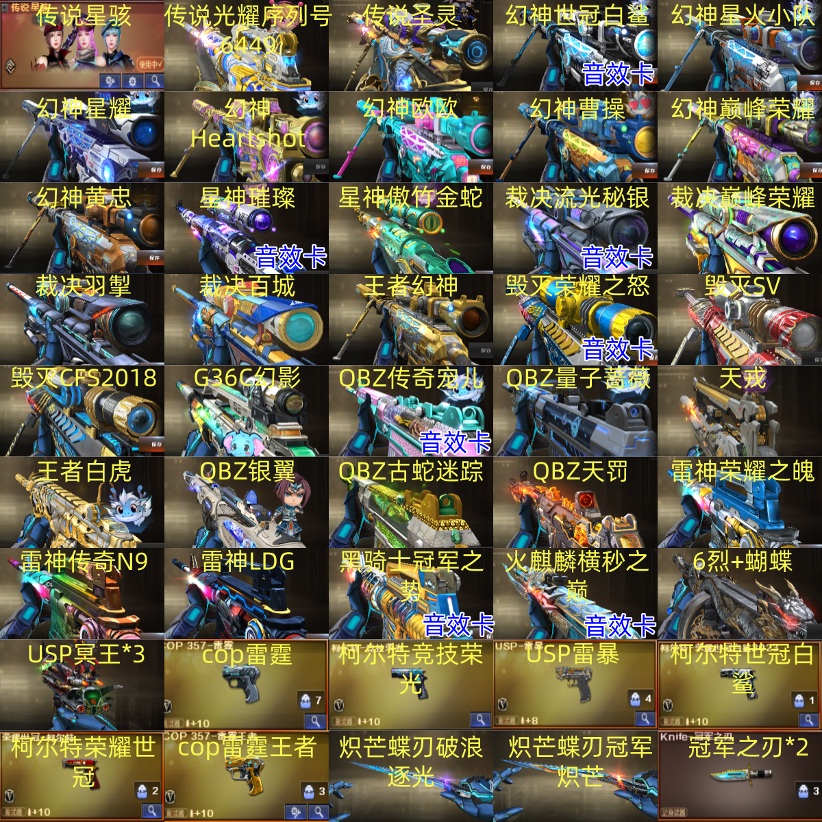 传说星骇/传说光耀序列号6449/传说圣灵/幻神8皮(世冠白鲨/星火小队/星耀/Heartshot/欧欧/曹操/巅峰荣耀/黄忠)+幻神音效卡/星神璀璨+傲竹金蛇+星神音效卡/裁决流光秘银+巅峰荣耀+羽掣+百城+裁决音效卡/王者幻神/毁灭荣耀之怒+SV+CFS2018+毁灭音效卡/G36C幻影/QBZ传奇宠儿+量子蔷薇+QBZ金色蔷薇音效卡/天戎/王者白虎/QBZ银翼/QBZ古蛇迷踪/QBZ天罚/雷神荣耀之魄+传奇N9+LDG/黑骑士冠军之势+黑骑士音效卡/火麒麟横秒之巅+火麒麟音效卡/6烈+斯泰尔蝴蝶/2盘+5炼狱/USP冥王*3/cop雷霆/柯尔特竞技荣光/USP雷暴/柯尔特世冠白鲨/柯尔特荣耀世冠/cop雷霆王者/炽芒蝶刃破浪逐光+冠军炽芒/冠军之刃*2/4防王者春/4防王者葵貂蝉/4防王者瞳闭月羞花/VIP6/;USP-雷暴,荣耀世冠-柯尔特,柯尔特-荣耀世冠白鲨2023,炽芒蝶刃,Knife-冠军之刃,传说星骇,RPK-盘龙,