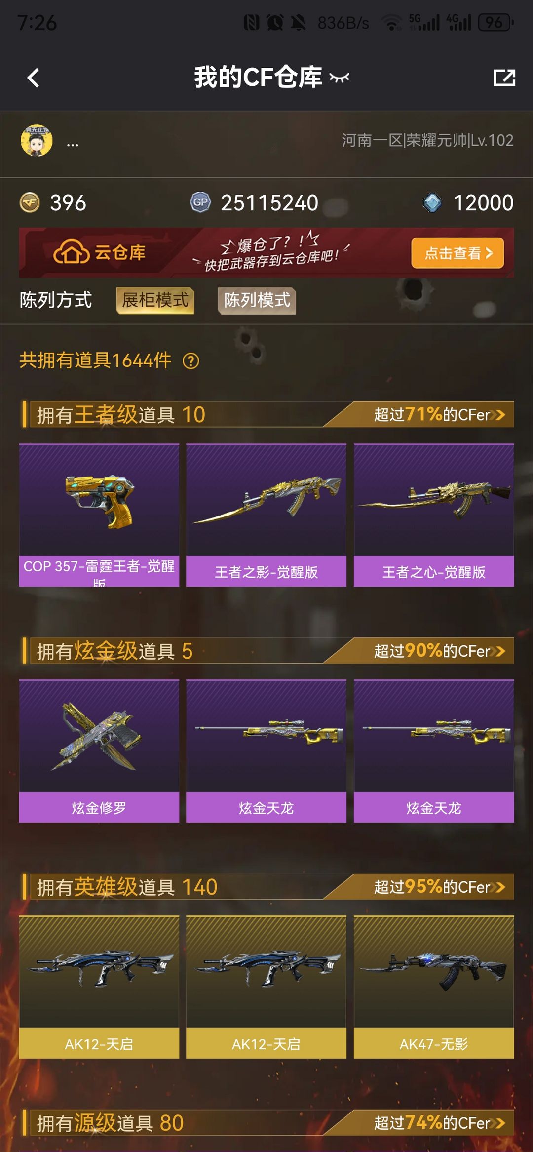 140V全装号 王者武器:雷霆王者之锋;玫瑰精灵-悦动;超新星-悦享-觉醒版;COP 357-雷霆王者-觉醒版;王者之魄闪光弹;王者之影-觉醒版;炫金毁灭;王者之怒-觉醒版;王者之心-觉醒版;炫金天龙;炫金火麒麟;王者之魄-觉醒版;炫金修罗 英雄武器:M4A1-雷神;机械迷城-穹宇;Scar Light-白虎;RPK-盘龙;QBZ03-金色蔷薇;M4A1-青龙;M200-幻神;龙啸-烈火龙威;无影-神兵利器;AK47-火麒麟;闪光弹-竞技荣光;烟雾弹-竞技荣光;高爆手雷-竞技荣光;擎天-竞技荣光;柯尔特-竞技荣光;M200-竞技荣光;M4A1-夜魔;破空枪刃-夜魔;