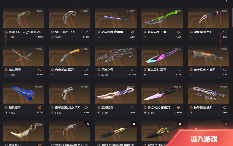 10.6w库存莲花2.0套装电玩套装VCT爪刀;黑波之刃,紫金爪刀,VCT 2025 爪刀,起源 雄鹿,上古龙炎 判官,归零者 獠犬,盖亚的复仇 狂徒,