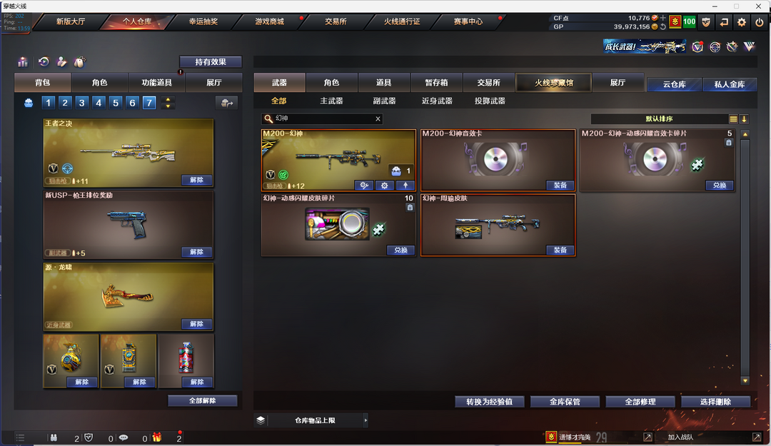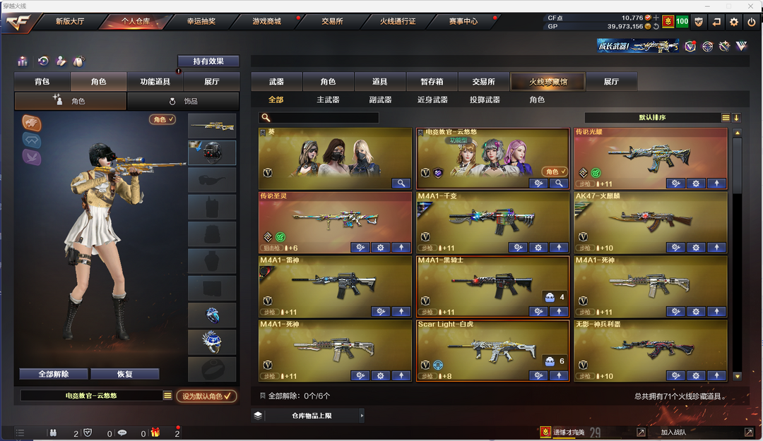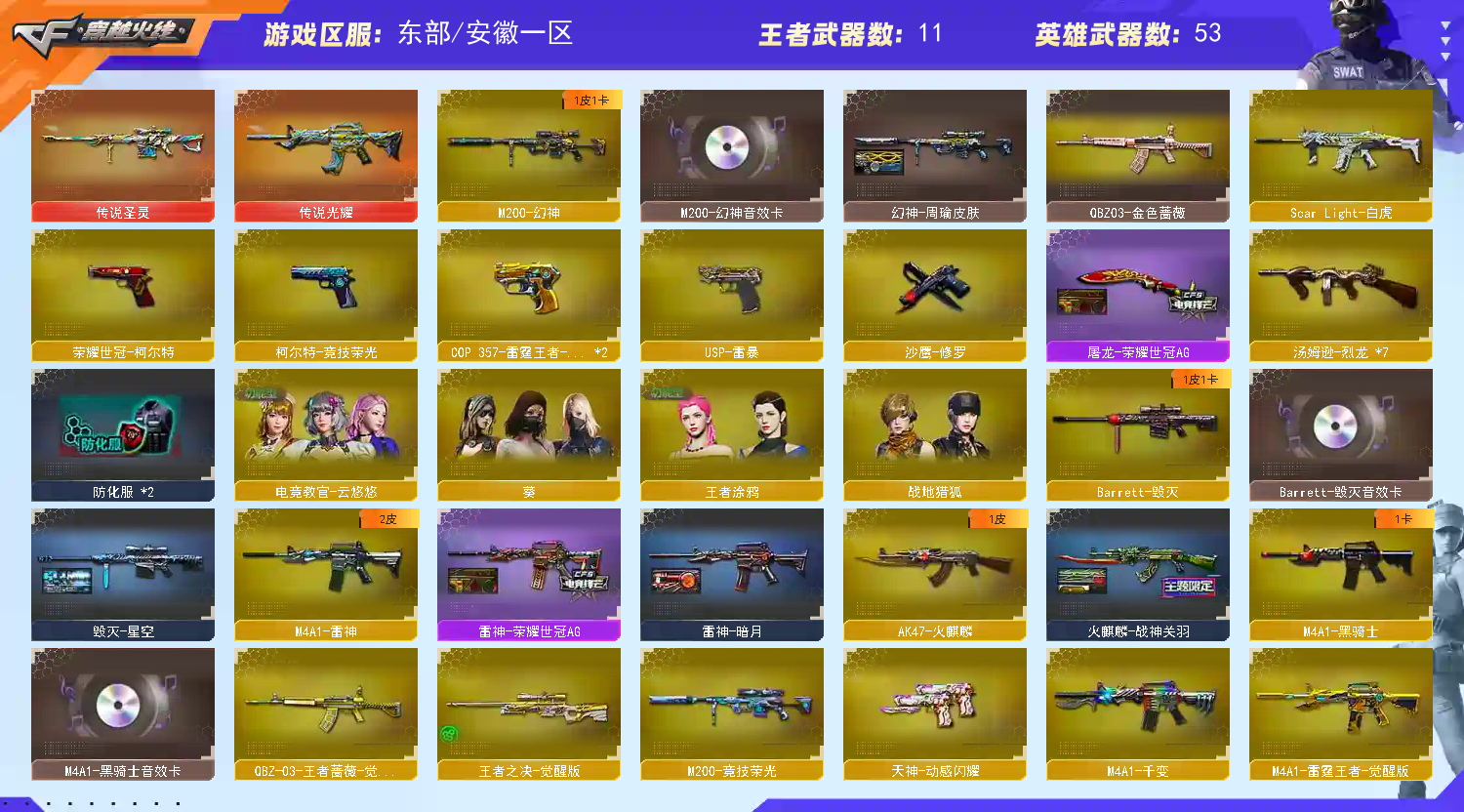 薇-觉醒版;M4A1-雷霆王者-觉醒版;雷霆王者之锋;高爆手雷-雷霆王者;闪光弹-雷霆王者-觉醒版;烟雾弹-雷霆王者-觉醒版;王者之决-觉醒版;炫金雷神 英雄武器:屠龙-动感闪耀;手雷-动感闪耀;天神-动感闪耀;无影-神兵利器;M4A1-黑骑士;M200-幻神;AK47-火麒麟;闪光弹-竞技荣光;高爆手雷-竞技荣光;擎天-竞技荣光;USP-雷暴;柯尔特-竞技荣光;M200-竞技荣光;烟雾弹-竞技荣光;擎天;屠龙;荣耀世冠-柯尔特;M4A1-千变;汤姆逊-烈龙;M4A1-雷神;9A91-烈火;传说光耀;QBZ03-金色蔷薇;沙鹰-修罗;烟雾弹-幻灵;高爆手雷-幻灵;M4A1-死神;传说圣灵;闪光弹-幻灵;幻灵之锋;Scar Light-白虎;Barrett-毁灭;USP-雷暴,荣耀世冠-柯尔特,电竞教官-云悠悠,QBZ03-金色蔷薇,M200-幻神,Scar Light-白虎,
