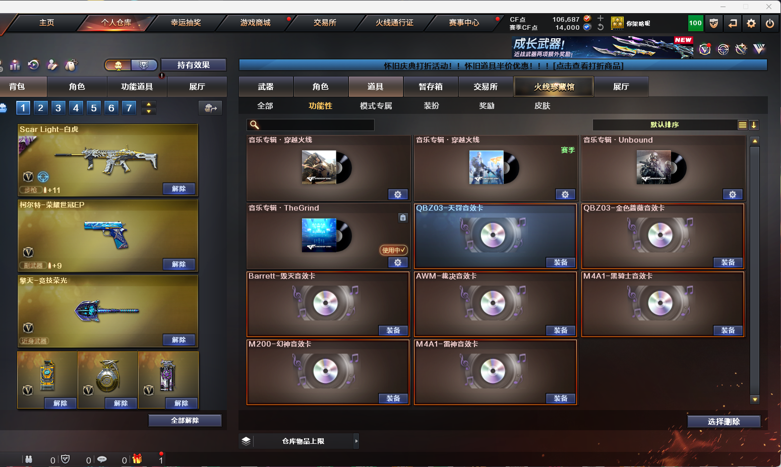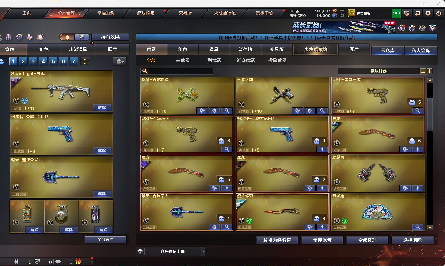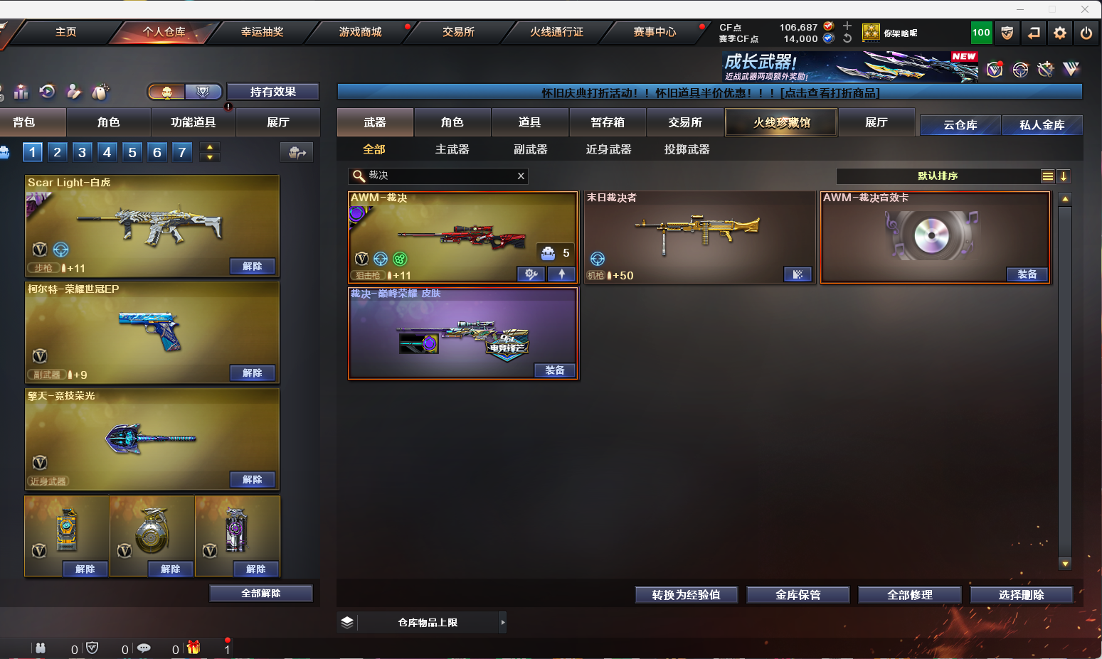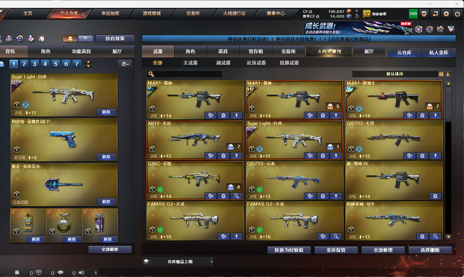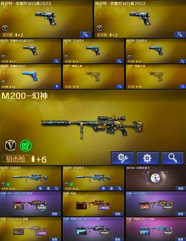 【幻神三件套/QBZ三件套/裁决三件套/雷神三件套/黑骑士三件套/毁灭三件套/竞技荣光套】 【英雄级武器】:AK12-天启/AWM-裁决/AA-12-雷霆/Barrett-毁灭/炽芒蝶刃/Kar98K-星神/柯尔特-竞技荣光(2)/M4A1-雷神(2)/M4A1-黑骑士/M4A1-猎神(2)/M200-幻神/M200-竞技荣光(2)/QBZ03-天罚/麒麟刺/擎天-竞技荣光/荣耀世冠-龙啸(2)/沙鹰-天神(2)/屠龙(3)/VSK-94-金蚀/ScarLight-白虎/G36C-幻影/QBZ03-云龙/FAMASG2-天戎(2)/QBZ03-金色蔷薇/QBZ-03-王者蔷薇-觉醒版/王者之决-觉醒版(2)/柯尔特-荣耀世冠白鲨2023(3)/王者之魂-觉醒版/修罗-古蛇迷踪/雷霆王者之锋-觉醒版/高爆手雷-雷暴(2)/高爆手雷-竞技荣光(6)/高爆手雷-云龙(2)/高爆手雷-古蛇迷踪/高爆手雷-玄豹(2)/闪光弹-竞技荣光(7)/闪光弹-云龙(2)/闪光弹-雷霆王者-觉醒版(2)/烟雾弹-竞技荣光(6)/烟雾弹-云龙/烟雾弹-古蛇迷踪/烟雾弹-玄豹(3) 【王者炫金武器】:青龙之魄/王者凤吟/USP-雷暴王者(2) 【音效卡】:AWM-裁决音效卡/M200-幻神音效卡/M4A1-黑骑士音效卡/Barrett-毁灭音效卡/QBZ03-金色蔷薇音效卡/M4A1-雷神音效卡/QBZ03-天罚音效卡 【皮肤】:AK47-火麒麟-传奇EVEN/传奇石头-横秒之巅/幻神-AG-CFPLS17冠军/幻神-丹凤/幻神-CFS2022/幻神-Heartshot皮肤/毁灭-暗月/黑骑士-冠军之势/金色蔷薇-Heartshot皮肤/雷神-荣耀之魄/雷神-杨戬/雷神-R.LGD-CFPLS18冠军/QBZ03-荣耀世冠白鲨/ScarLight-白虎-暗星/屠龙-荣耀之锋/屠龙-荣耀世冠AG/幻神-荣耀世冠白鲨2023皮肤/幻神-荣耀世冠EP皮肤/QBZ03-巅峰荣耀皮肤/金色蔷薇-破浪逐光皮肤/裁决-巅峰荣耀皮肤/星神-黯钢战甲皮肤/黑武士-典韦皮肤/屠龙-破浪逐光皮肤/屠龙-巅峰荣耀皮肤(2)/炽芒蝶刃-冠军炽芒皮肤/炽芒蝶刃-荣耀世冠白鲨2023皮肤 【道具】:BS战队炫彩背包/CFS限定背包/亚洲杯纪念炫彩背包/古蛇迷踪炫彩背包/臻选金狐背包/超级背包/迷你冰龙背包/女皇终结者-魔龙之吻/救世主-黑桃战神/绿色巨人/灵魂忍者/变异宝贝/迷雾幽灵/生化弹匣/夺命之镰/防化服(2)/巅峰赛先锋-金色流光/流光-鎏金之域/枪王排位28赛季金色流光/枪王排位29赛季金色流光/古蛇迷踪特效/蛇隐宗表情/电玩兔兔表情/动感闪耀表情/CFPL选手表情-第2套/防弹头盔(2)/防弹衣(2)/C4工具钳(2)/手雷包(2) 【人偶武器】:巴雷特-零-水下丽影/M37-葵/迷你曼提柯尔/迷你火种/生化手雷-机甲核心(2)/COP-白鲨 【挑战大师】:火狱乱世-超越Max/试炼破坏者III 【角色】:电竞教官-云悠悠/机械姬/雨棠/雨墨/王者云悠悠/蛇隐宗/奇洋探员/暗夜-X/猎狐者-追月/蛇姬;USP-雷暴王者,柯尔特-荣耀世冠白鲨2023,炽芒蝶刃,Knife-冠军之刃,电竞教官-云悠悠,妮妮,QBZ03-金色蔷薇,