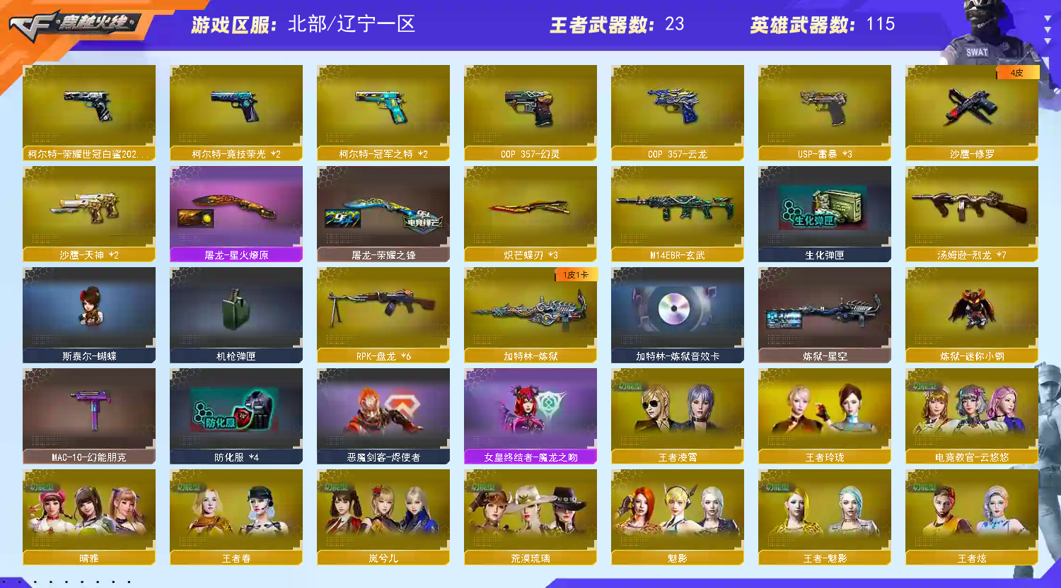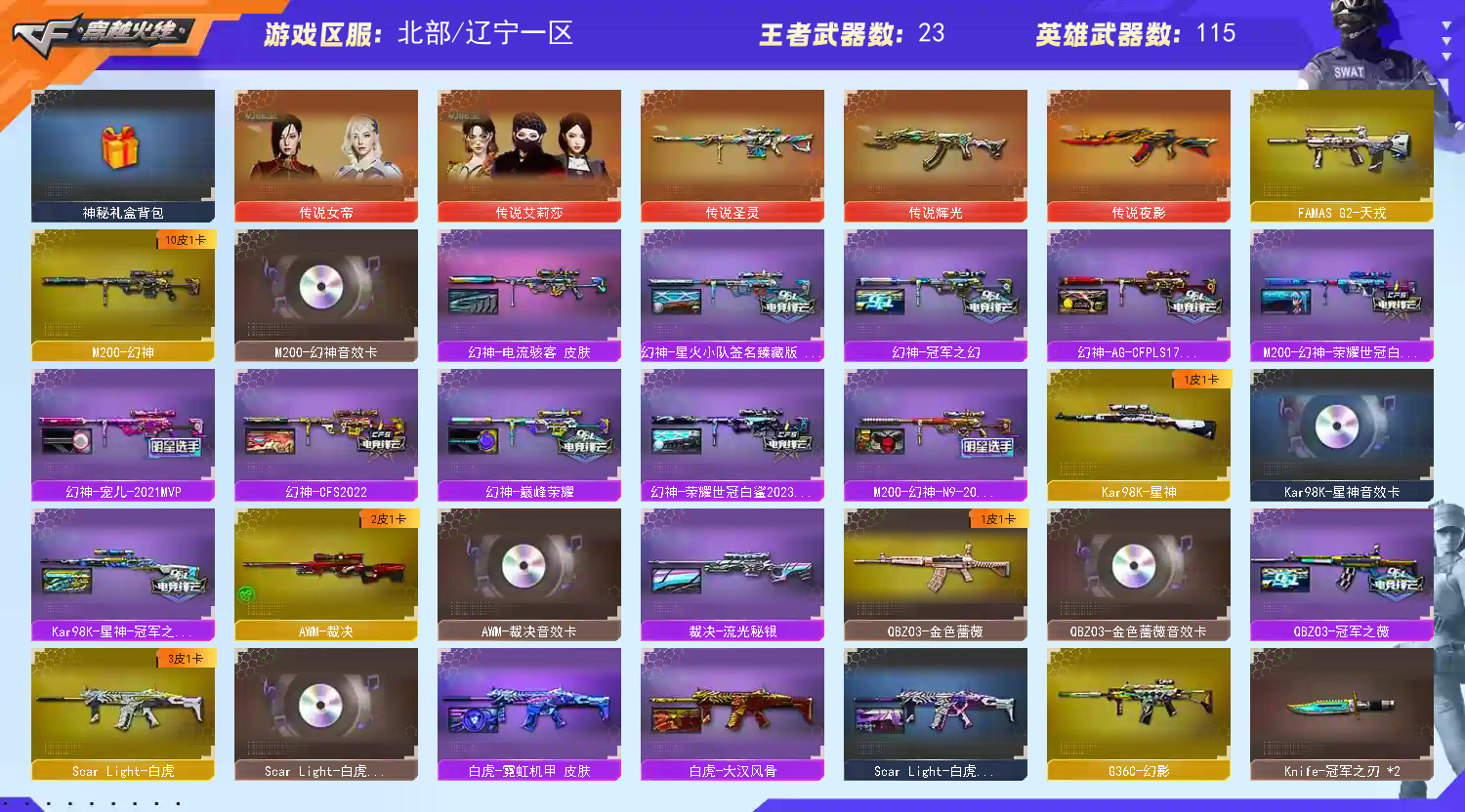 单字金名:磁.传说女帝艾丽莎.幻神10皮带卡.裁决三件套.10质量副手.全主流音效.雷神10周年臻藏;USP-雷暴,柯尔特-荣耀世冠白鲨2023,柯尔特-冠军之特,炽芒蝶刃,Knife-冠军之刃,传说女帝,电竞教官-云悠悠,