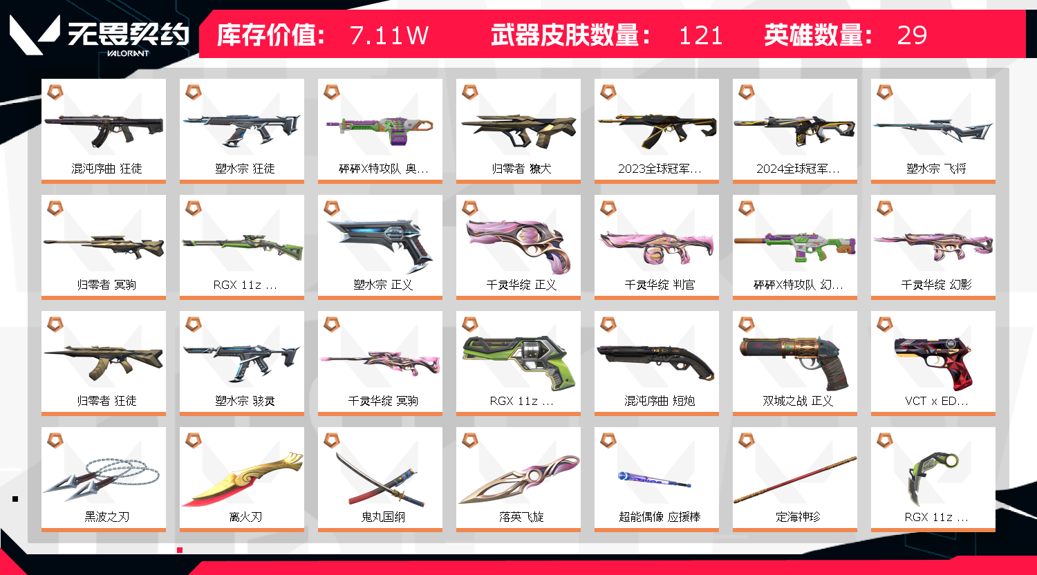 允许 英雄28 武器皮肤数量119;砰砰X特攻队 奥丁,黑波之刃,离火刃,归零者 獠犬,紫阙金琅 狂徒,天界神兵 戍卫,混沌序曲 狂徒,