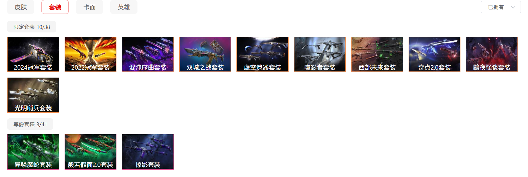 14万库存♥2224冠军套♥西部未来套♥掠影套♥混沌序曲套♥光明哨兵套♥虚空遗器套♥奇点2.0套