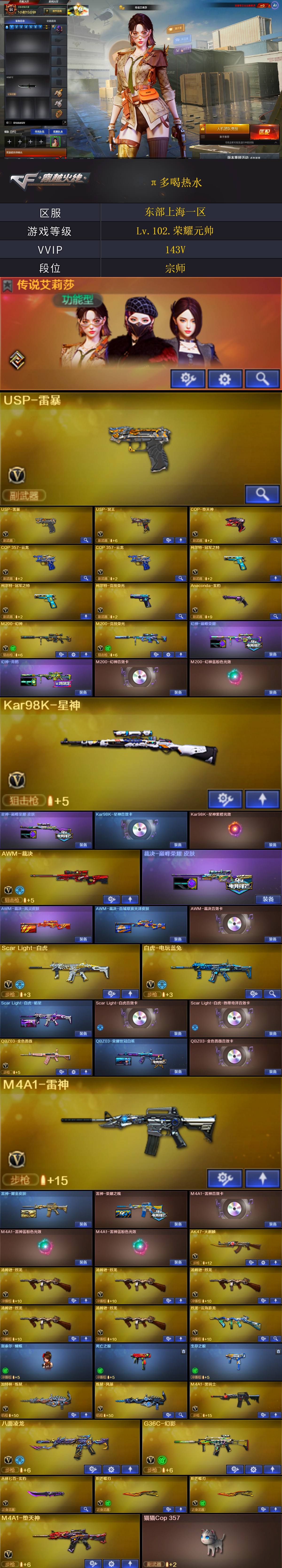 【商品标题】:东部上海一区-143V-可二次实名-【Lv.102.荣耀元帅】-【段位:宗师】 【稀有武器】:M200-幻神/Kar98K-星神/八面凌龙/G36C-幻影/ScarLight-白虎/M4A1-堕天神/USP-雷暴(2)/COP-堕天神/柯尔特-竞技荣光/天神-动感闪耀/COP357-云龙(2)/修罗-古蛇迷踪/柯尔特-冠军之特(2)/金色蔷薇-古蛇迷踪/QBZ03-金色蔷薇/AK47-火麒麟/M4A1-黑龙/M4A1-雷神/M4A1-黑骑士/AK47-无影/AK47-黑武士/白虎-电玩蓝兔/Barrett-毁灭/Barrett-极光/AWM-裁决/M200-竞技荣光/加特林-炼狱/炼狱-风暴/汤姆逊-烈龙(5)/AA-12-雷霆/炽芒蝶刃(2)/斩神刀-雷暴/麒麟刺-堕天神/龙啸-堕天神(2)/幻灵之锋/擎天-竞技荣光 【王者武器】: 【热门角色】:传说艾莉莎/电竞教官-云悠悠/华/迷迭香/奇洋探员/乔伊教练/蛇隐宗/潘多拉-X/兔囡囡/潘多拉 【热门音效卡】:M200-幻神音效卡/Kar98K-星神音效卡/AWM-裁决音效卡/Scar Light-白虎音效卡/QBZ03-金色蔷薇音效卡/M4A1-雷神音效卡/Barrett-毁灭音效卡/M4A1-黑骑士音效卡/M4A1-黑龙音效卡/Barrett-极光音效卡 【热门皮肤】:幻神-巅峰荣耀/幻神-青鹤/裁决-巅峰荣耀皮肤/星神-巅峰荣耀 皮肤/QBZ03-荣耀世冠白鲨/ScarLight-白虎-暗星/屠龙-荣耀之锋/雷神-荣耀之魄 【其他亮点】:斯泰尔-蝴蝶/MK5-炽火炎龙/VEPR-12-金魔/金刚伞-电玩红兔/猫猫Cop357 (截图展示段位不代表实际段位,如赛季更新等不可抗拒因素发生变化,其余道具看截图或咨询客服);USP-雷暴,柯尔特-冠军之特,炽芒蝶刃,电竞教官-云悠悠,传说艾莉莎,QBZ03-金色蔷薇,G36C-幻影,