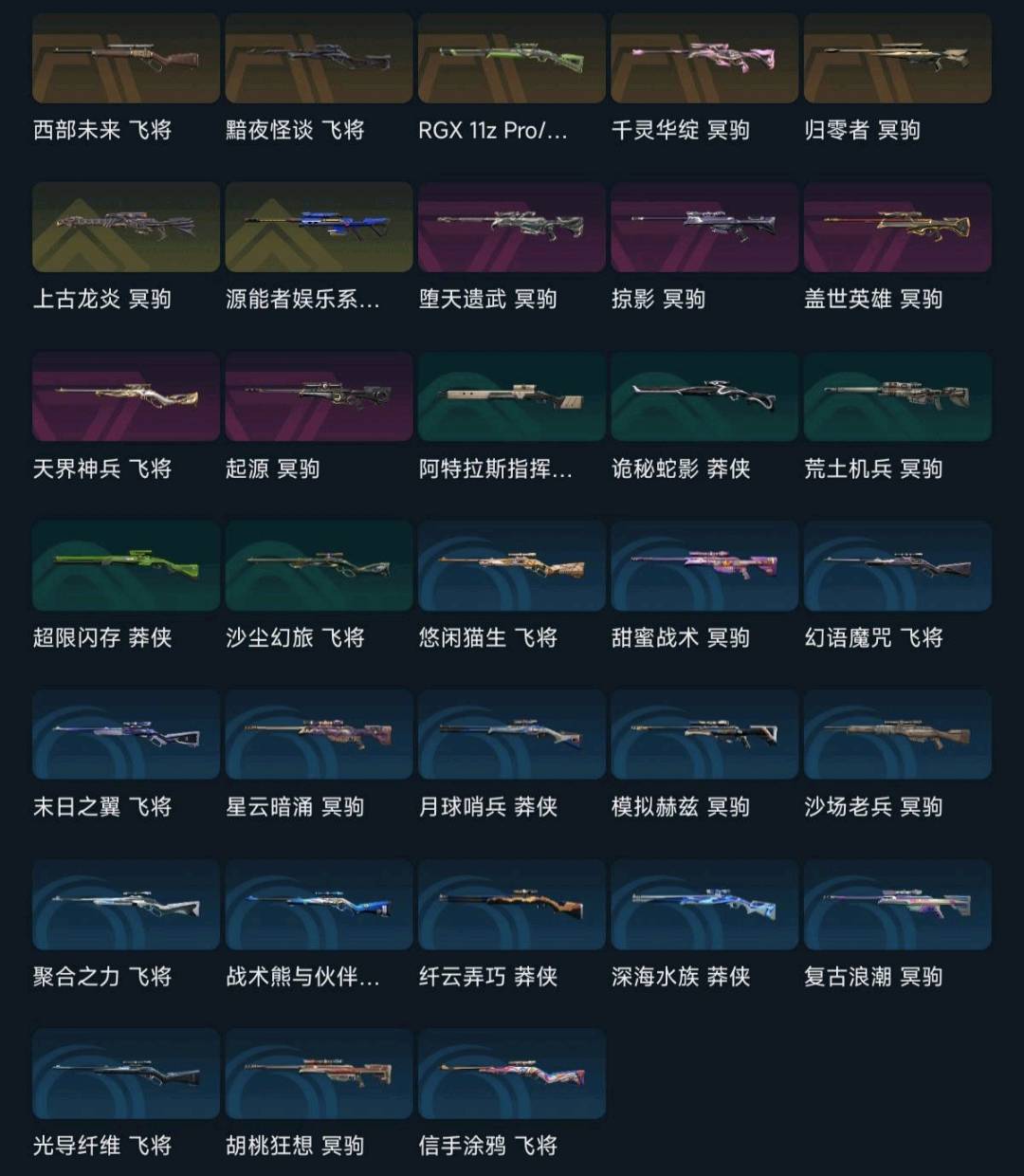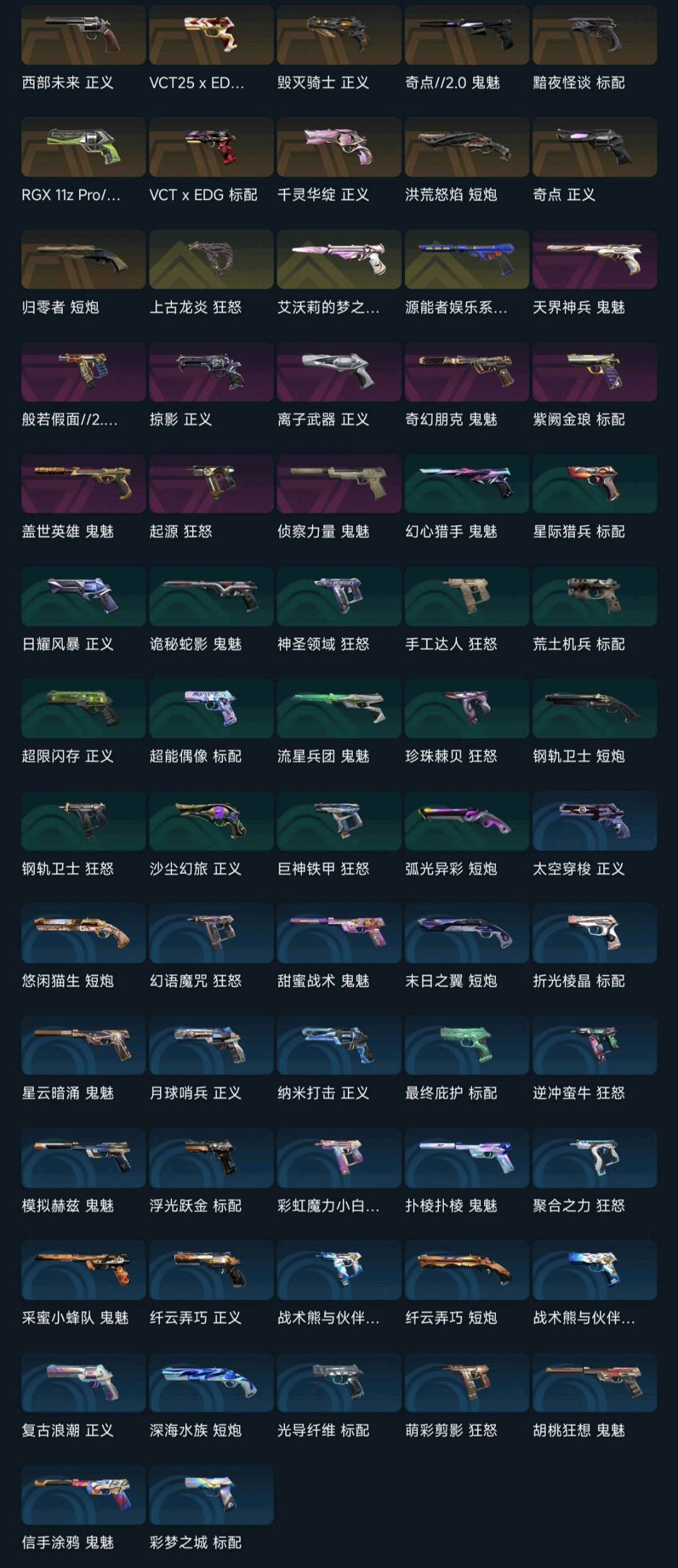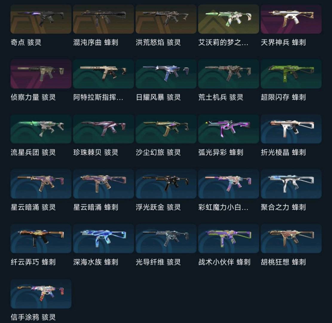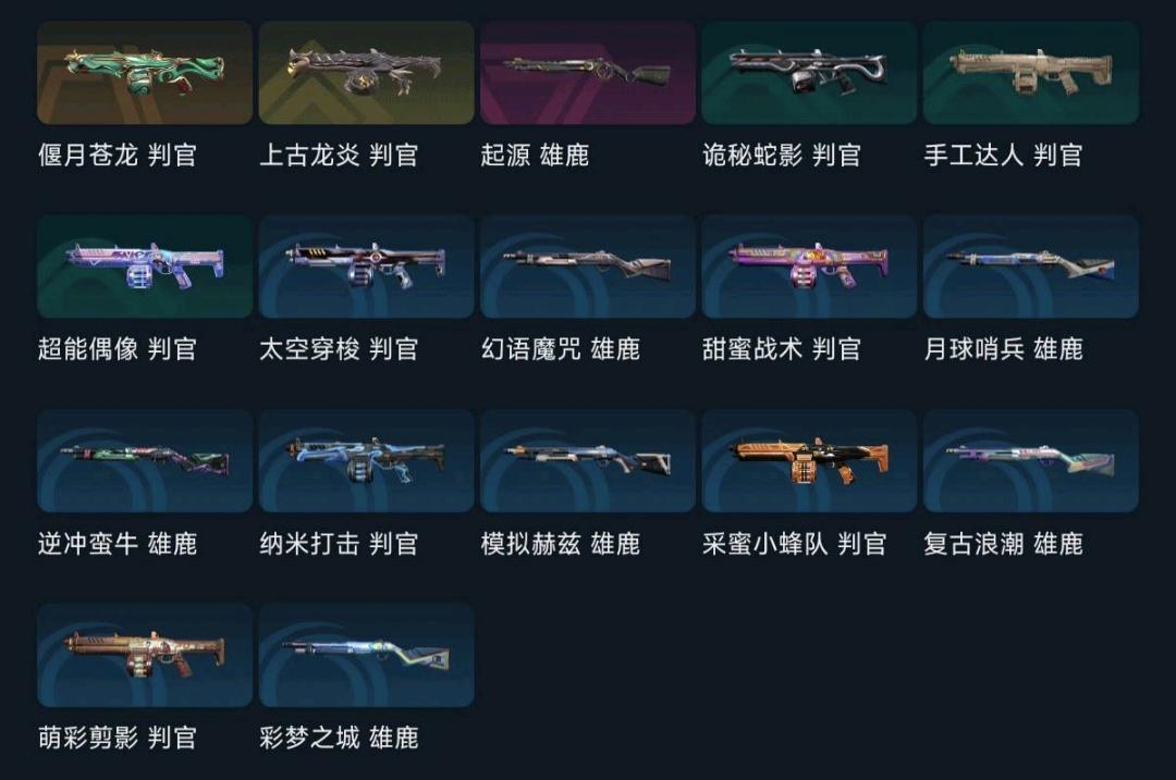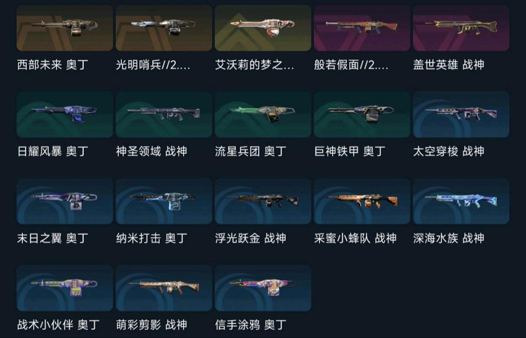 大部分热门武器都有,近战武器多,全英雄 排位打的比较少,可以打排位 段位较低;艾沃莉的梦之翼 奥丁,西部未来 奥丁,紫金爪刀,VCT 2025 爪刀,起源 雄鹿,偃月苍龙 判官,上古龙炎 判官,