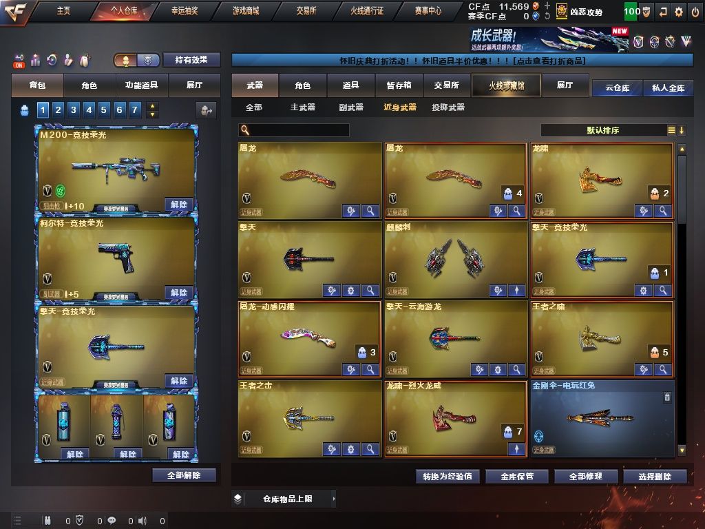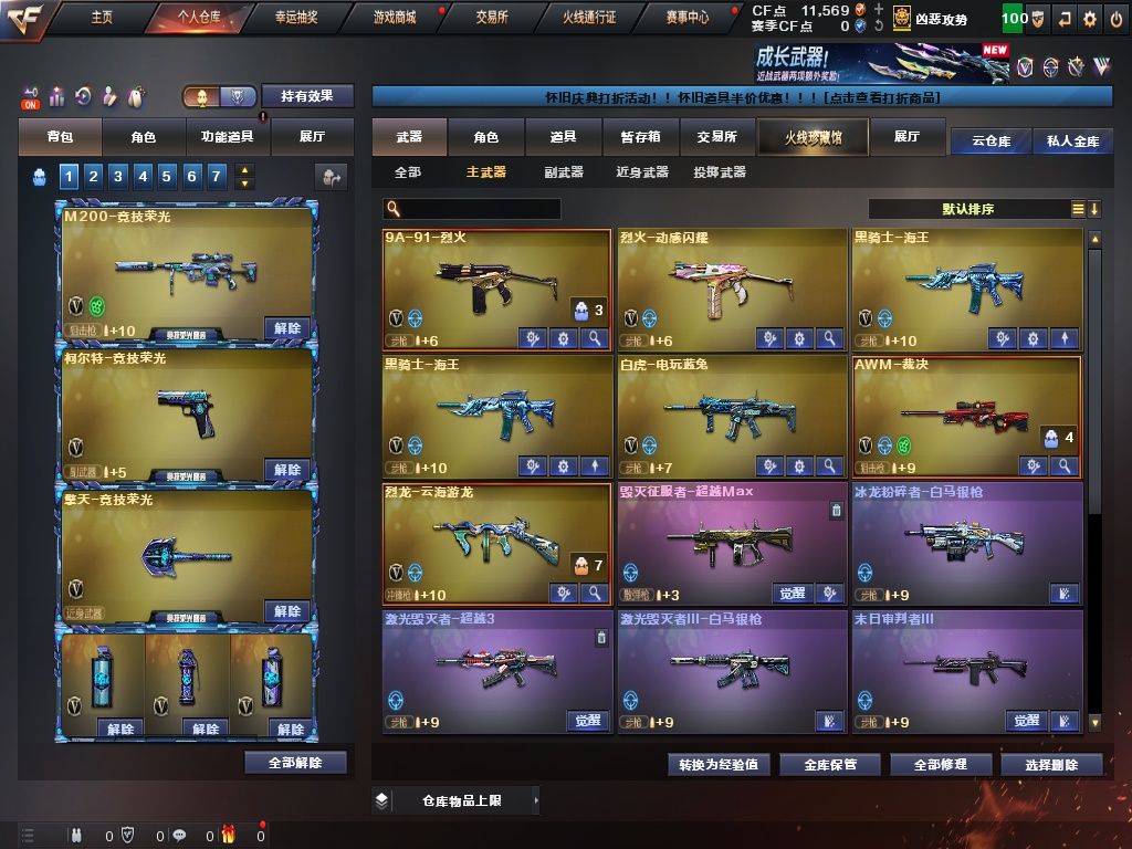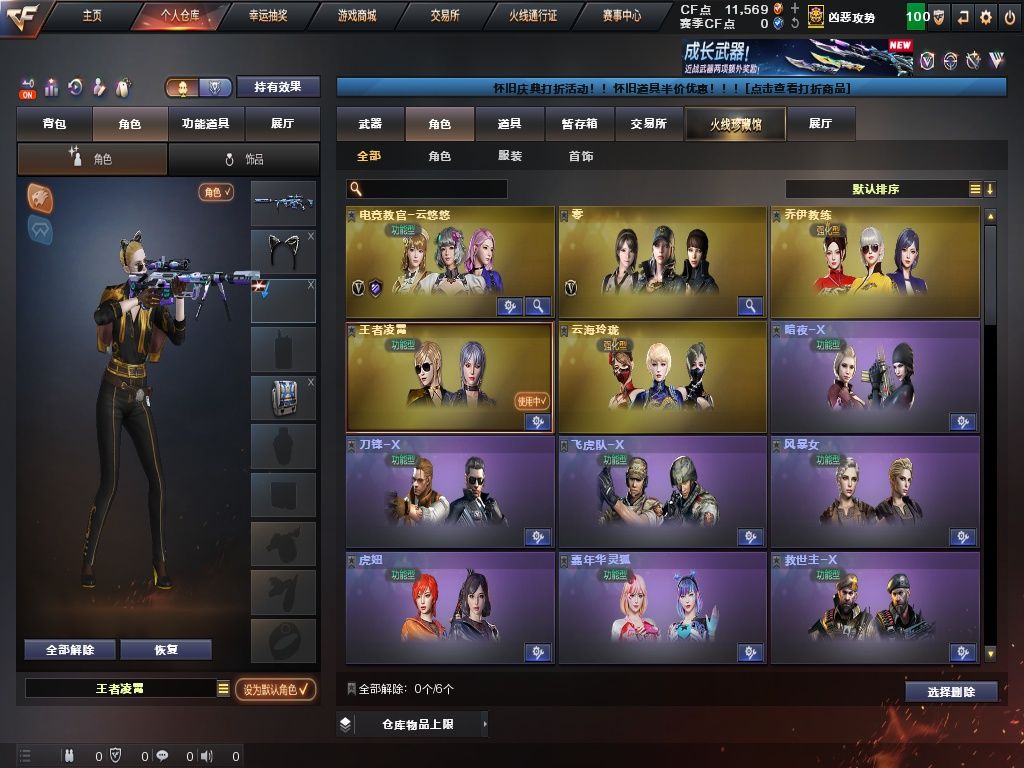 王者武器:王者之啸-觉醒版;王者之击-觉醒版 英雄武器:烈龙-云海游龙;擎天-云海游龙;手雷-云海游龙;龙啸-烈火龙威;屠龙-动感闪耀;手雷-动感闪耀;烈火-动感闪耀;天神-动感闪耀;无影-神兵利器;AK47-火麒麟;白虎-电玩蓝兔;QBZ03-金色蔷薇;麒麟刺;高爆手雷-竞技荣光;闪光弹-竞技荣光;烟雾弹-竞技荣光;USP-雷暴;擎天-竞技荣光;M200-竞技荣光;柯尔特-竞技荣光;AWM-裁决;9A91-烈火;HK417-朱雀;烟雾弹-幻灵;高爆手雷-幻灵;闪光弹-幻灵;AK47-B-常胜将军;AK47-B-战士;AK47-B-身先士卒;黑骑士-海王;M4A1-雷神;屠龙;擎天;龙啸;沙鹰-天神;沙鹰-修罗;Barrett-毁灭;M4A1-黑龙 角色:零;电竞教官-云悠悠;复仇者;堕天使;精英部队;灵狐者-黄金海岸;救世主-X;暗夜-X;娟娟;夜玫瑰-X;邱刚敖;圣诞潘多拉-X;虎妞;代号:翼;王者凌霄;社长刀锋;兔囡囡;风暴女;嘉年华灵狐 道具:防化服;C4工具钳;手雷包;防弹衣;防弹头盔;绿色巨人;灵魂忍者;迷雾幽灵;疯狂宝贝;迷雾幽灵;天使光环;特殊水壶-海滩派对;生化弹匣;