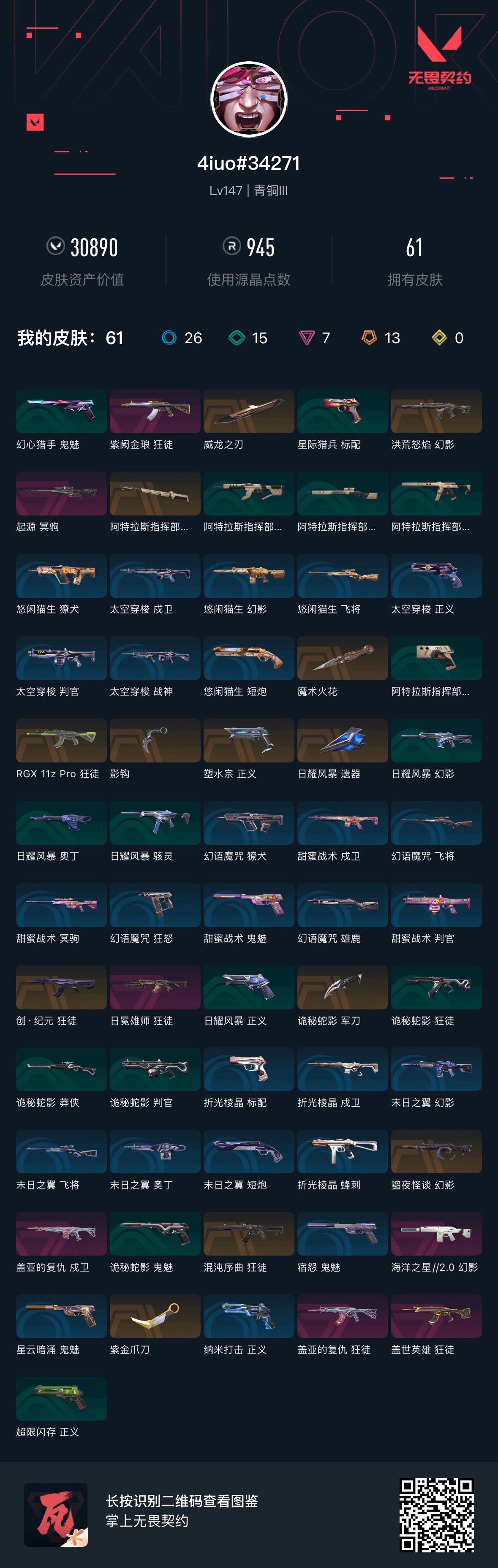 可排位 英雄28 武器皮肤数量61;紫金爪刀,威龙之刃,盖亚的复仇 狂徒,洪荒怒焰 幻影,紫阙金琅 狂徒,RGX 11z Pro 狂徒,混沌序曲 狂徒,