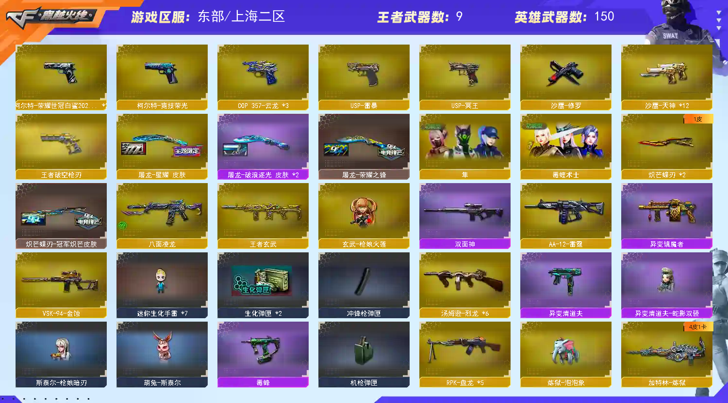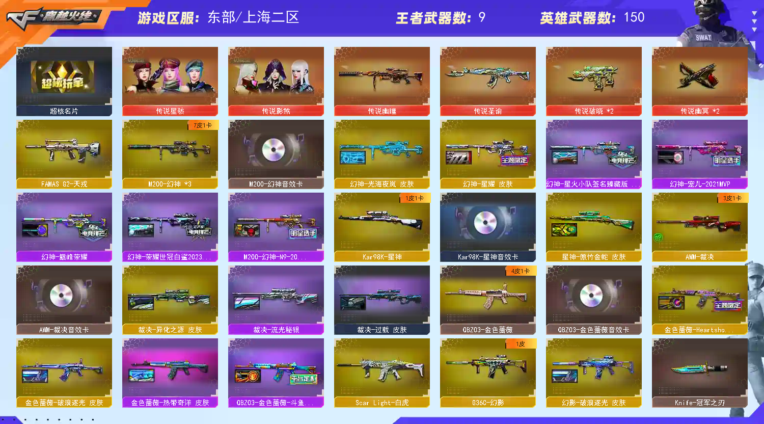 传说影杀 传说星瞳 隼 传说幽瞳 传说圣谕 M200-幻神音效卡 Kar98K-星神音效卡 AWM-裁决 Scar Light-白虎 G36C-幻影 FAMAS G2-天戎 异变清道夫-蛇 斯泰尔-枪娘暗刃 萌兔-斯泰尔 毒蜂 炼狱-泡泡象 VSK-94-金蚀 QBZ191-银翼游侠 MAC-10-龙宝;USP-雷暴,柯尔特-荣耀世冠白鲨2023,传说幽冥,炽芒蝶刃,Knife-冠军之刃,传说影煞,传说星骇,