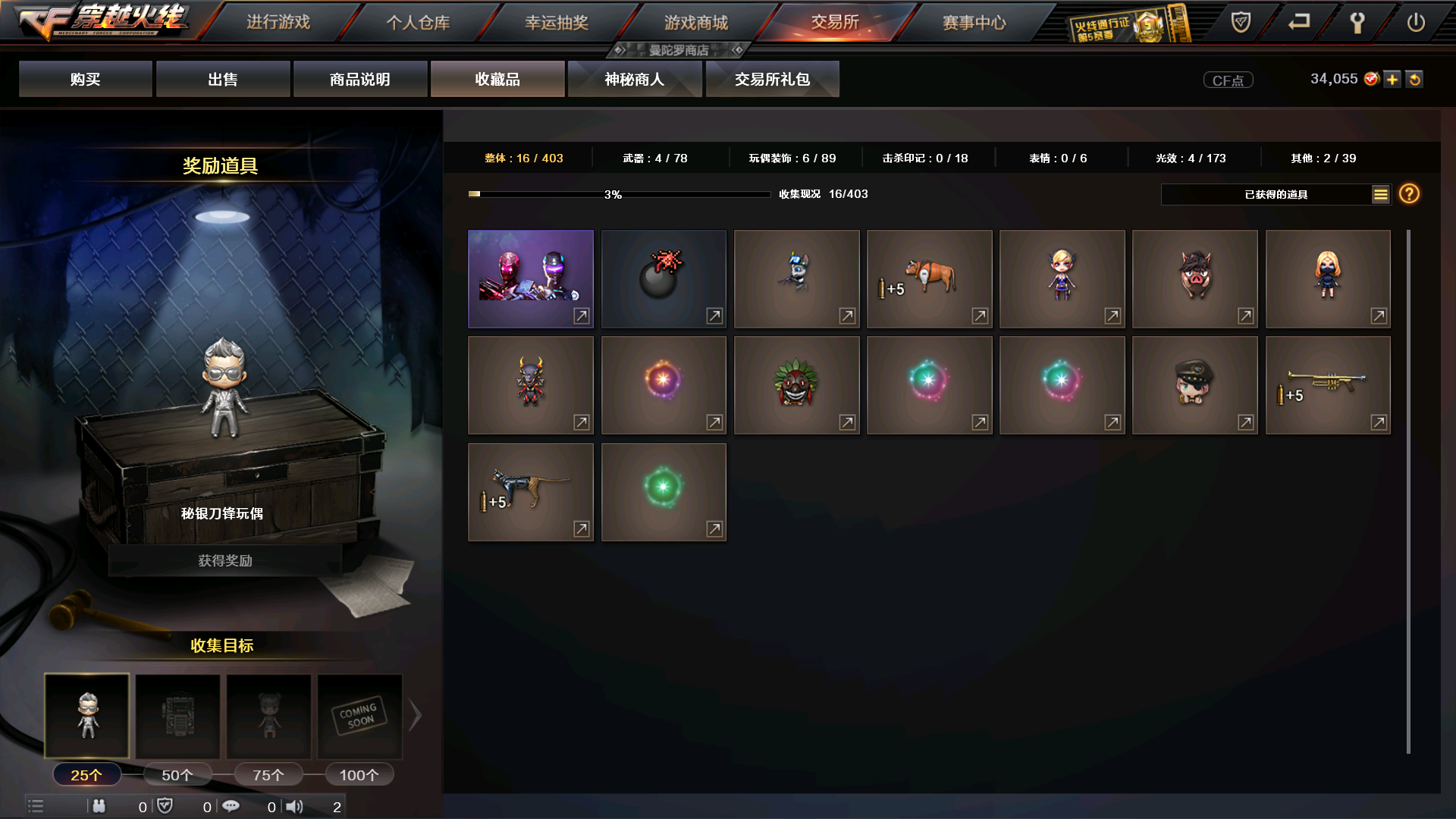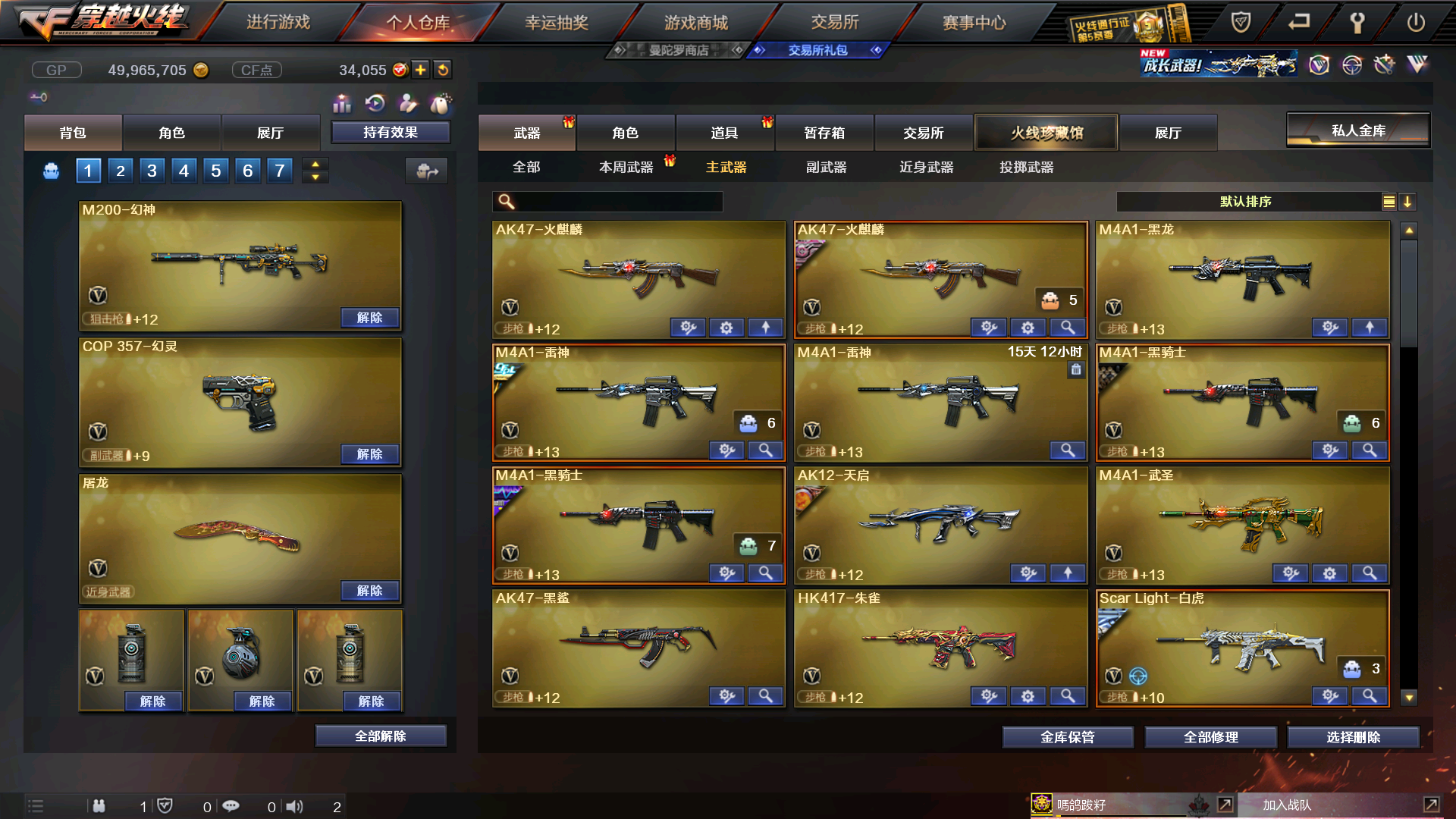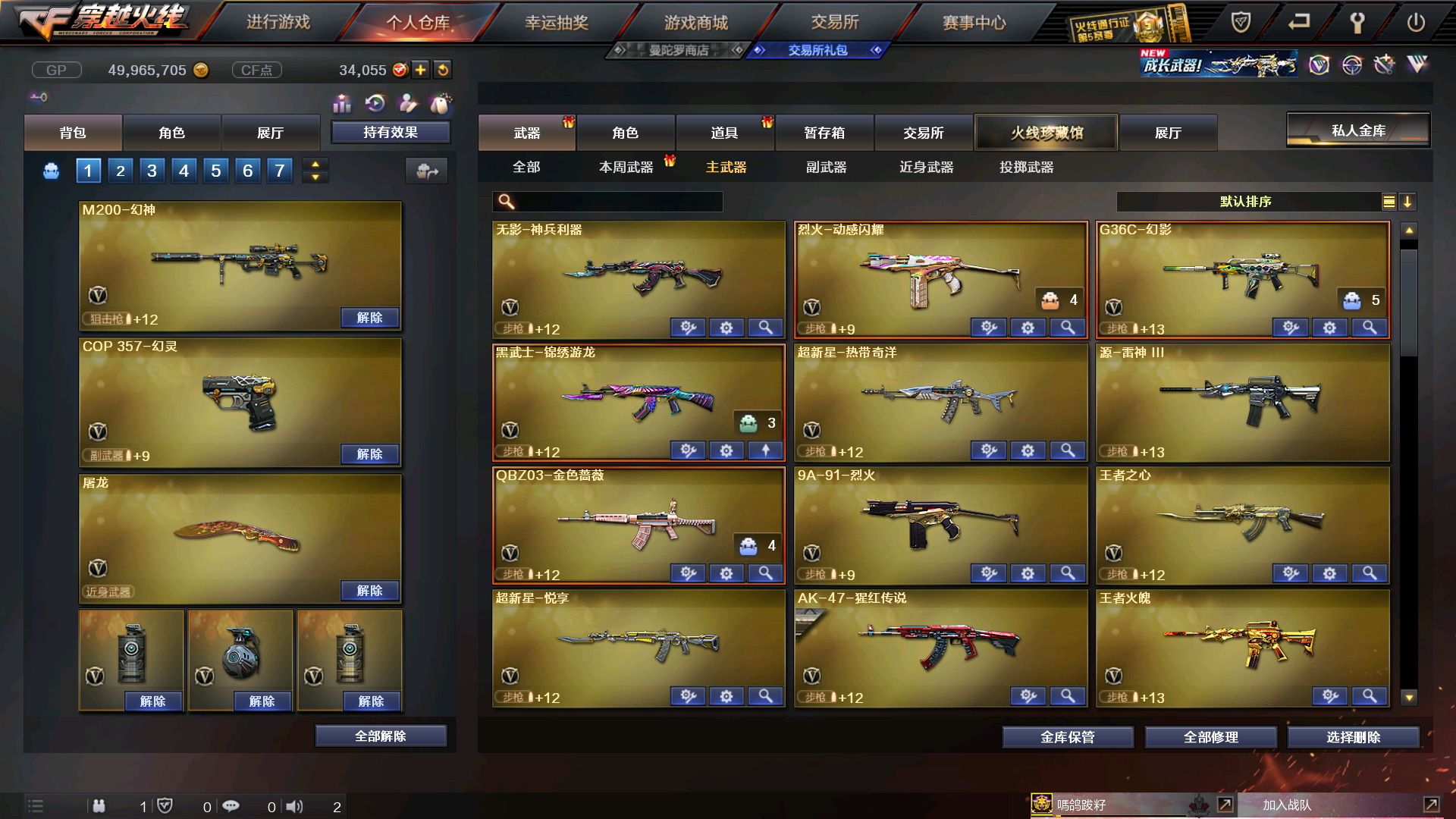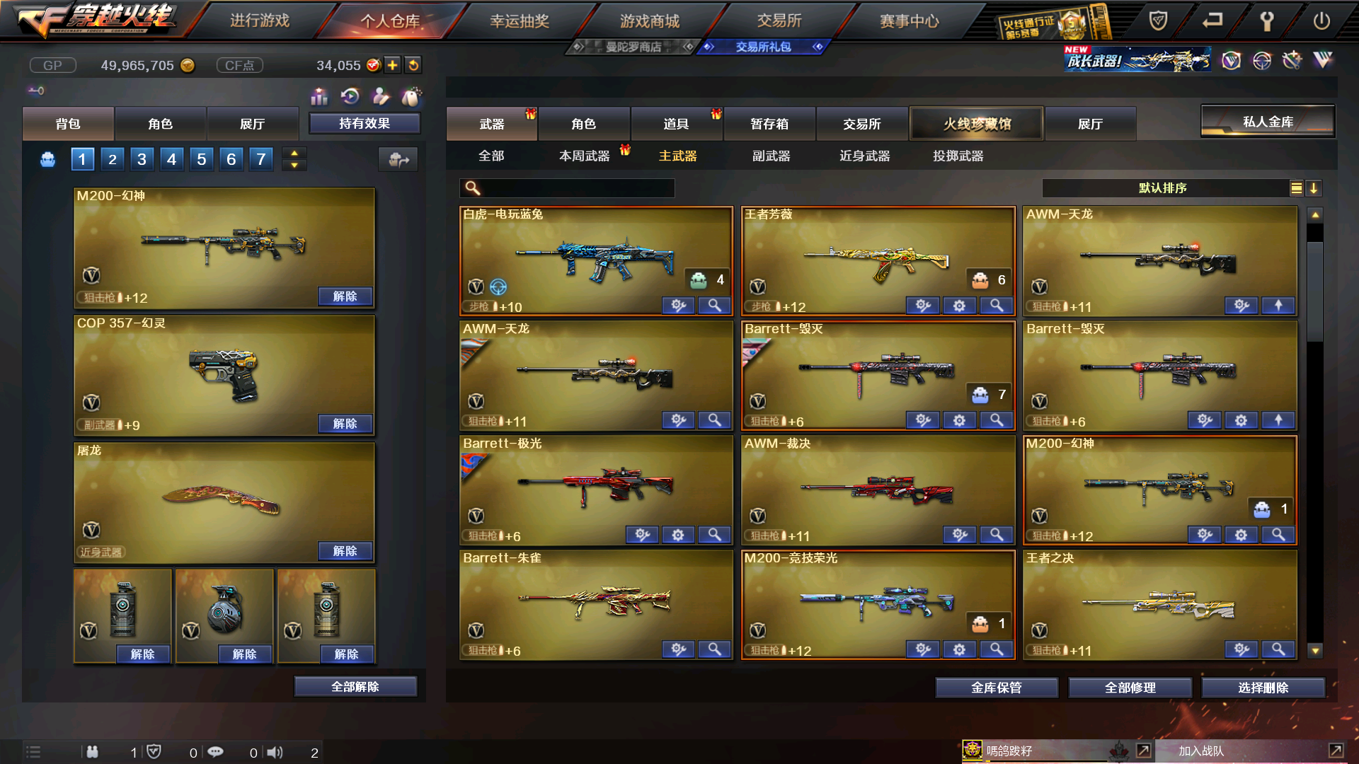 主武器 M200-幻神 x 1 / Scar Light-白虎 x 1 / AK-47-B x 1 / AK47-火麒麟 x 2 / M4A1-雷神 x 2 / M4A1-黑龙 x 1 / M4A1-黑骑士 x 2 / Barrett-毁灭 x 2 / Barrett-极光 x 1 / 破天狂龙 x 1 / AWM-天龙 x 2 / RPK-盘龙 x 1 / 汤姆逊-烈龙 x 2 / TRG-21-白羊座 x 1 / M240B-苍雷 x 1 / M37-恶棍 x 2 / SL-处女座 x 1 / 贝雷塔687-射手座 x 1 / AK12-天启 x 1 / M4A1-樱 x 1 / M4A1-武圣 x 1 / 加特林-炼狱 x 2 / 神罚 x 1 / AK-47-A x 1 / 死亡之眼 x 1 / M4A1-电音 x 1 / 金色小号 x 1 / 炫金天龙 x 1 / 9A91-烈火 x 1 / 金色小号 x 1 / AWM-裁决 x 1 / QBZ03-金色蔷薇 x 1 / 超新星-悦享-觉醒版 x 1 / 王者火魄-觉醒版 x 1 / 王者芳薇-觉醒版 x 1 / AA-12-雷霆 x 1 / G36C-幻影 x 1 / AK47-黑鲨 x 1 / 烈龙-云海游龙 x 1 / 王者之决-觉醒版 x 1 / 火麒麟-绝迹 x 1 / 王者之心-觉醒版 x 1 / Barrett-朱雀 x 1 / AK-47-猩红传说 x 1 / M200-大黄蜂 x 1 / HK417-朱雀 x 1 / 黑武士-锦绣游龙 x 1 / 烈火-动感闪耀 x 1 / 王者星神-觉醒版 x 1 / 白虎-电玩蓝兔 x 1 / M200-竞技荣光 x 1 / 无影-神兵利器 x 1 副武器 Desert Eagle-A x 3 / 沙鹰-修罗 x 3 / Desert Eagle-S x 1 / 沙鹰-天神 x 1 / 胜利之火 x 1 / Glock18-武圣 x 1 / Cop357-赤龙 x 1 / 迷你手枪 x 1 / 沙鹰-青龙 x 1 / COP-旗袍 x 3 / USP-雷暴 x 1 / 王者之灵-觉醒版 x 1 / 柯尔特-卡通 x 1 / 天神-动感闪耀 x 1 / Colt1911-宇航兔兔 x 1 / Cop357-迷彩 x 4 / Colt 1911-大黄蜂 x 1 / COP 357-青龙 x 1 / 柯尔特-竞技荣光 x 1 / COP 357-幻灵 x 1 近身武器 黄金警棍 x 1 / 麒麟刺 x 2 / 龙啸 x 1 / 擎天 x 1 / 屠龙 x 3 / 破天斩魔剑 x 1 / 丛林匕首 x 1 / 斩神刀 x 1 / 龙鳞 x 2 / 冰火魔兽 x 1 / 冰火神拳 x 1 / 水晶宝珠 x 2 / 斩神刀 x 1 / 龙鳞 x 2 / 等离切割者 x 1 / 军用铁锹-飞龙在天 x 1 / 棒球棒-红色闪电 x 1 / 不灭之拳 x 1 / 黄金丛林匕首 x 1 / 利爪之锋 x 1 / 唐刀-大唐荣耀 x 1 / 啸天 x 1 / 镇魔锤 x 1 / 马来剑-夜魔 x 1 / 屠龙-动感闪耀 x 1 / 雷霆之锋 x 1 / 迷你牛牛 x 1 / 屠龙-云海游龙 x 1 / 擎天-云海游龙 x 1 投掷武器 胜利之光 x 1 / 激浪烟雾弹 x 4 / 绿色烟雾弹 x 3 / 生化手雷 x 2 / 蓝色烟雾弹 x 2 / 黄色烟雾弹 x 1 / 双生雷-恶棍 x 1 / 音乐手雷 x 1 / 高爆手雷-雷霆 x 4 / 闪光弹-雷霆 x 4 / 烟雾弹-雷霆 x 4 / 疾爆烟雾弹 x 1 / 闪光弹-掌火 x 1 / 闪光弹-幻灵 x 3 / 高爆手雷-幻灵 x 3 / 闪光弹-竞技荣光 x 4 / 烟雾弹-竞技荣光 x 2 / 手雷-云海游龙 x 1 / 高爆手雷-夜魔 x 1 / 高爆手雷-竞技荣光 x 2 / 烟雾弹-幻灵 x 3 / 闪光弹-夜魔 x 1 / 手雷-动感闪耀 x 1 / 烟雾弹-夜魔 x 1 道具 灵魂忍者 x 1 / 迷雾幽灵 x 1 / 金蛇戒 x 1 / 银蛇戒 x 1 / 防弹头盔 x 3 / 烟雾保护头盔 x 2 / 防弹衣 x 2 / C4工具钳 x 1 / 手雷包 x 2 / 步枪弹匣 x 1 / 生化弹匣 x 1 / 防化服 x 1 / 疯狂宝贝 x 1 / 炫彩背包 x 1 / 闪光护目镜 x 2 / 变异宝贝 x 1 / M4A1-雷神音效卡 x 1 / AK47-火麒麟音效卡 x 1 / 超级背包 x 2 / 猫耳头盔 x 1 / 夺命之镰 x 1 / 超级护目镜 x 1 / 战神-紫绶金章皮肤 x 1 / 炼狱-玩具枪皮肤 x 1 / 火麒麟-平天大圣 x 1 / 天龙-秘银 x 1 / 雷神-冠军之魄 x 1 / 黑骑士-摸金校尉 x 1 / 无影-能量核心 x 1 / M200-幻神-黄忠皮肤 x 1 / 雷神-机甲刑天皮肤 x 1 / 修罗-能量核心 x 1 / 雷神-宇航兔皮肤 x 1 / 毁灭-墨兰皮肤 x 1 / QBZ03-金色蔷薇音效卡 x 1 / M4A1-黑龙音效卡 x 1 / Scar Light-白虎音效卡 x 1 / 天龙-能量核心 x 1 / 黑骑士-冠军之势 x 1 / M4A1-黑骑士音效卡 x 1 / 黑龙-能量核心 x 3 / 死神-秘银 x 2 / 毁灭-暗月 x 3 / 极光-能量核心 x 1 / 毁灭耀金皮肤 x 1 / 天启-暗月 x 1 / 火麒麟-心动糖果 x 1 / M200-幻神音效卡 x 1 / 雷神-能量核心 x 2 / Barrett-毁灭音效卡 x 1;USP-雷暴,电竞教官-云悠悠,RPK-盘龙,QBZ03-金色蔷薇,G36C-幻影,M200-幻神,Scar Light-白虎,