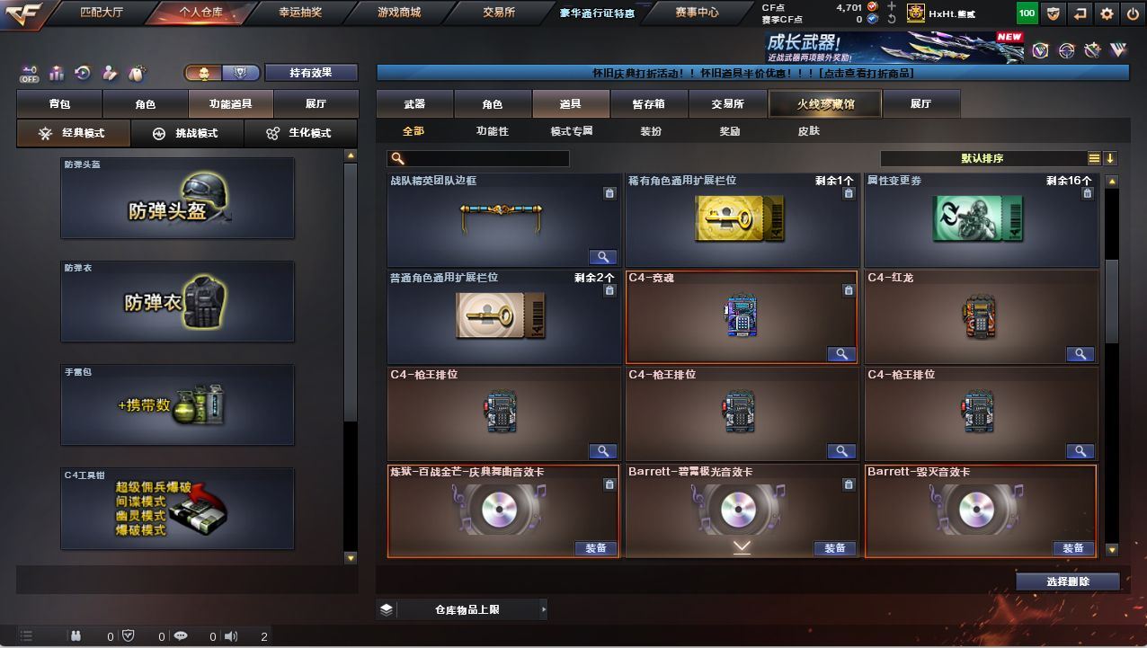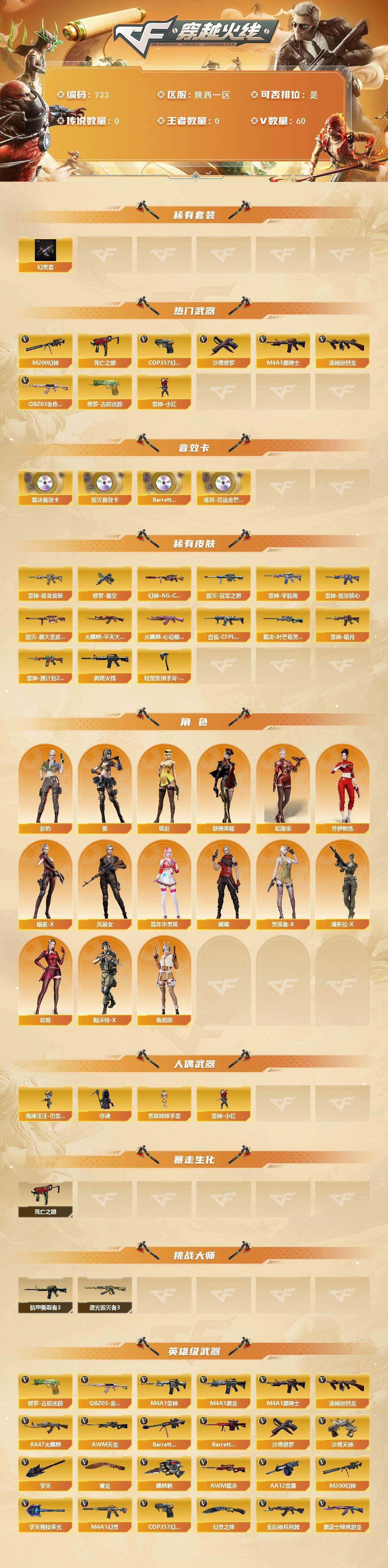 M200-幻神+幻神-AG-CFPLS17冠军皮肤,QBZ03-金色蔷薇,修罗-古蛇迷踪,死亡之眼*2,M4A1-黑骑士,汤姆逊-烈龙*3,雷神-小红,COP 357-幻灵*2,沙鹰-修罗【稀有套装】:幻灵套【音效卡】:Barrett-毁灭音效卡,AWM-裁决音效卡,Barrett-碧霄极光音效卡,炼狱-百战金芒-庆典舞曲音效卡【皮肤】:白虎-白鲨-CFPLS23冠军,裁决-叶芒苍灵 皮肤,雷神-暗月,雷神-能量核心,雷神-耀金皮肤,雷神-宇航兔皮肤,雷神-源计划2.0专属 皮肤,M4A1-再燃火线,火麒麟-平天大圣,火麒麟-心动糖果,毁灭-冠军之怒,毁灭-黑大圣皮肤,修罗-星空,轻型军用手斧-再燃火线【角色】:葵,影豹,狐影,蛇隐宗,乔伊教练,暗夜-X,风暴女*2,嘉年华灵狐,娟娟,灵狐者-X,潘多拉-X,蛇姬,斯沃特-X,铁骑荣耀,兔囡囡【人偶武器】:雷神-小红,海滩汪汪-巴雷特,夺魂,灵狐娃娃手雷【暴走生化】:死亡之眼*2【挑战大师】:激光毁灭者III,机甲撕裂者III*2【英雄级武器】:AK47-火麒麟,M4A1-黑龙,M4A1-雷神*2,M4A1-黑骑士,M4A1-幻灵,无影-神兵利器,黑武士-锦绣游龙,QBZ03-金色蔷薇,AK-47-猩红传说,AWM-天龙,Barrett-毁灭,Barrett-极光,AWM-裁决,M200-幻神,炼狱-百战金芒,汤姆逊-烈龙*3,AA-12-雷霆,沙鹰-修罗,沙鹰-天神,COP 357-幻灵*2,修罗-古蛇迷踪,屠龙*2,擎天*3,麒麟刺,幻灵之锋,擎天-竞技荣光,麒麟刺-百战金芒,高爆手雷-幻灵*7,高爆手雷-古蛇迷踪,闪光弹-幻灵*7,烟雾弹-幻灵*7,烟雾弹-古蛇迷踪,M4A1-赤狱骑士,Barrett-碧霄极光【道具】:BS战队炫彩背包,云山科技背包,古蛇迷踪炫彩背包,炫彩背包,百战金芒炫彩背包,超级背包*2,女皇终结者-魔龙之吻,救世主-黑桃战神,黄金生化钩,绿色巨人,灵魂忍者,迷雾幽灵,夺命之镰,防化服*3,金色流光-枪王排位*2,星辰流光-枪王排位,巅峰赛先锋-金色流光,流光-鎏金之域,枪王排位28赛季金色流光,枪王排位29赛季金色流光,语音特效-盛典烟火,萌萌小葵表情,动感闪耀表情,C4-红龙,防弹头盔*5,防弹衣*5,C4工具钳*5,手雷包*5;QBZ03-金色蔷薇,M200-幻神,